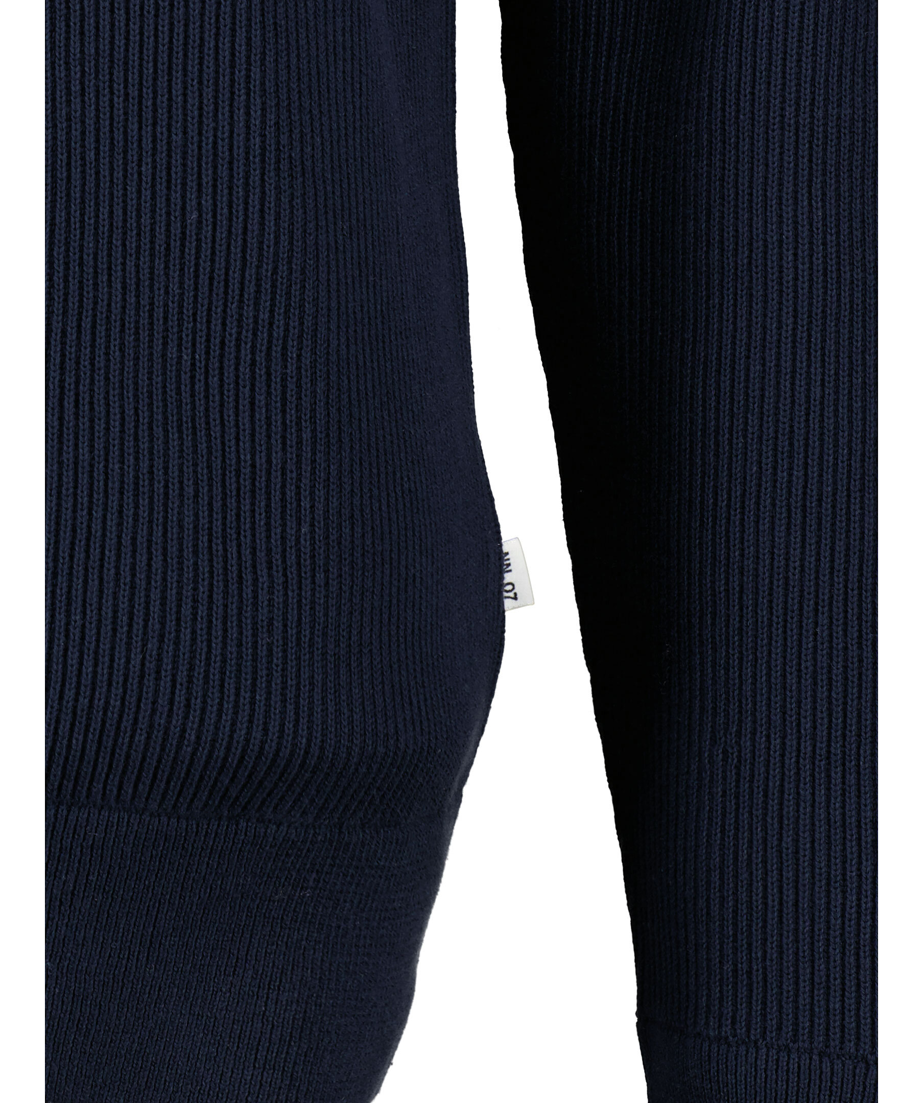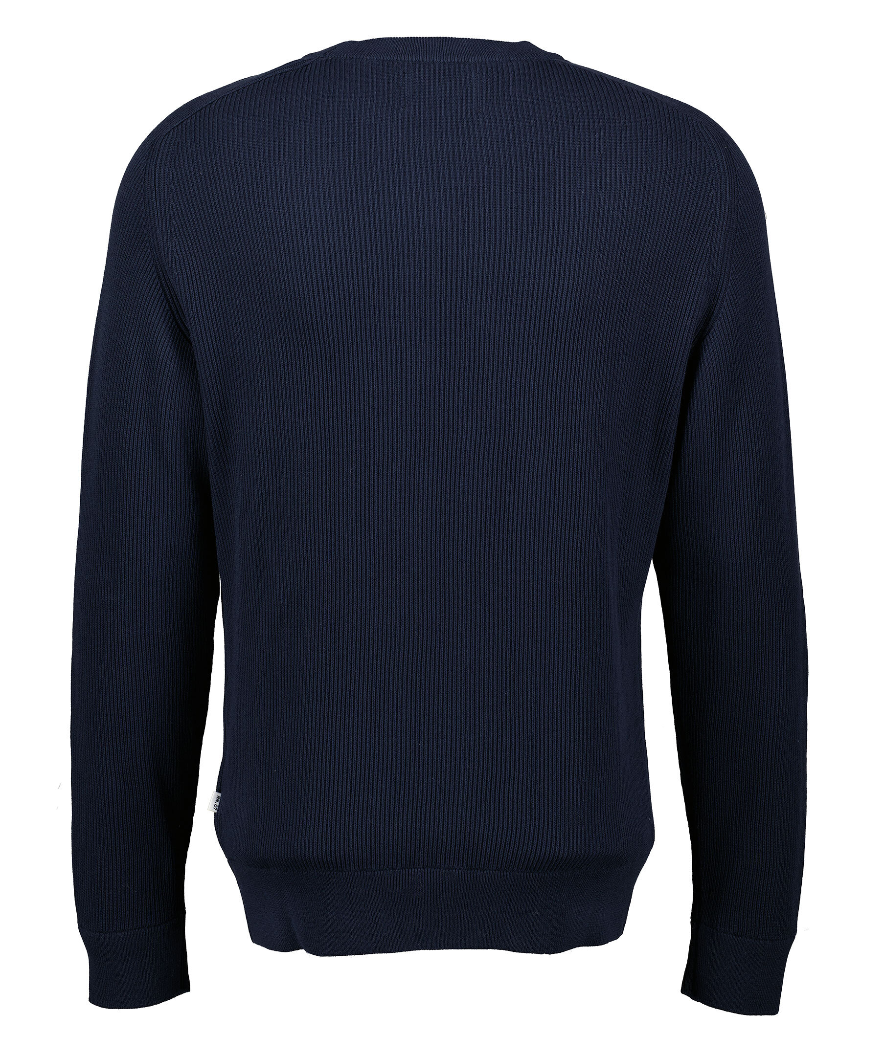 Marinblå ribbstickad tröja från NN 07. Muddar vid kragen, ärm och plaggslut. Tillverkad i 100% Bomull. Rundad halsringning.