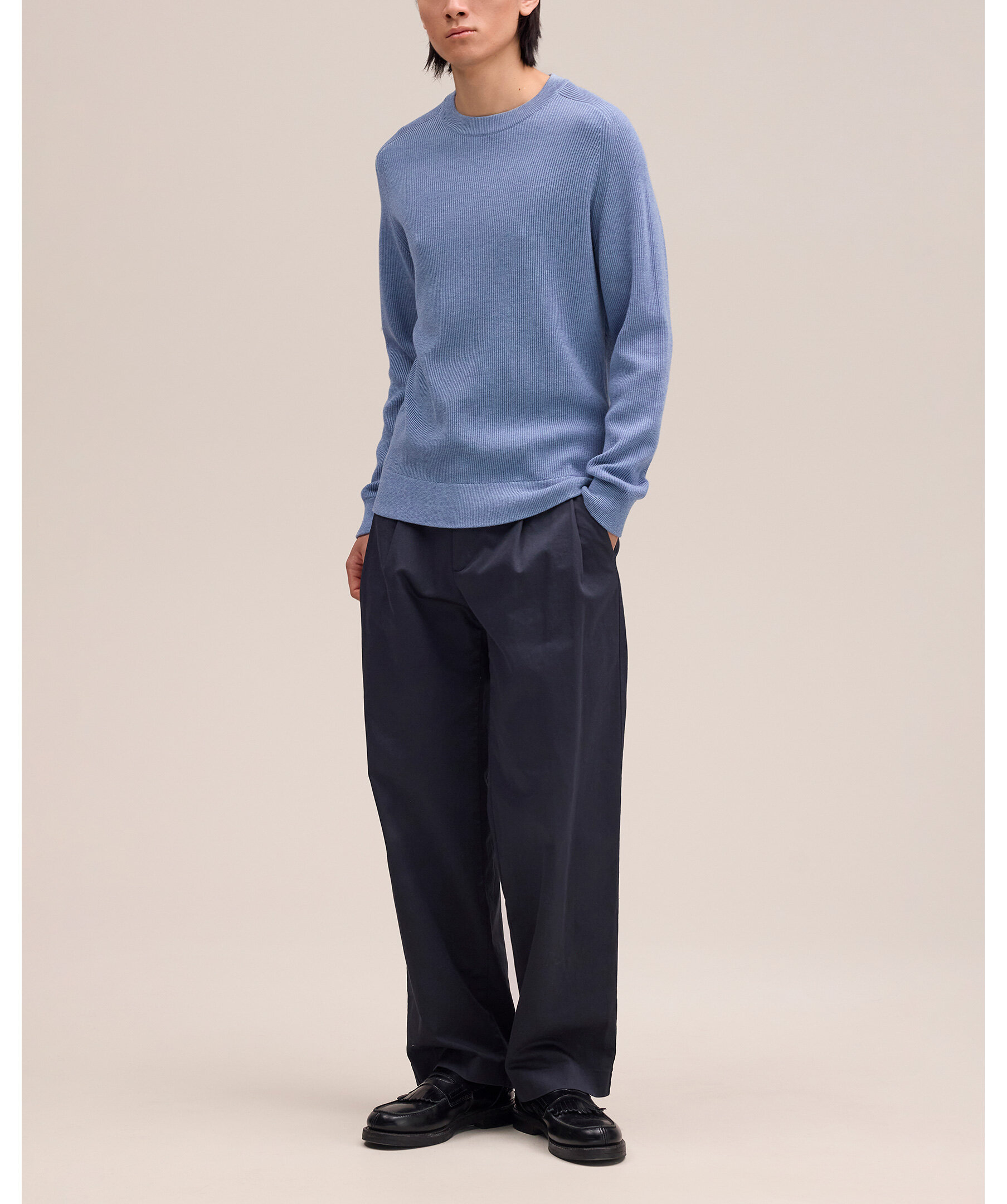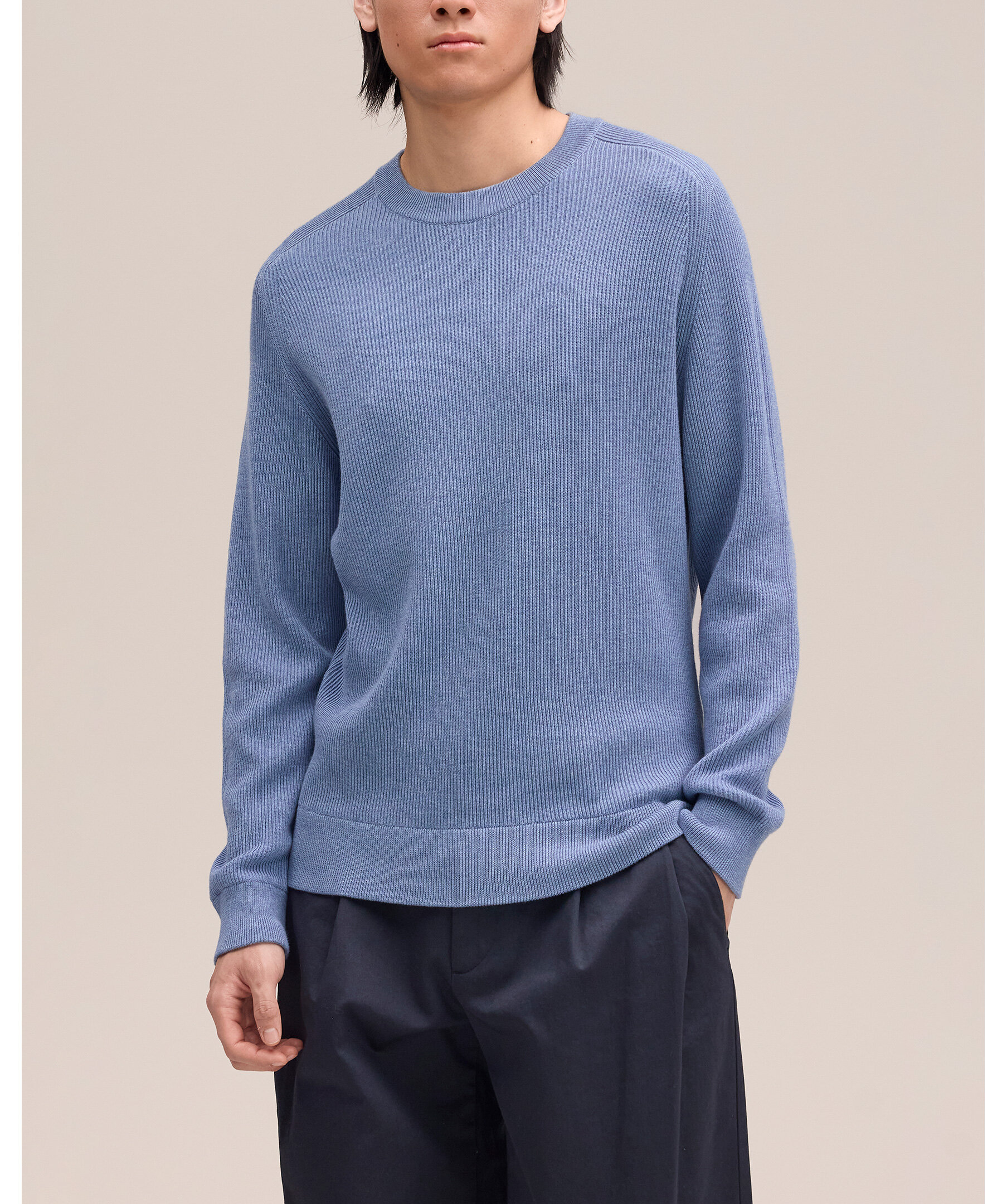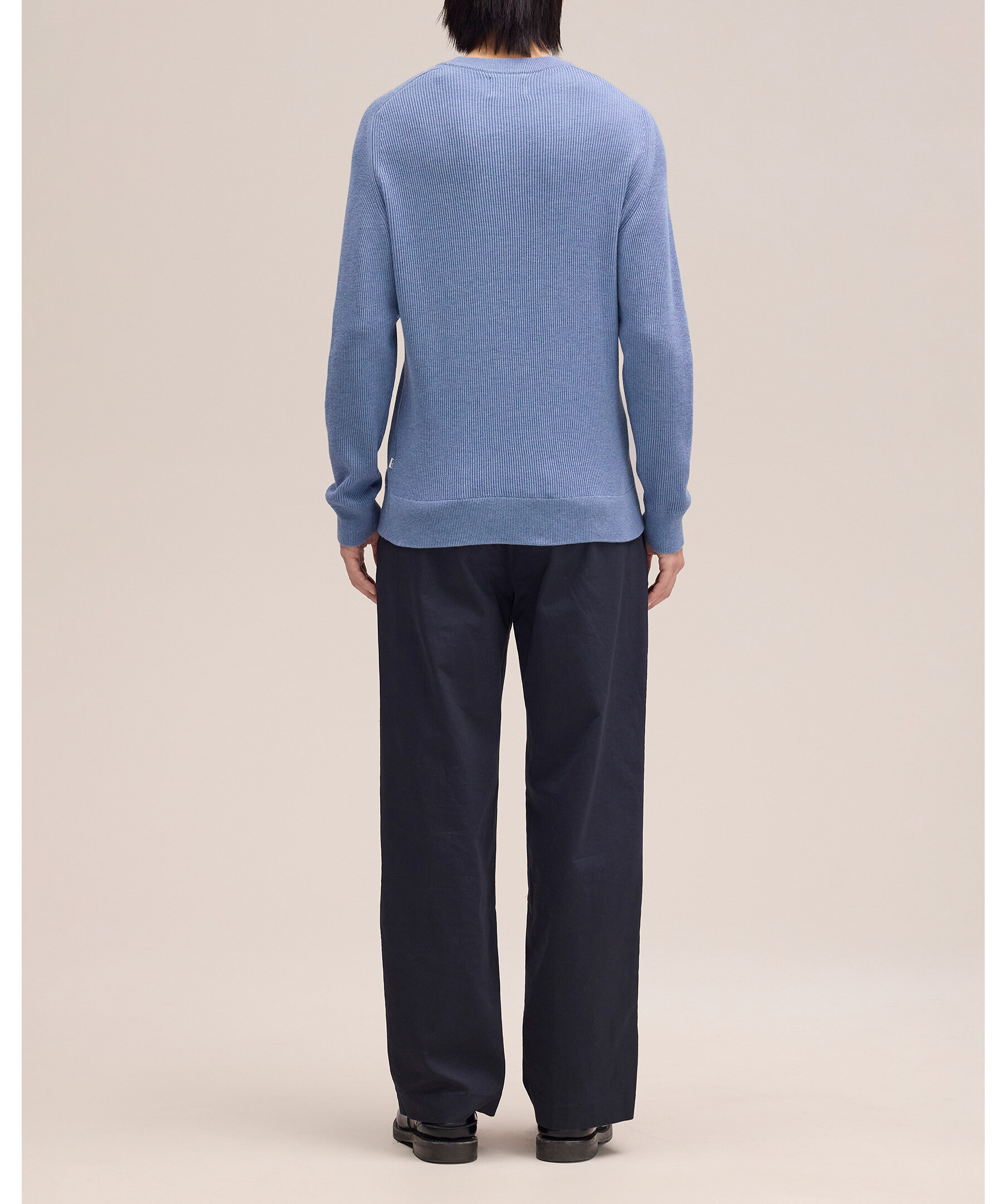 Blå tröja från NN07 i mjuk 100 % ekologisk bomull med ribbstickad struktur och klassiska sadelärmar. En lätt och bekväm crew‑neck‑stickad tröja som fungerar perfekt som baslager eller ensam plagg i vardags‑ och casual outfits