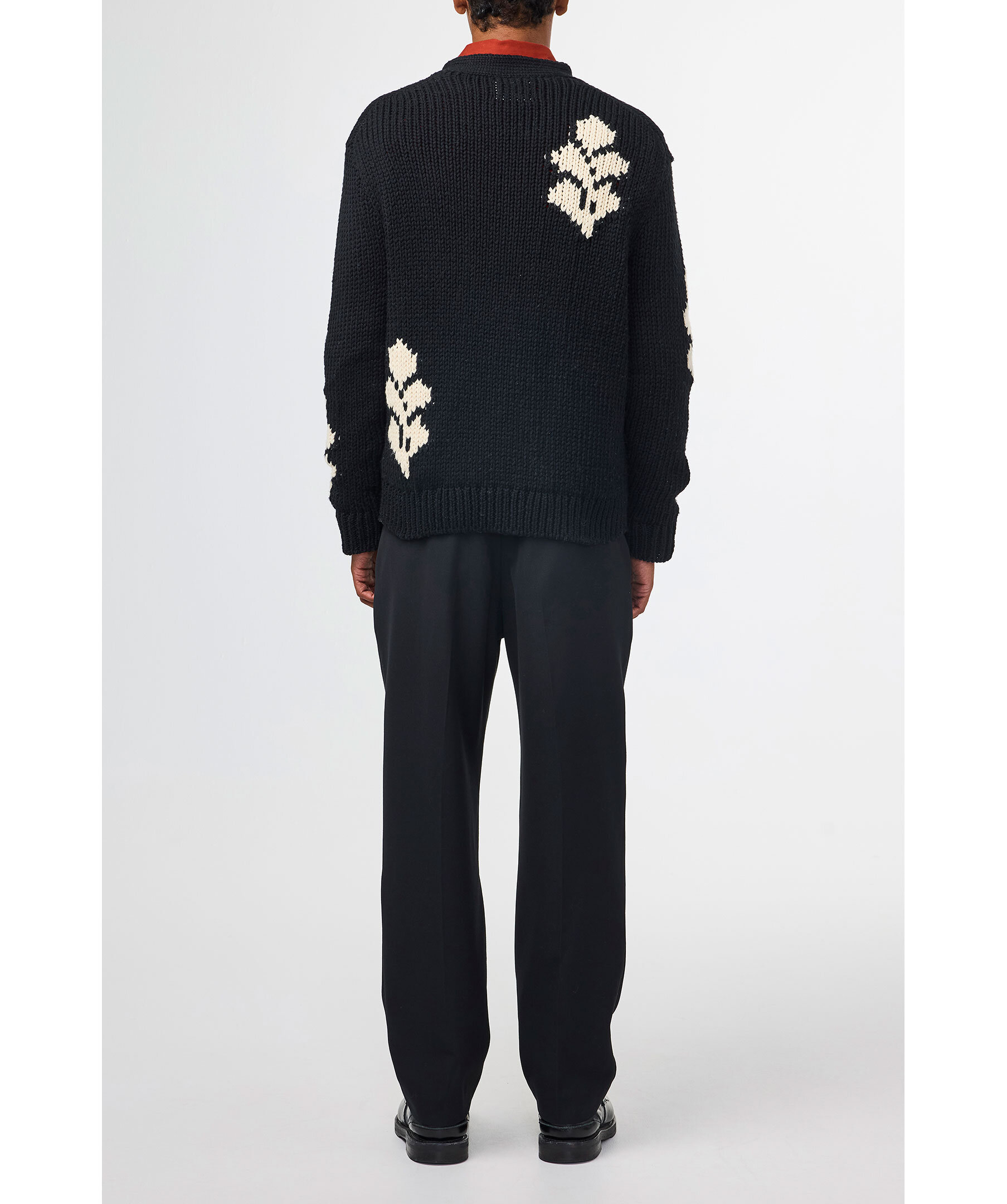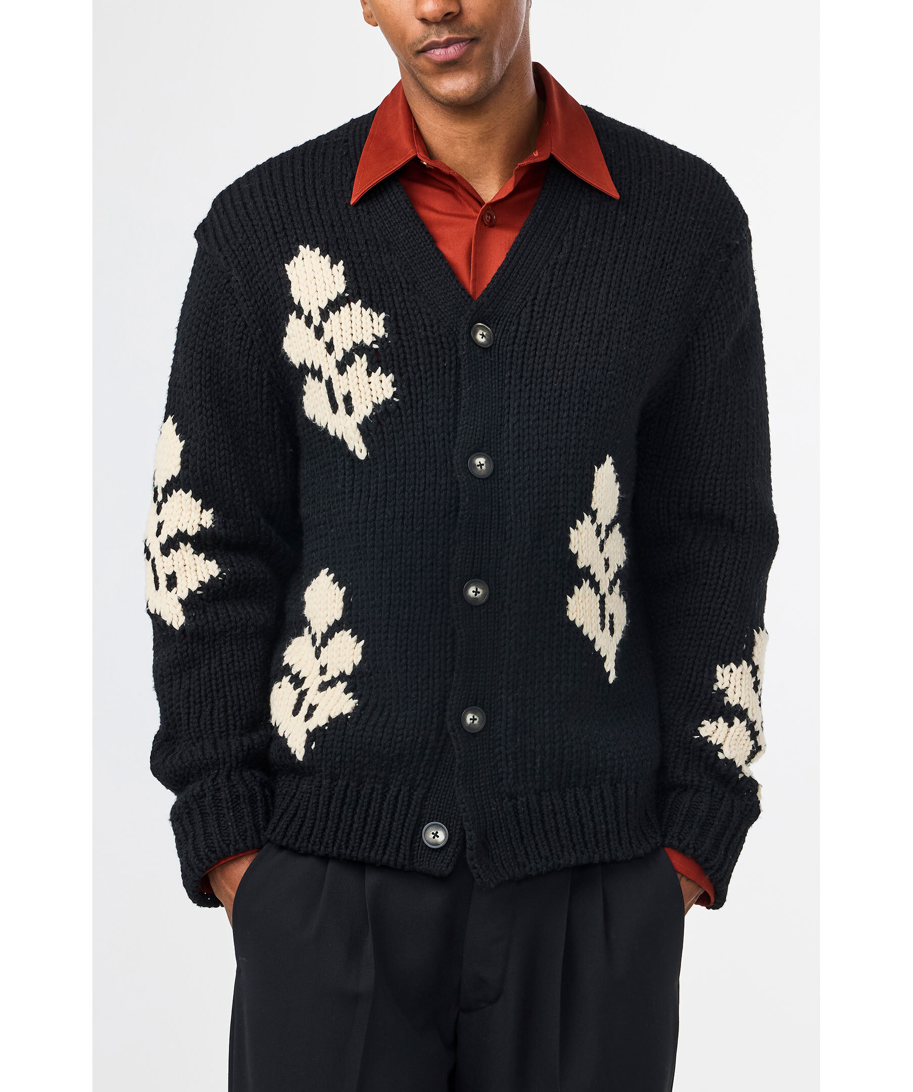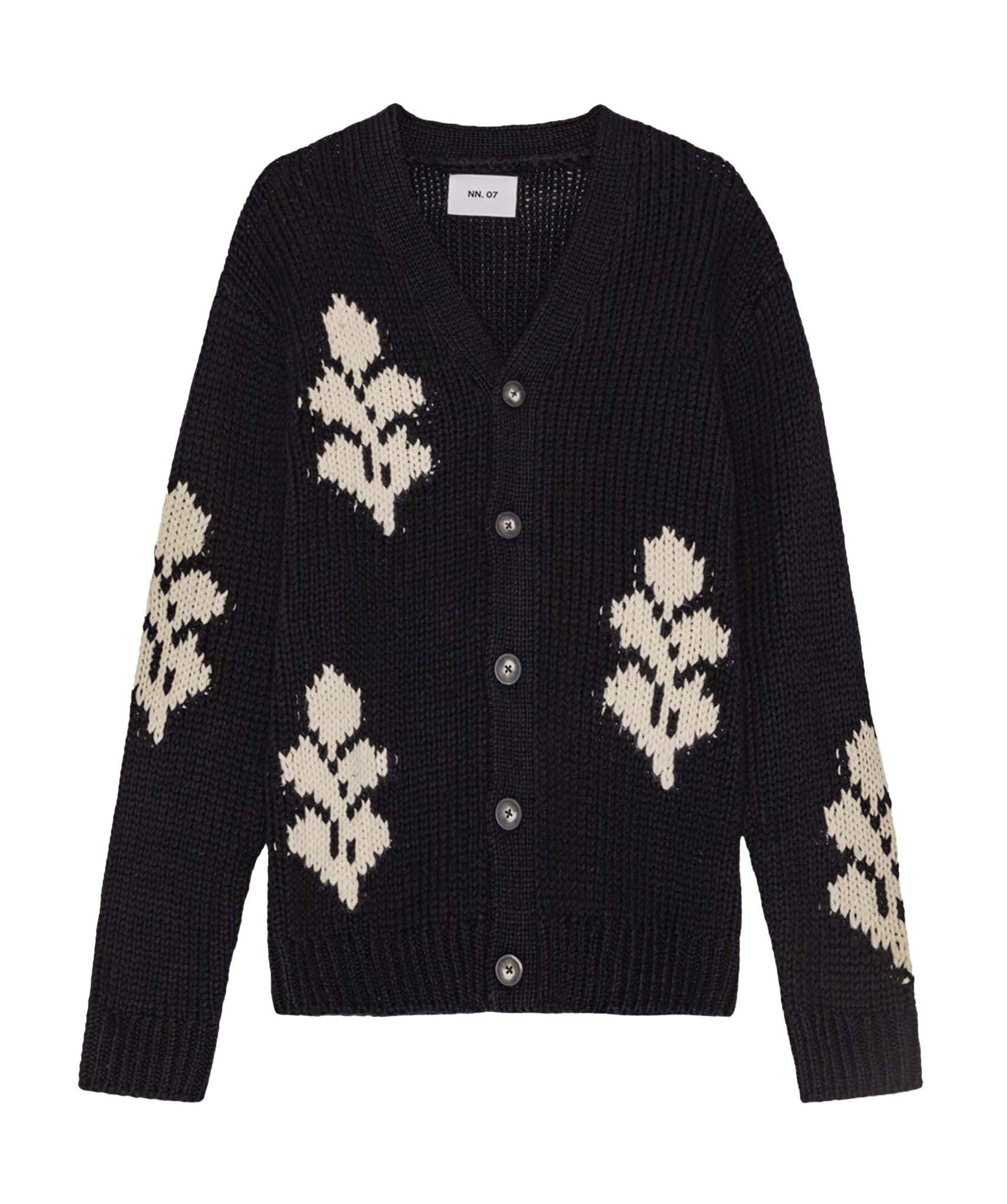 Svart och vit mönstrad rätstickad cardigan från NN 07. Stängs framtill med knappar. Ribbstickade ärm- och plaggslut. Tillverkad i återvunnet material. Avslappnad passform.