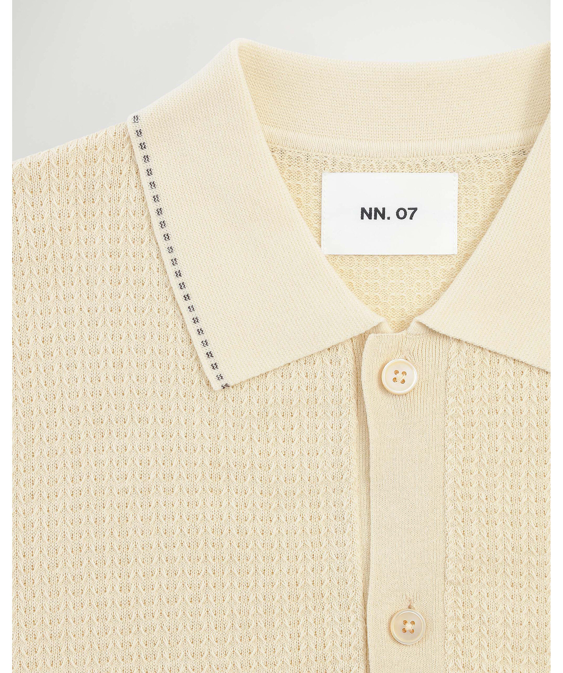 Cremévit polo tillverkad med skarpa, strukturerade sömmar och kontrasterande detaljer. Avslutad med enkla Corozo-knappar på en ren knappslå för en elegant och avslappnad look.