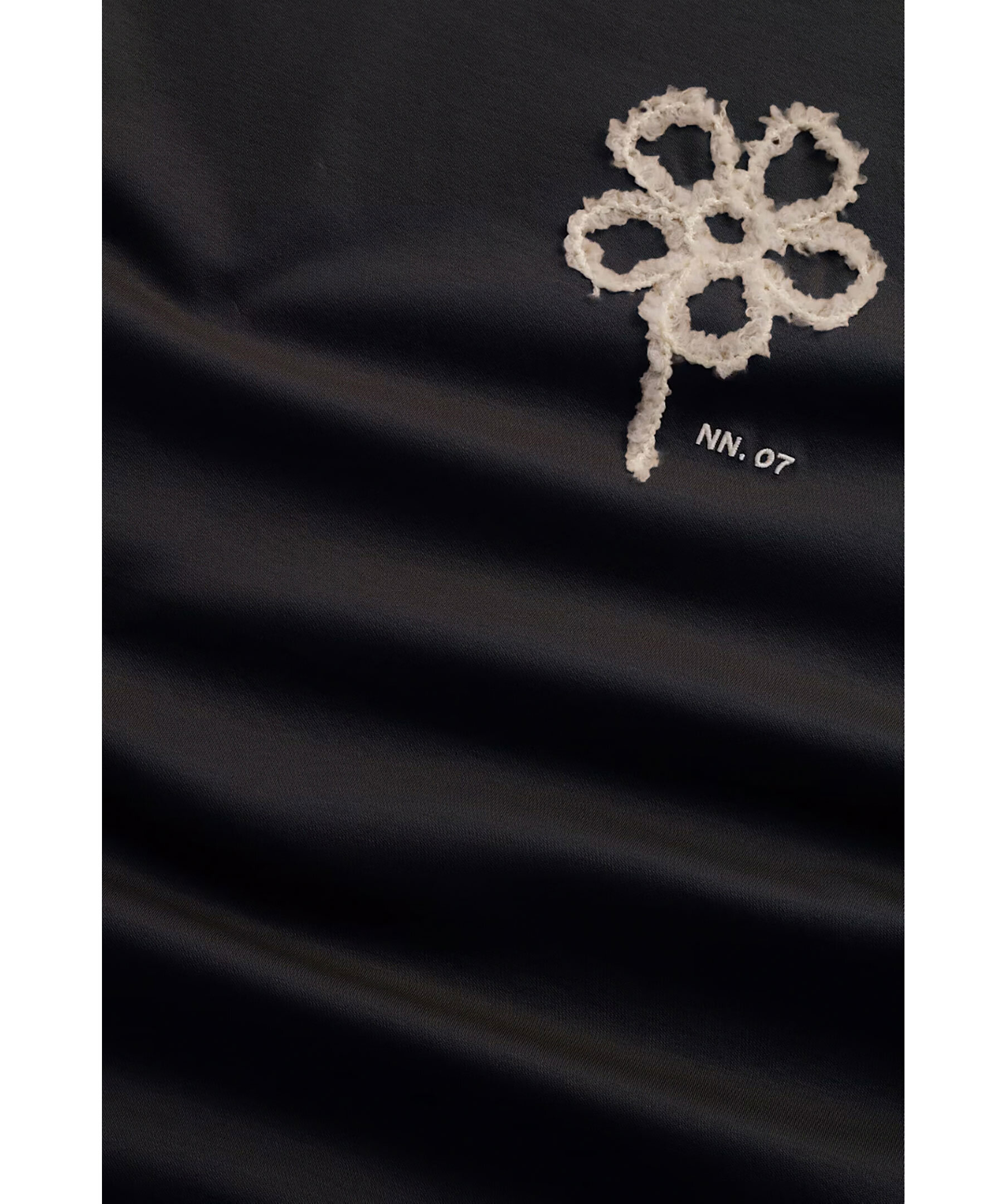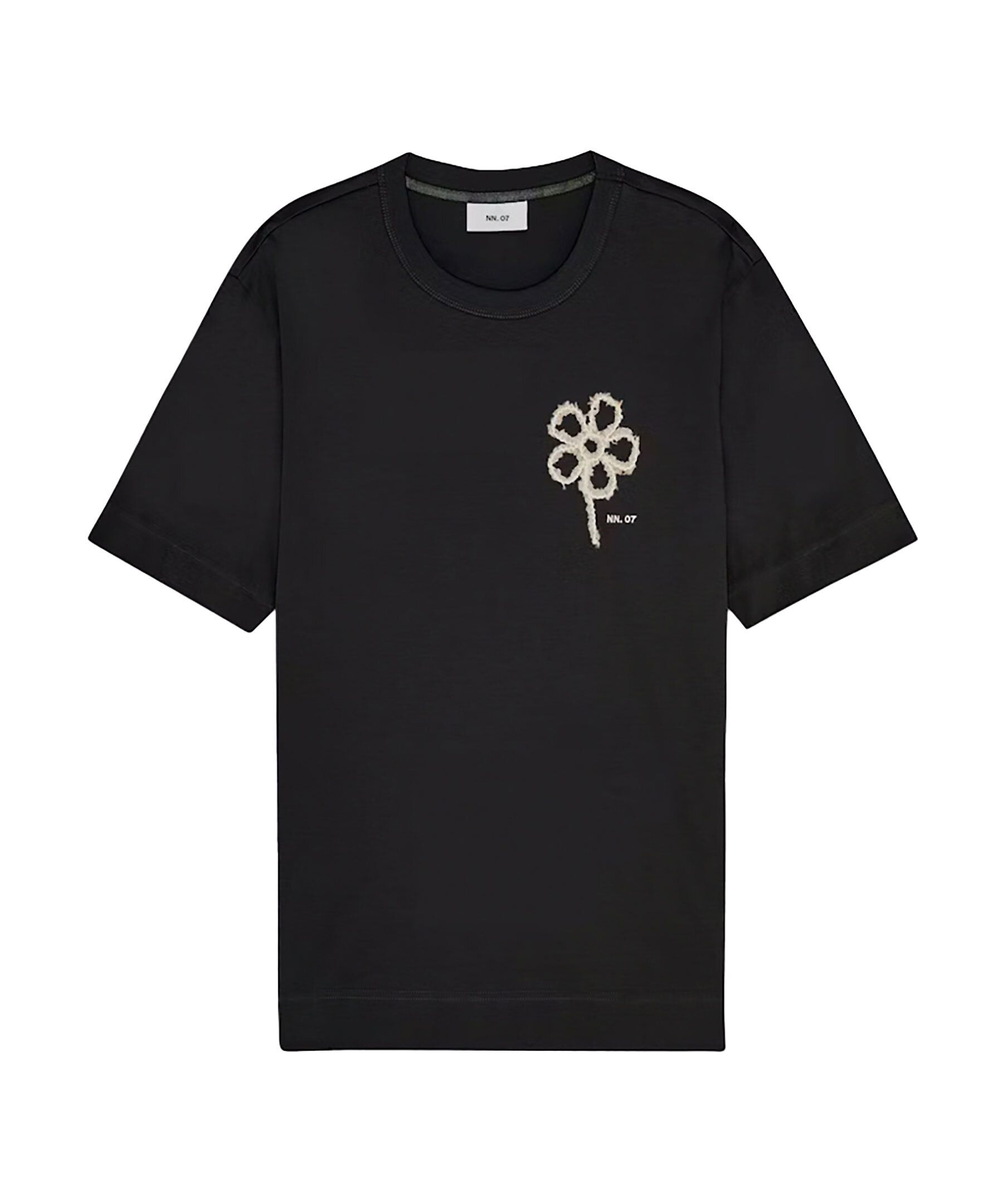 Svart t-shirt från NN 07. T-shirten har rundad halsringning och en broderad blomma samt logotyp på bröstet. Tillverkad i en merceriserad ekologisk bomullsjersey.