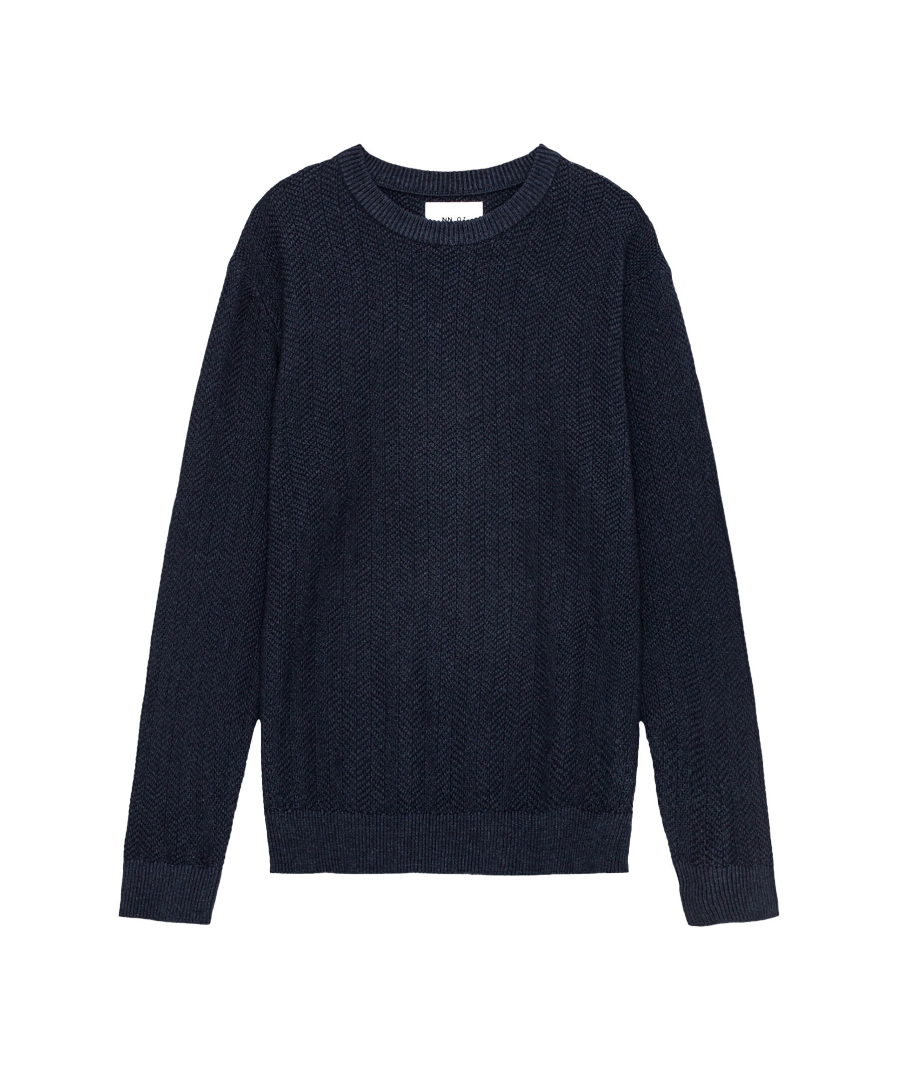 Marinblå fiskbensmönstrad sweatshirt från NN.007. Rund halsringning och gjord i ekologisk bomull.