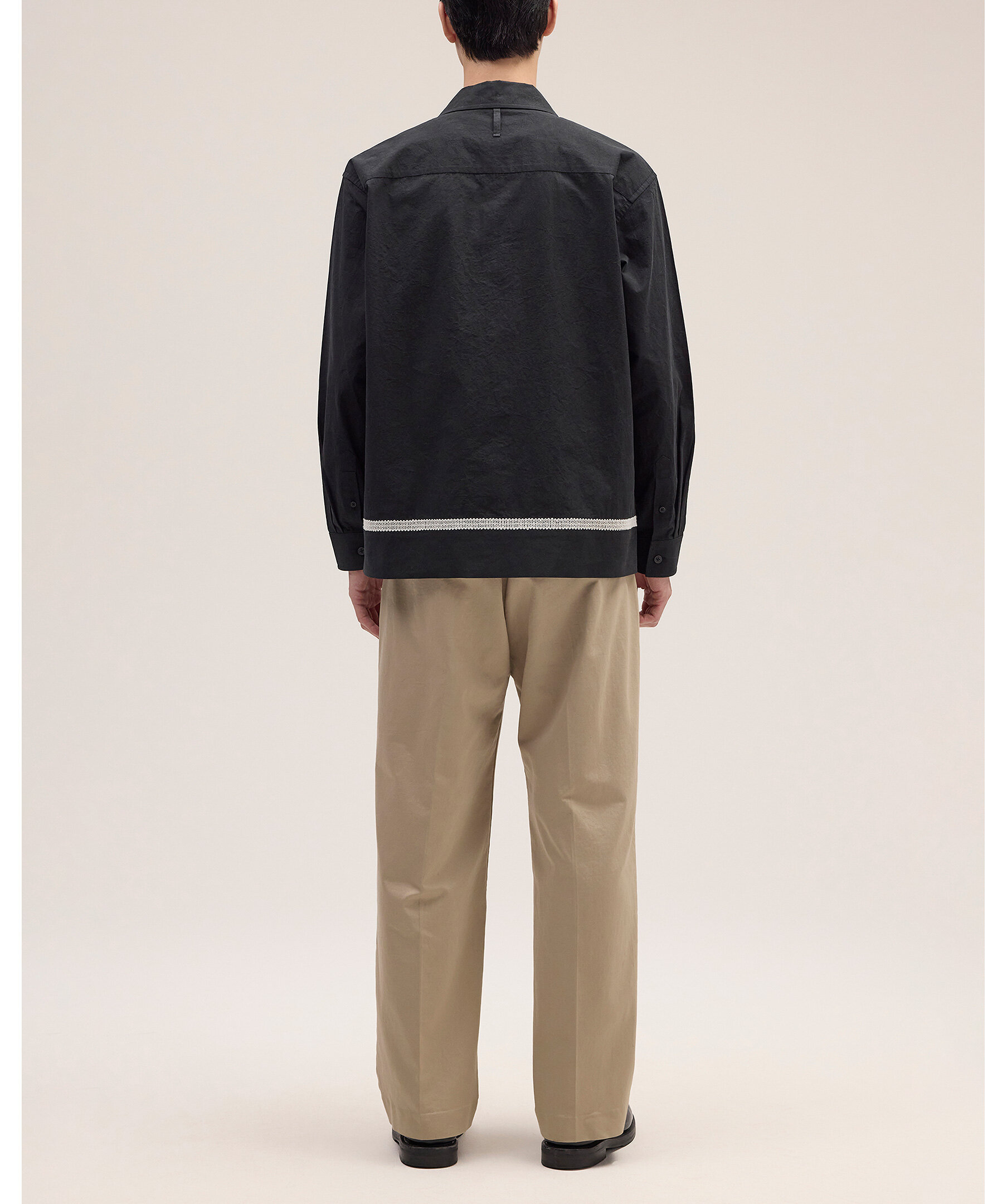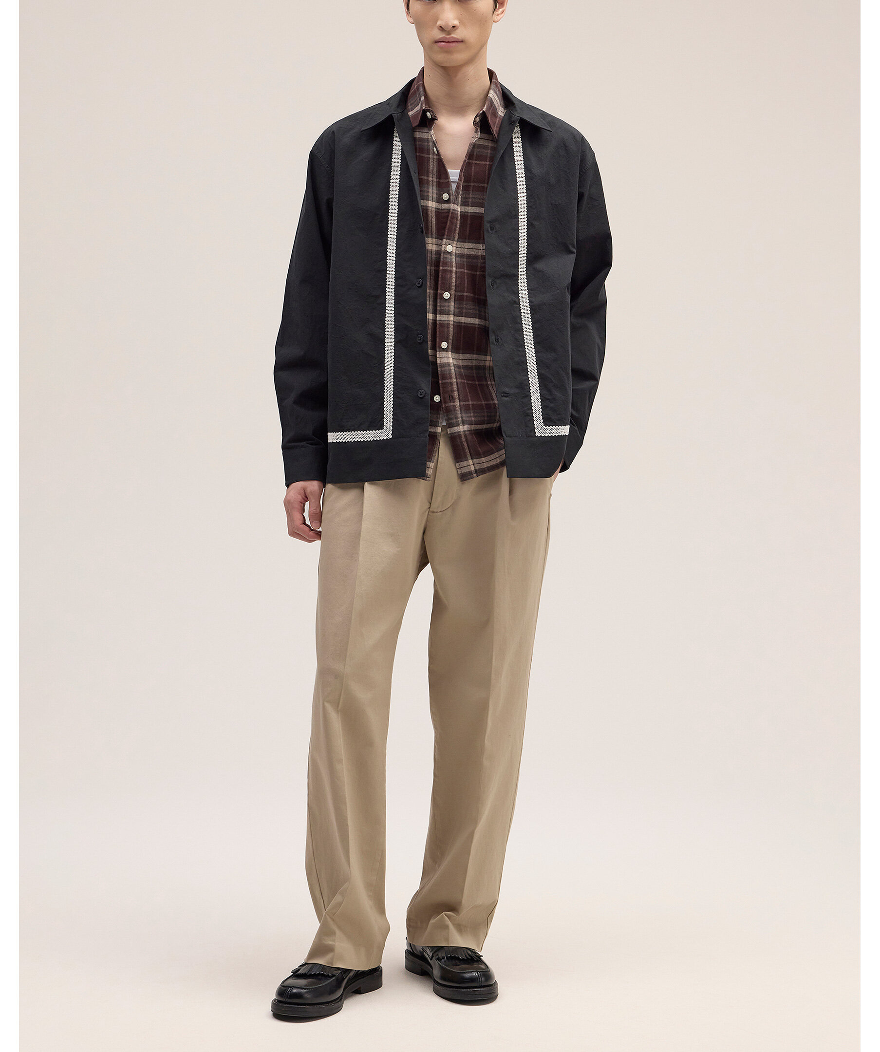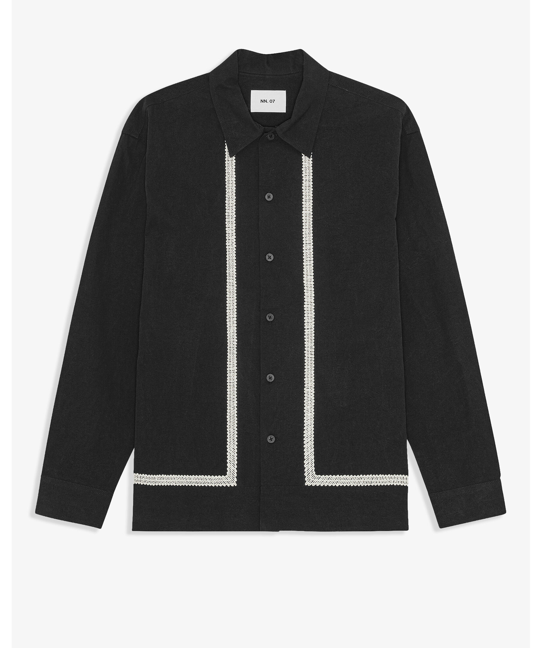 Svart overshirt från NN07 i tätvävd ekologisk bomullspoplin med relaxed fit, dekorativ broderi framtill, sidofickor och logoknappar — ett lätt lager-på-lager-plagg för casual och smart-casual outfits