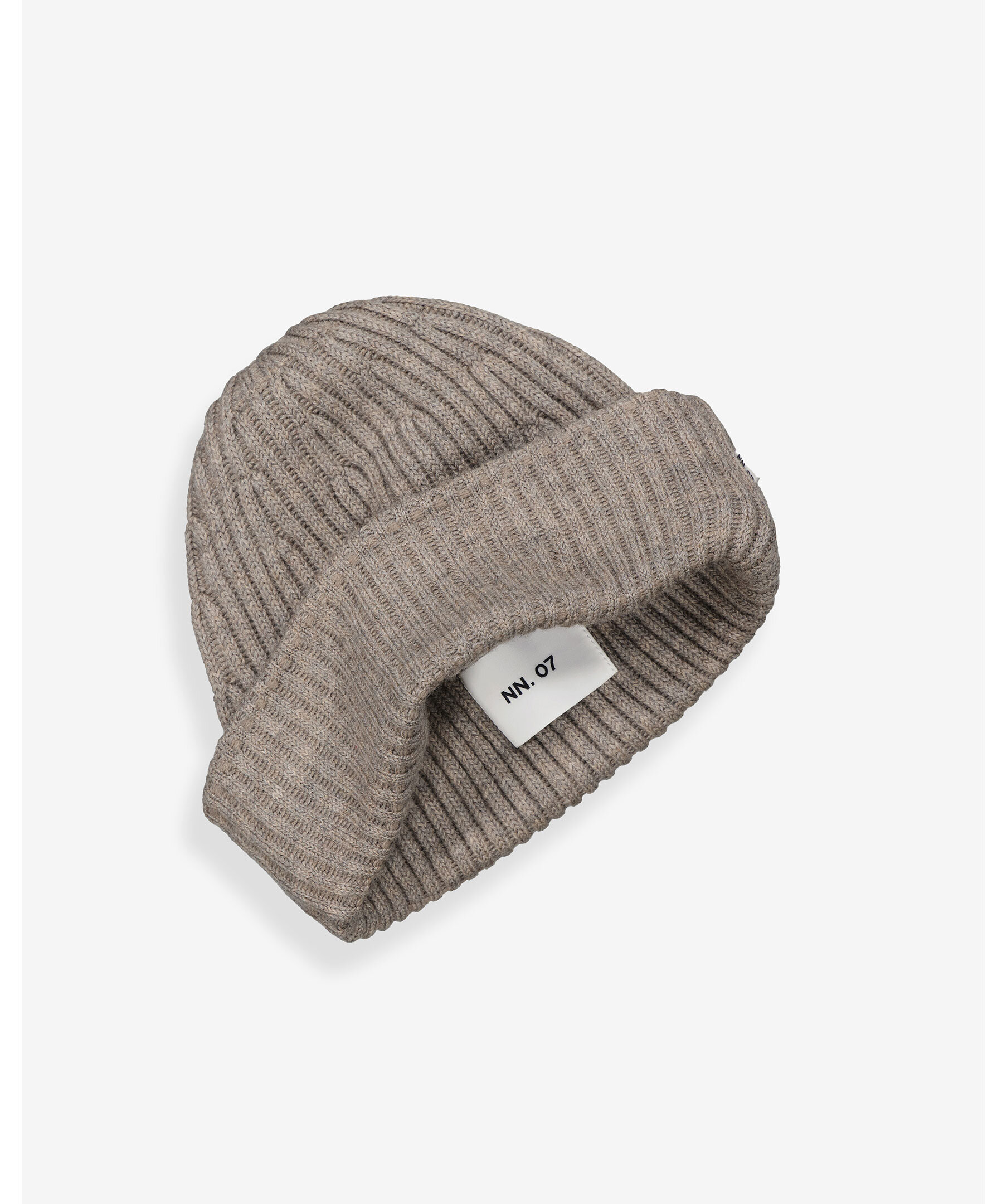 Grå/beige ribbstickad mössa från NN.07. Mössan har en åtsittande passform och är dubbelvikt nertill. Gjord i en värmande ullblandning.