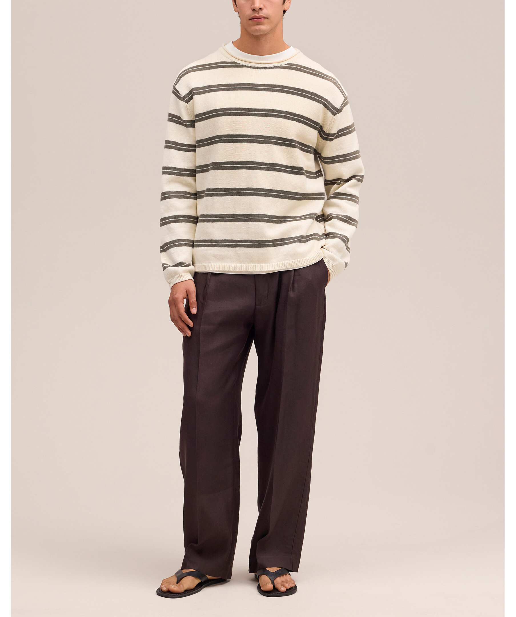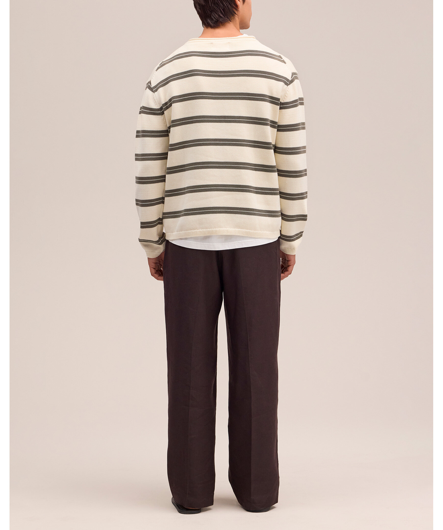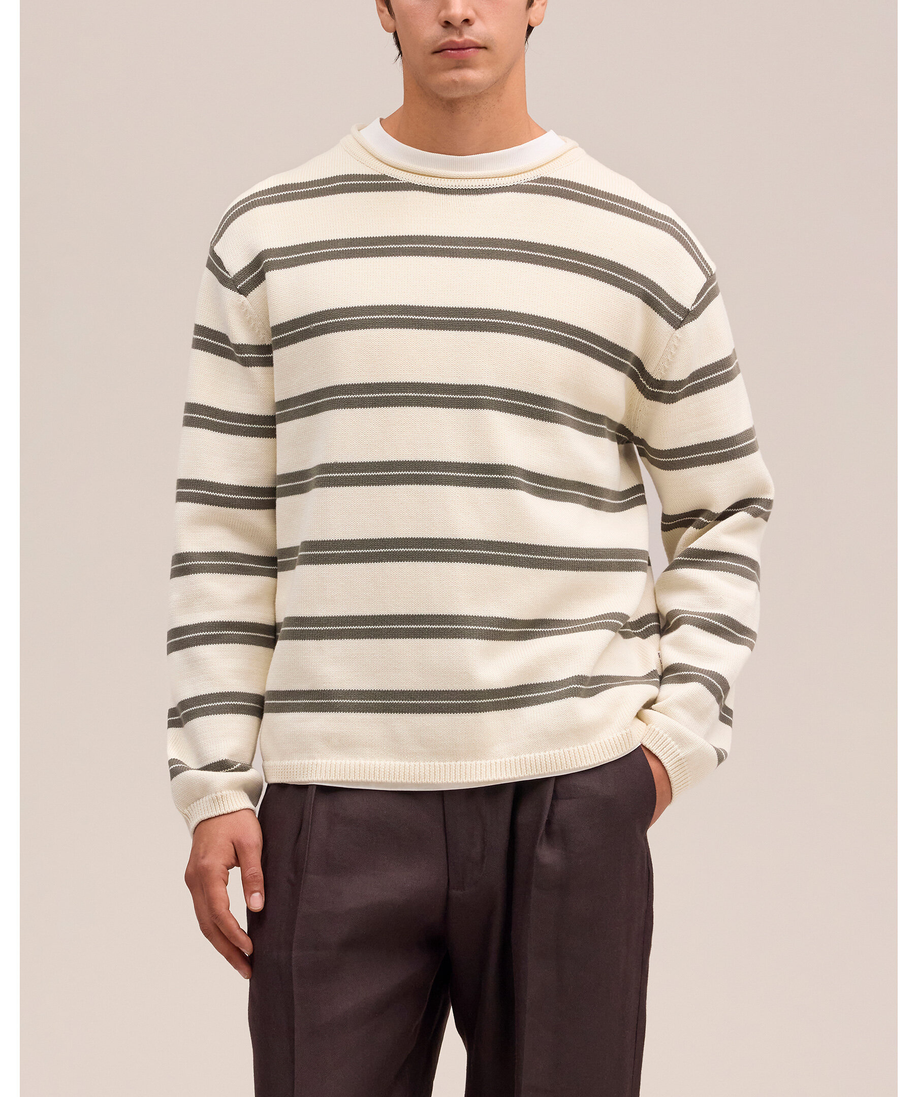 Randig rundhalsad tröja i avslappnad passform tillverkad av medeltjock ekologisk bomull. Designad med rullad kant i halsen och korta ribbade kanter för en mjuk finish
