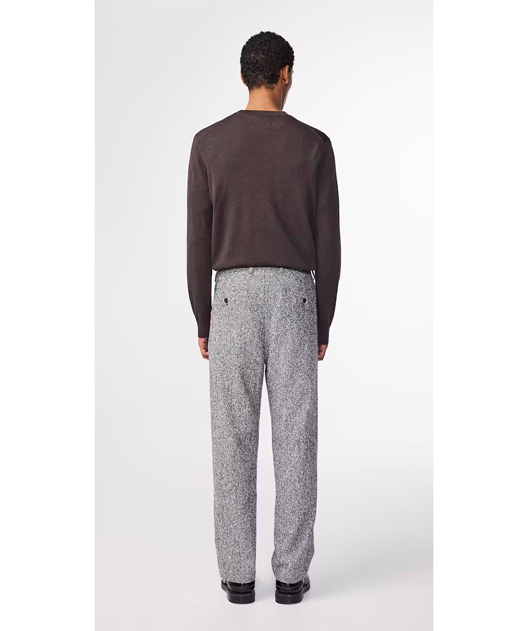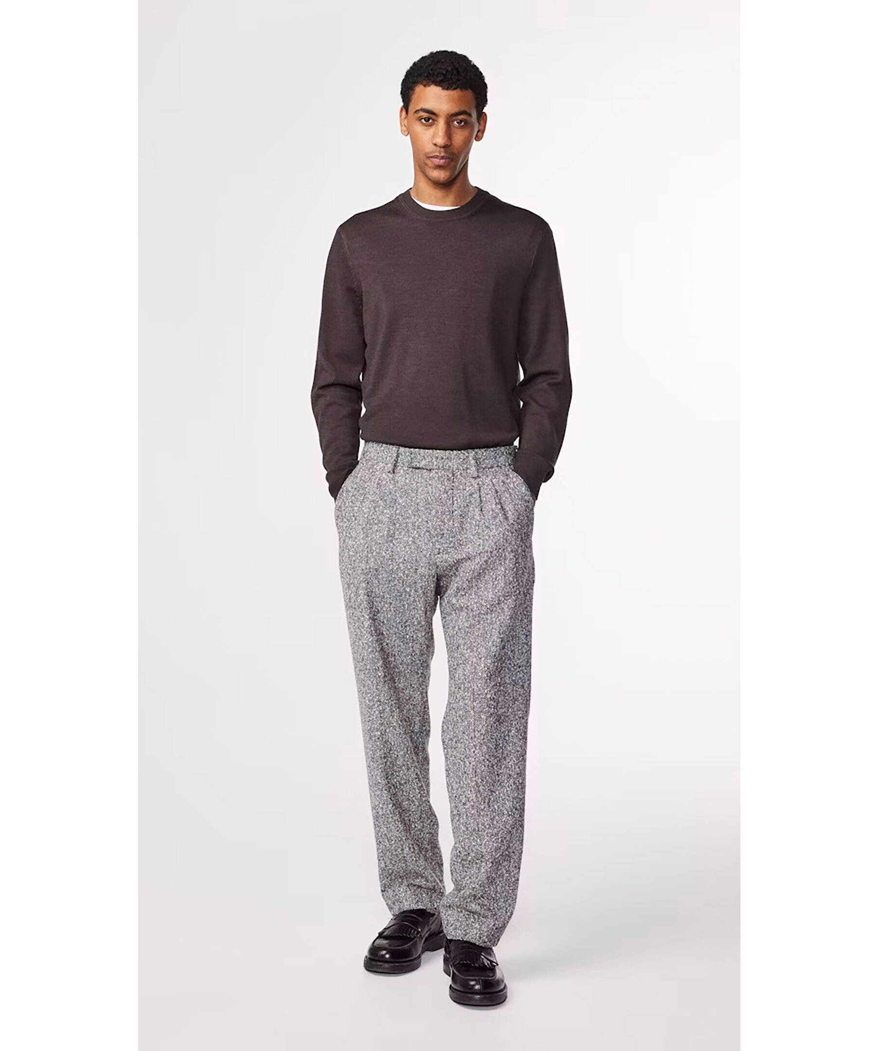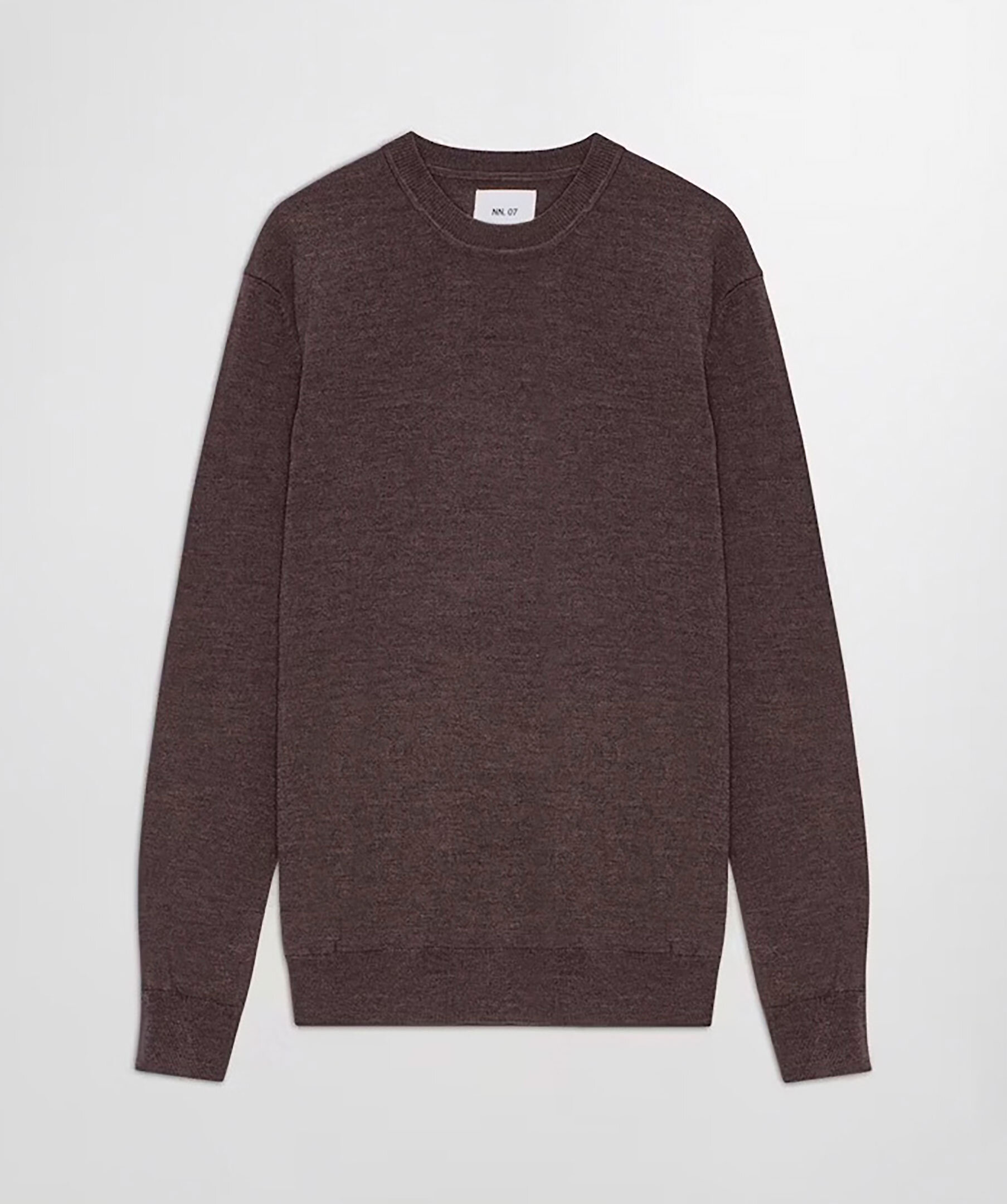 Brun, melerad finstickad tröja från NN 07. Ribbstickade muddar vid ärm- och plaggslut. Rundad halsringning. Tillverkad i 100% Ull. Normal passform.