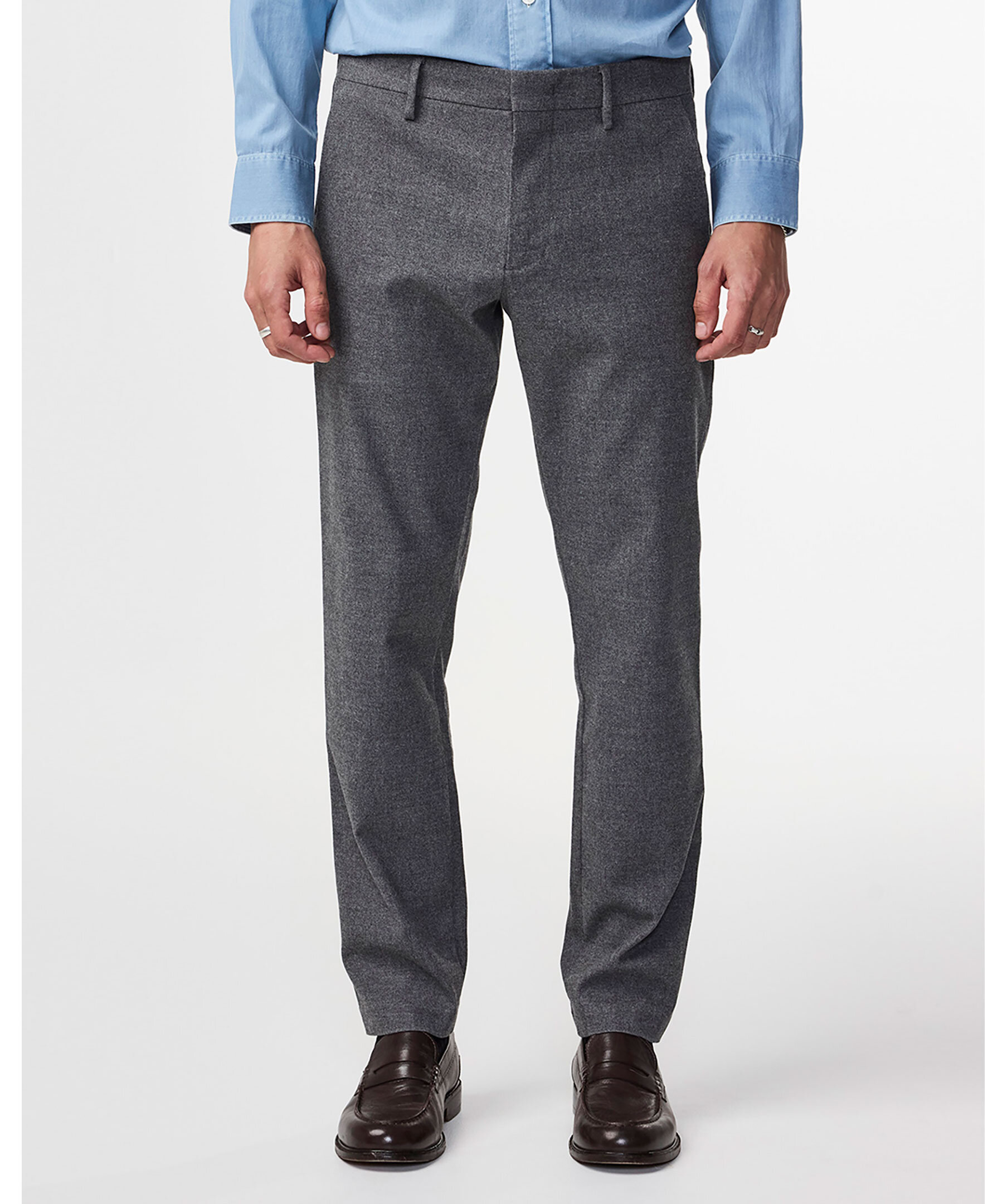 Gråa chinos från NN07. Byxorna har avsmalnande ben, bälteshällor i midjan, två sidfickor samt två passpoalfickor baktill. Tillverkad i en borstad bomullskypert melangeblandning.