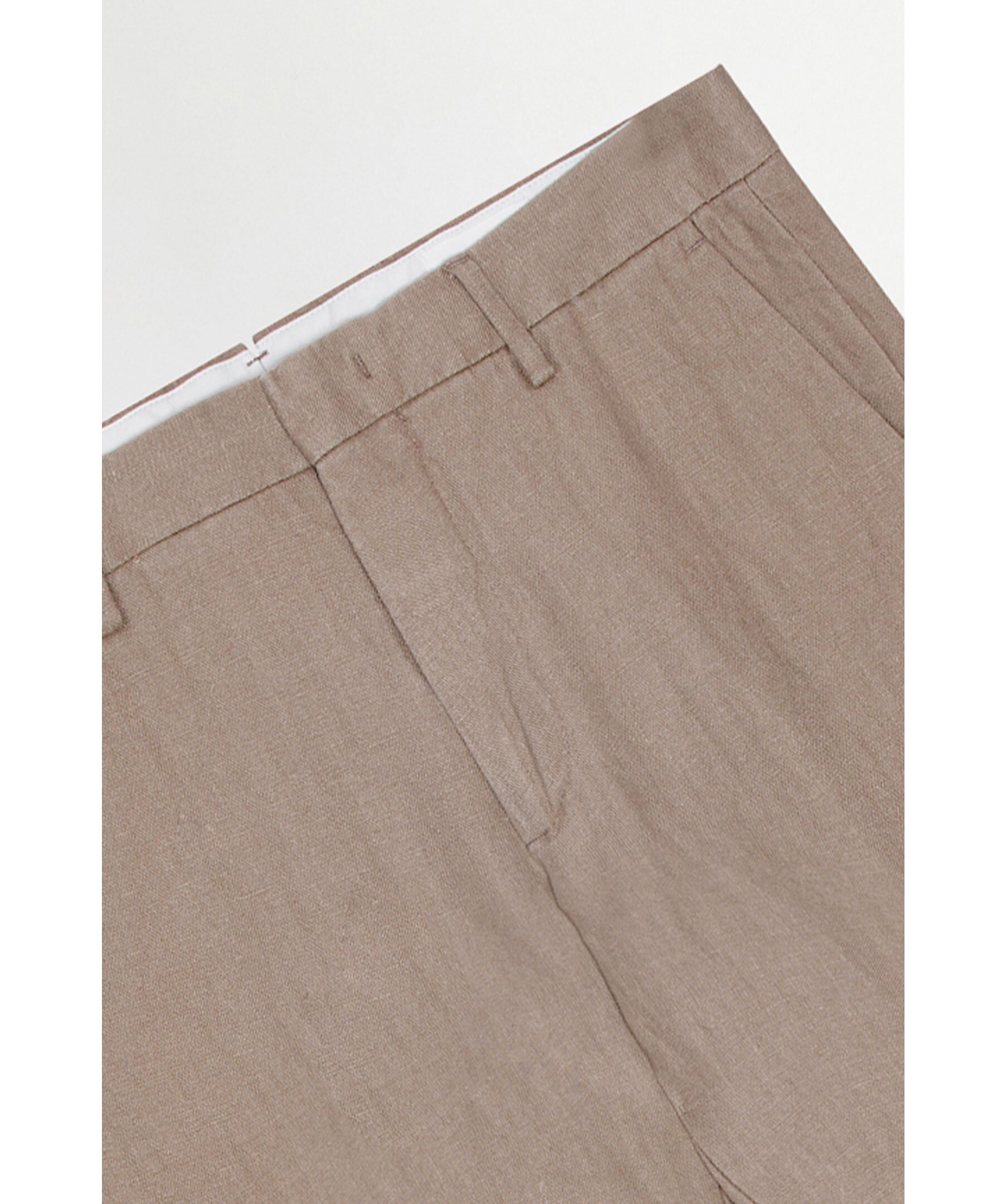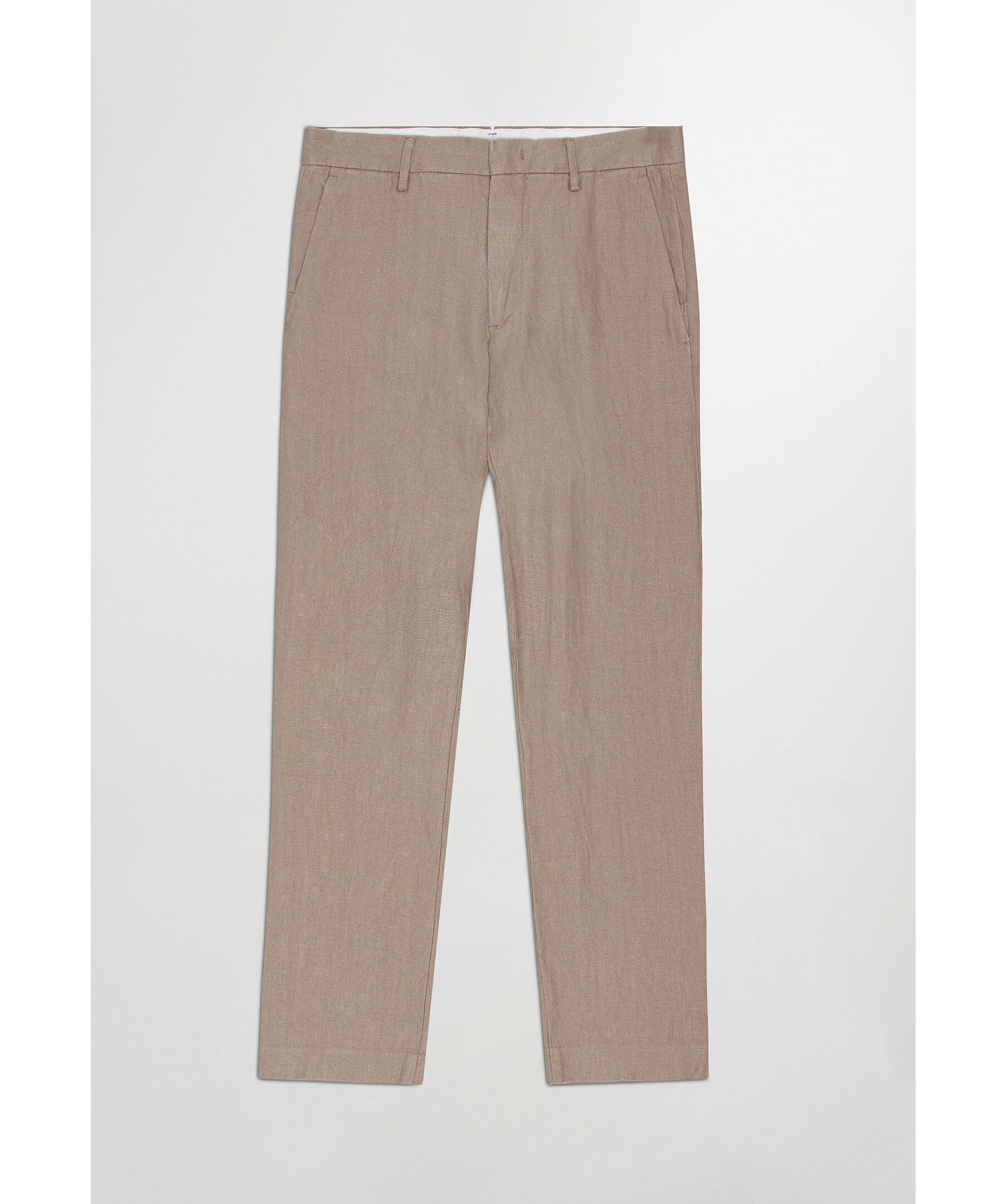 Beigea linnebyxor från NN 07. Två fickor framtill och två bakfickor hällor för bälte. Gylf som stängs med krok och ögla. Medelhög midja. Avsmalnande ben. Tillverkat i 100% Europeiskt Linne.