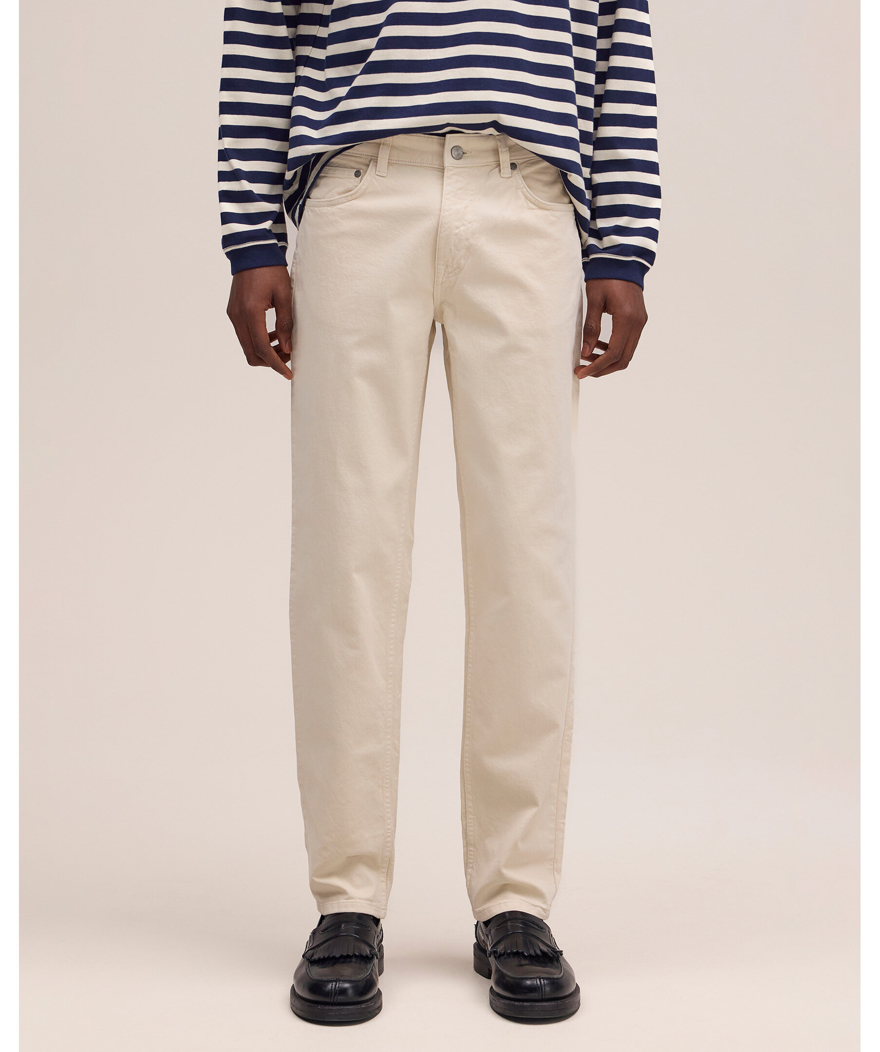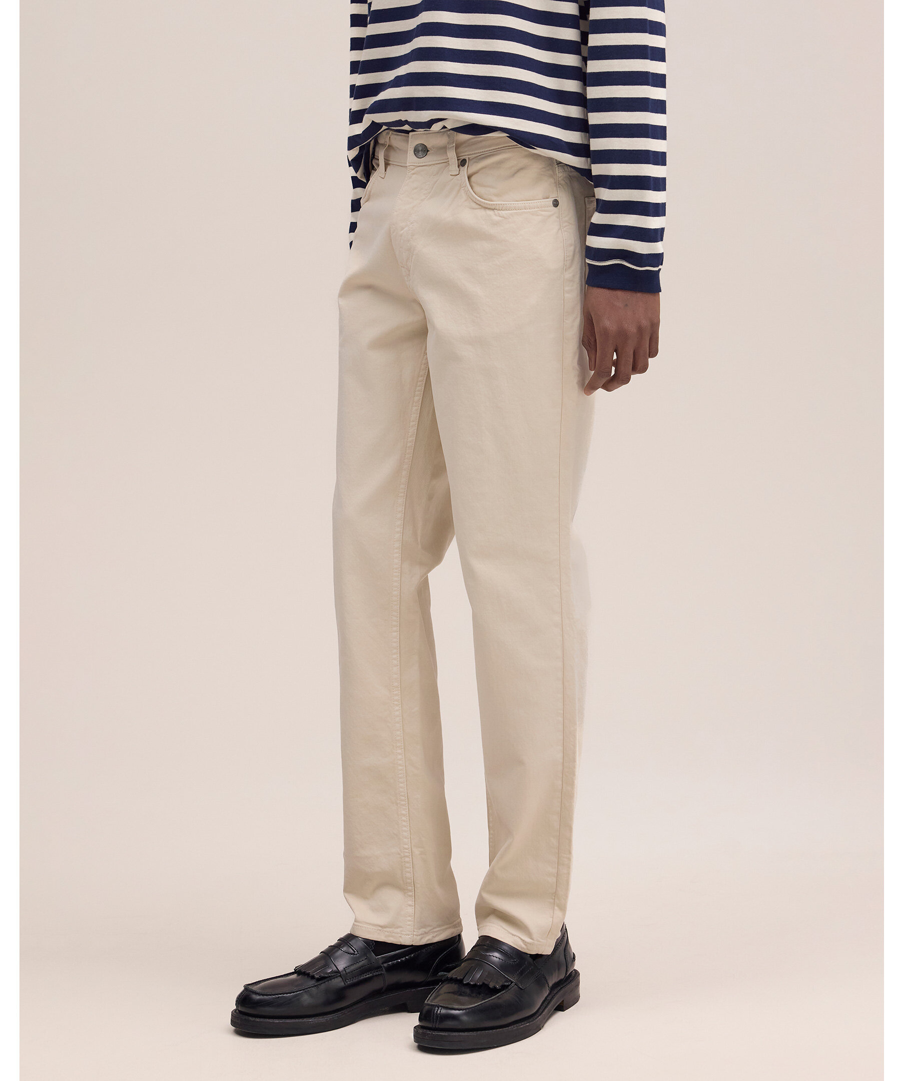 Ljusbeigea byxor från NN07. Byxorna har bälteshällor i midjan, fem fickor och är tillverkade i en stretchig, ekologisk bomullsblandning.