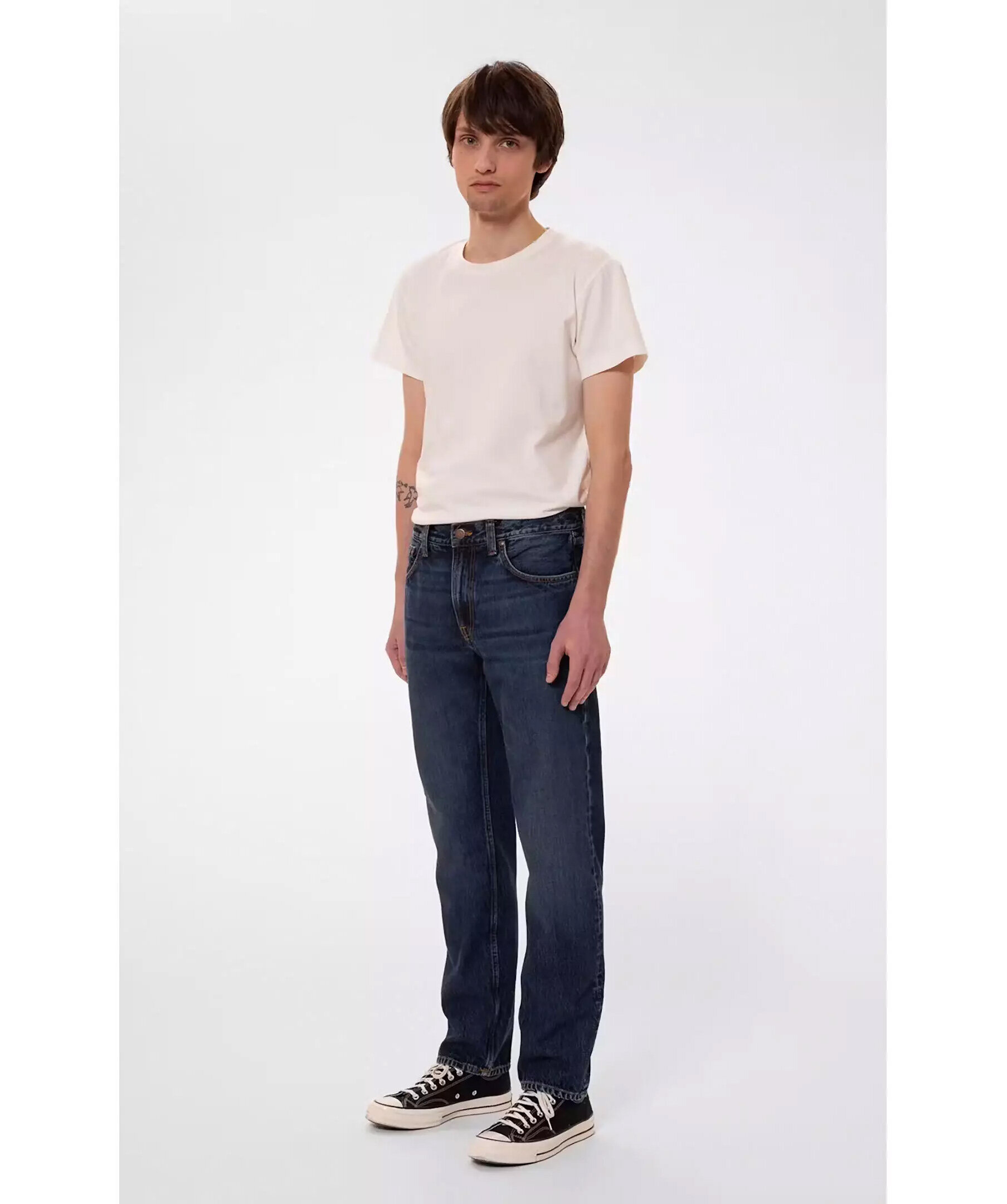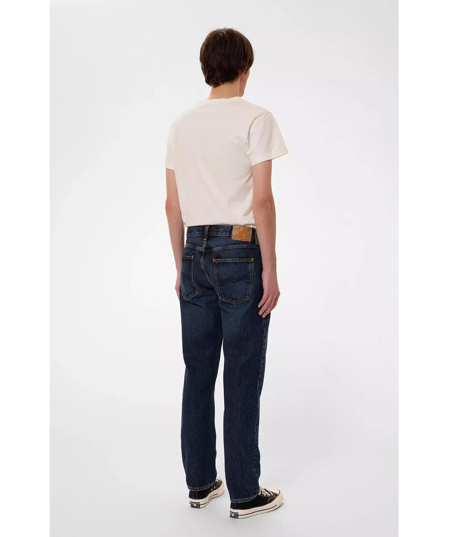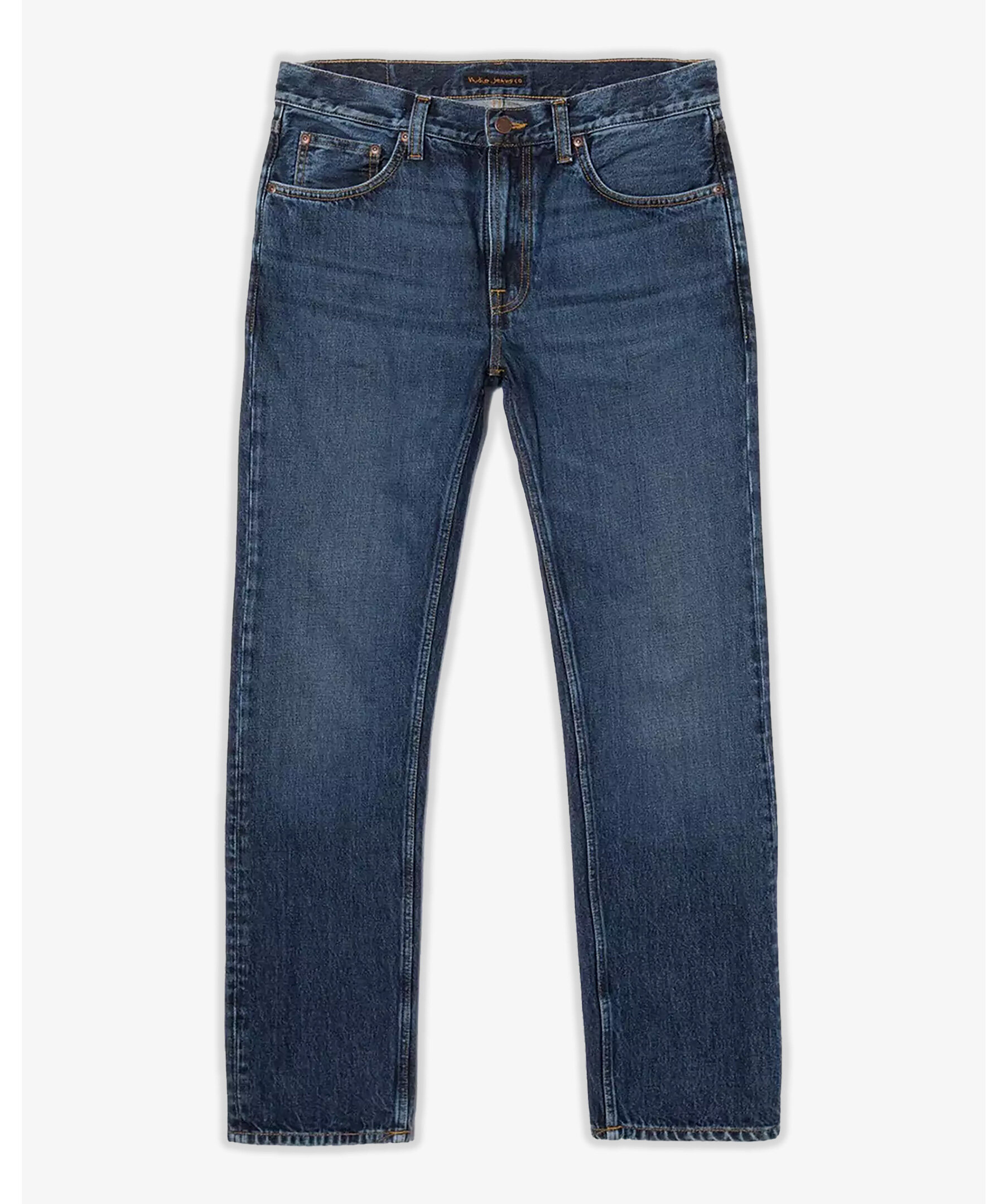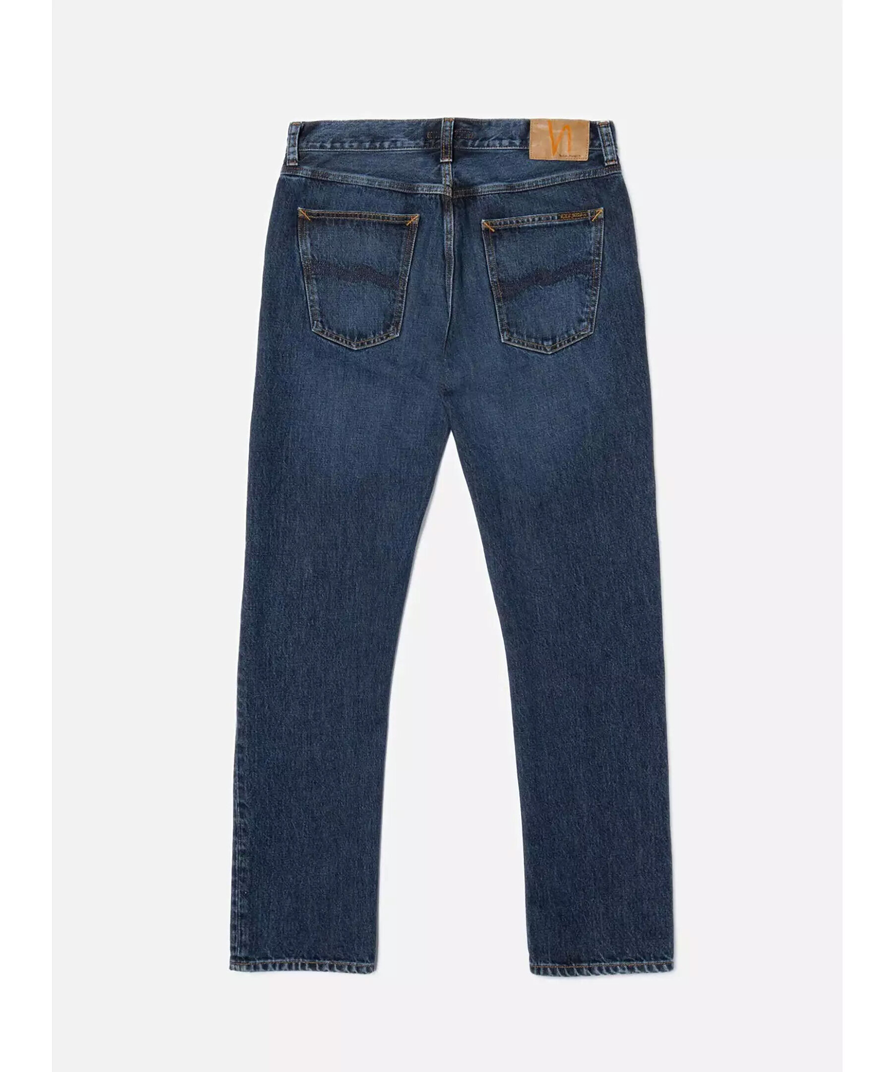 Mörkblåa jeans från Nudie Jeans. Jeansen har en smal passform med raka ben, fem fickor, bälteshällor, mellanhög midja samt orangea sömmar. Tillverkade i bomull.