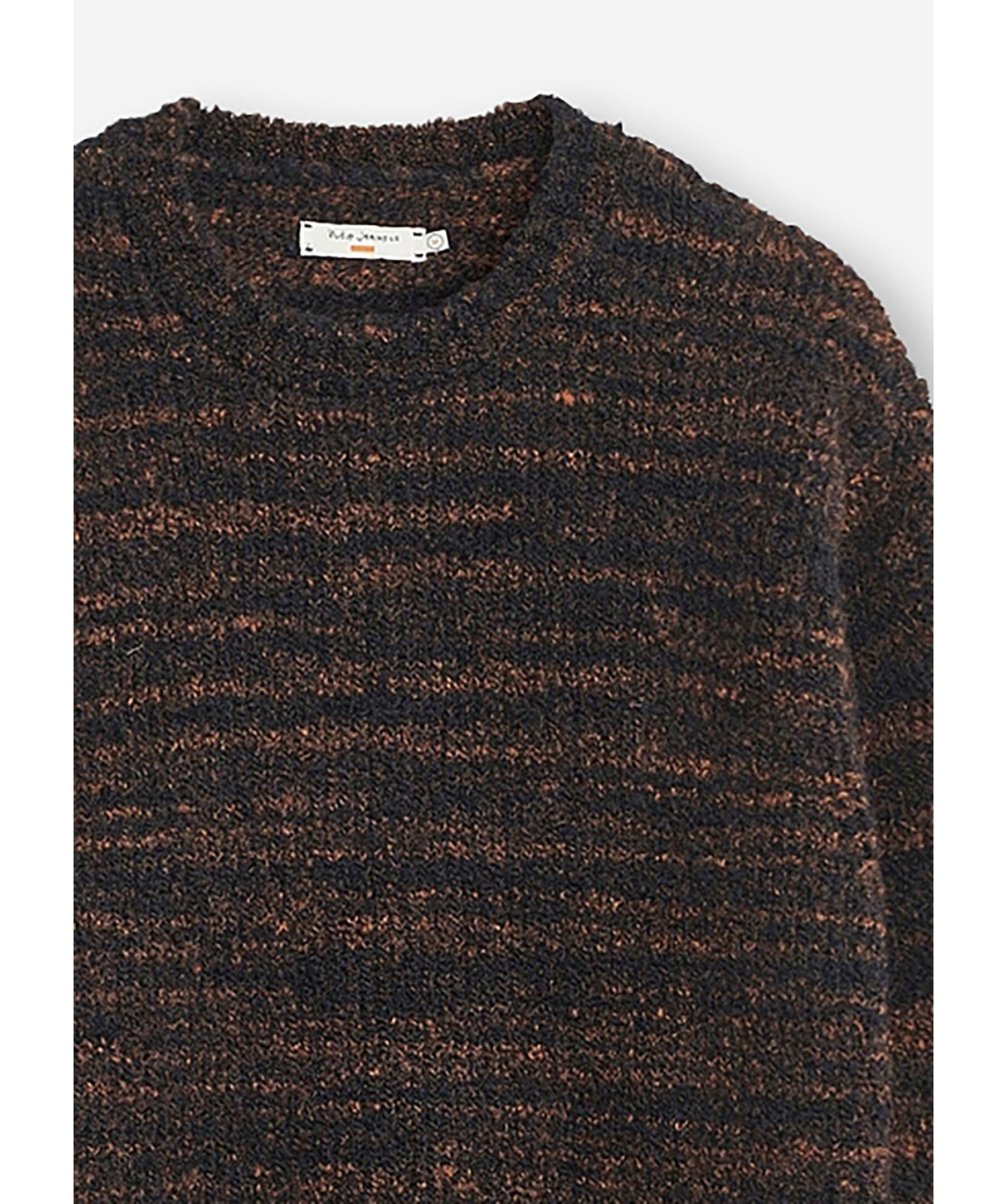 Svart och brun stickad tröja från Nudie. Tröjan är stickad i ett mjukt bouclégarn tillverkat i ullblandning och har rundad halsringning samt ribbstickad vid krage samt ärm- och plaggslut.