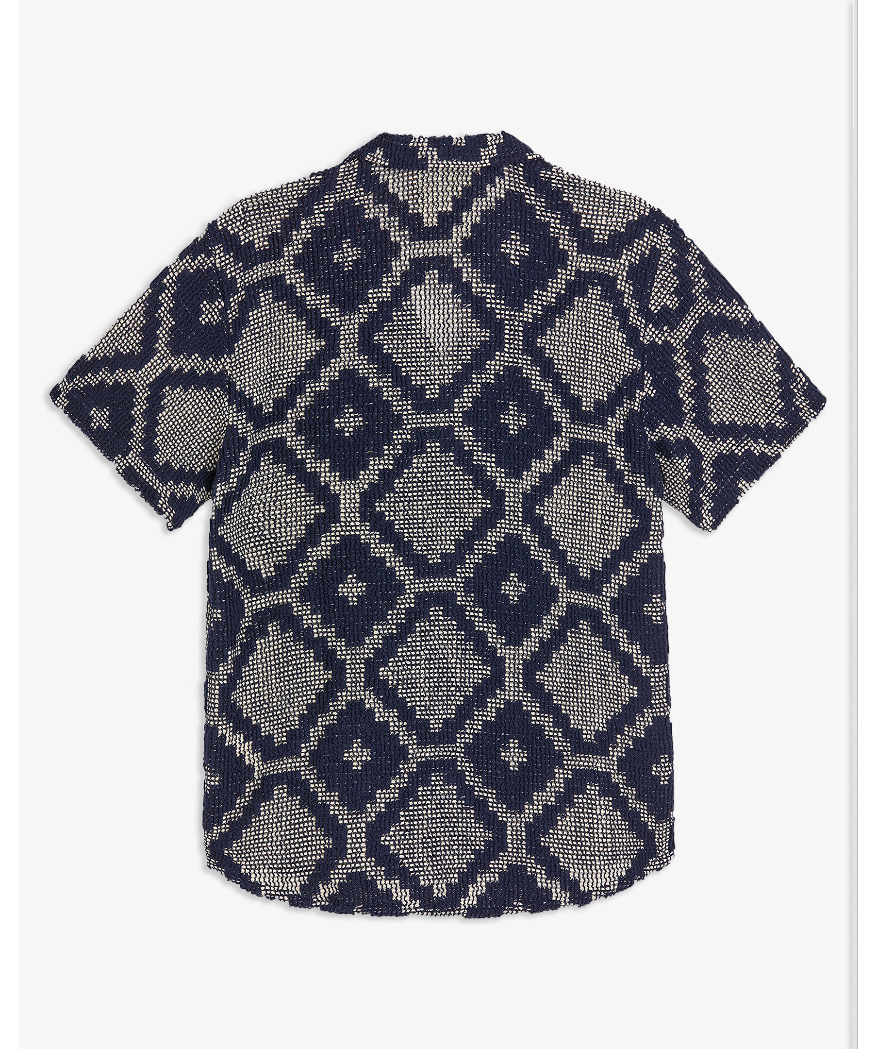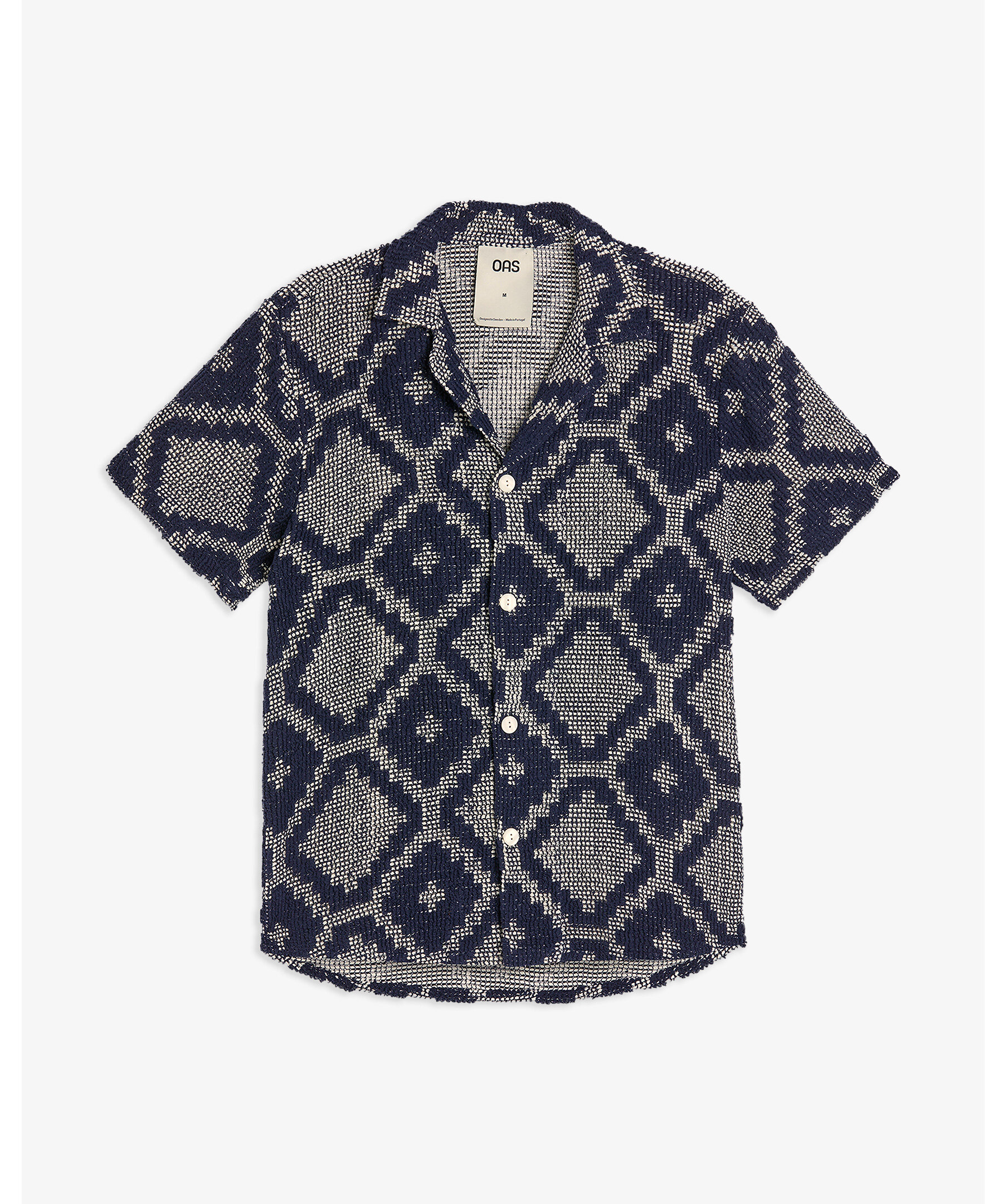 Marinblå, mönstrad och kortärmad skjorta från OAS. Skjortan är virkad och har en texturerad tolkning av mosaikmotiv med ett tvåfärgat jacquardmönster. Stängs med knappar och har resortkrage. Tillverkad i en bomullsblandning.