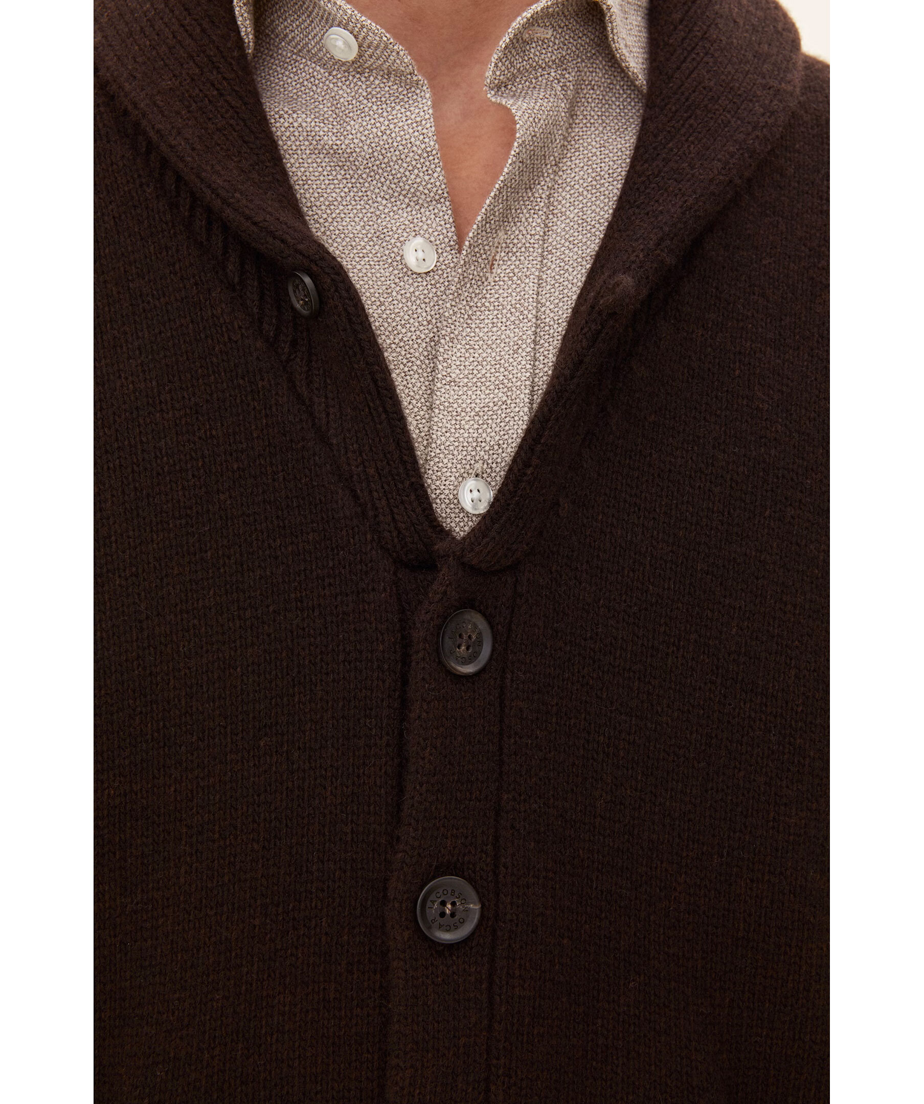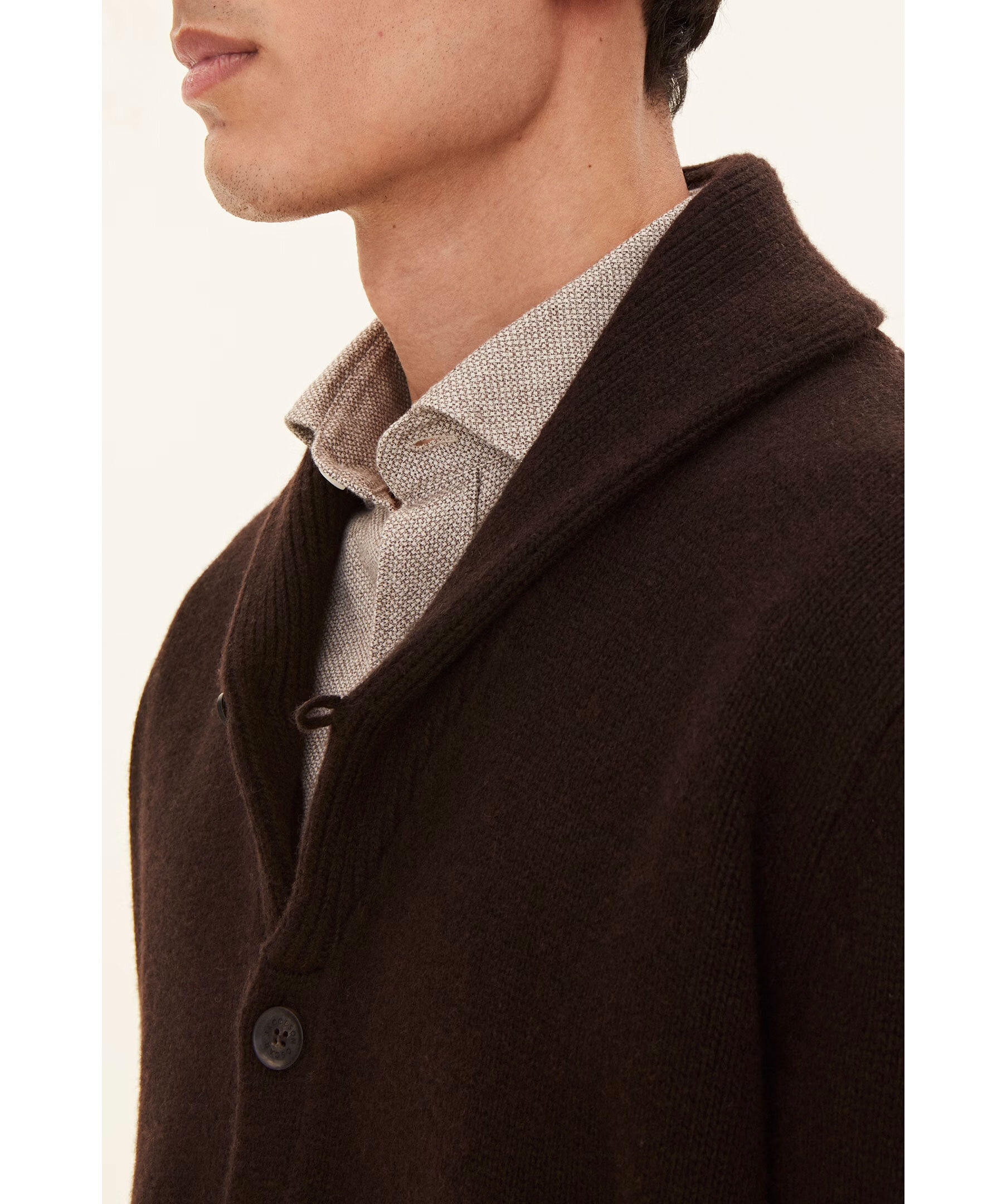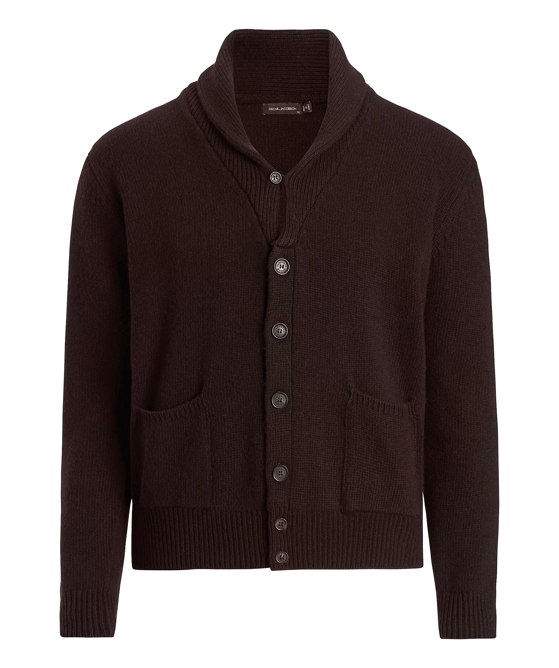 Mörkbrun stickad cardigan från Oscar Jacobson. Stängs med knappar längst mitten av plaggen. Gjord i en ull och kashmirblandning.
