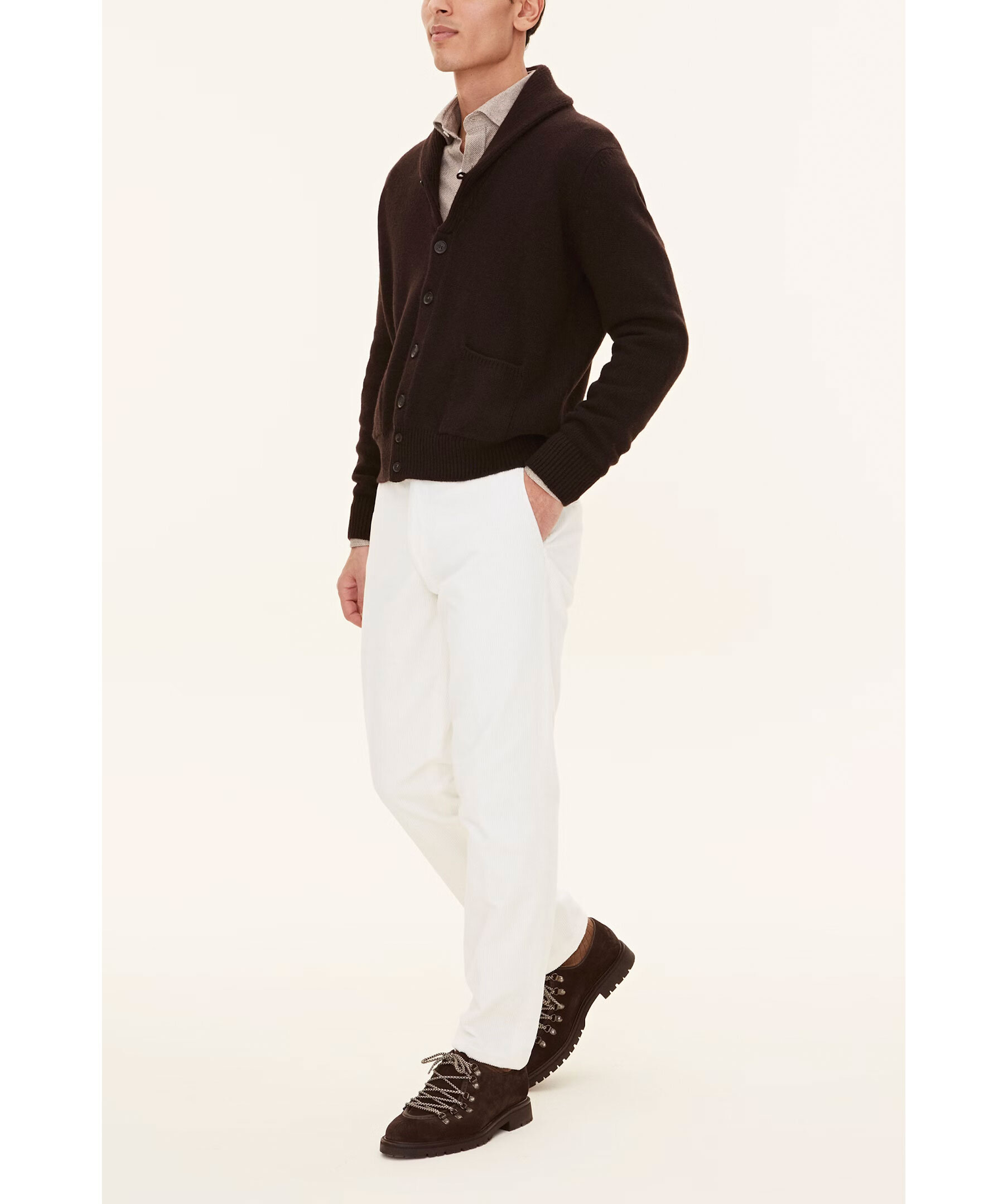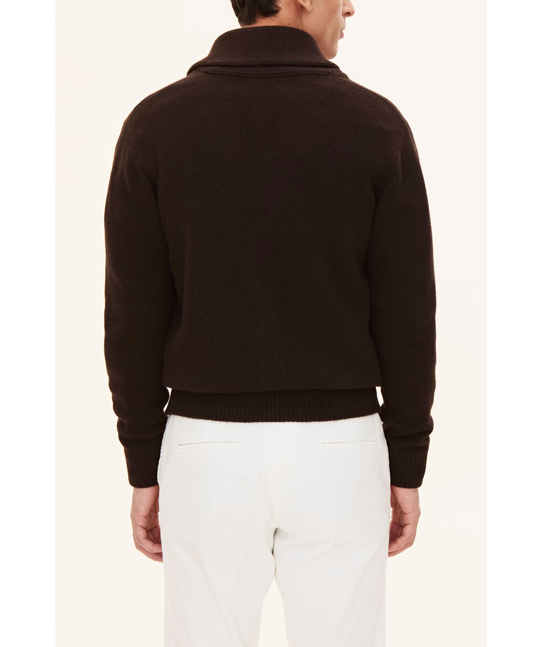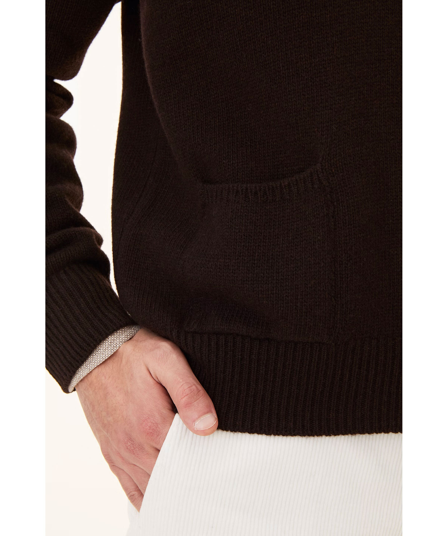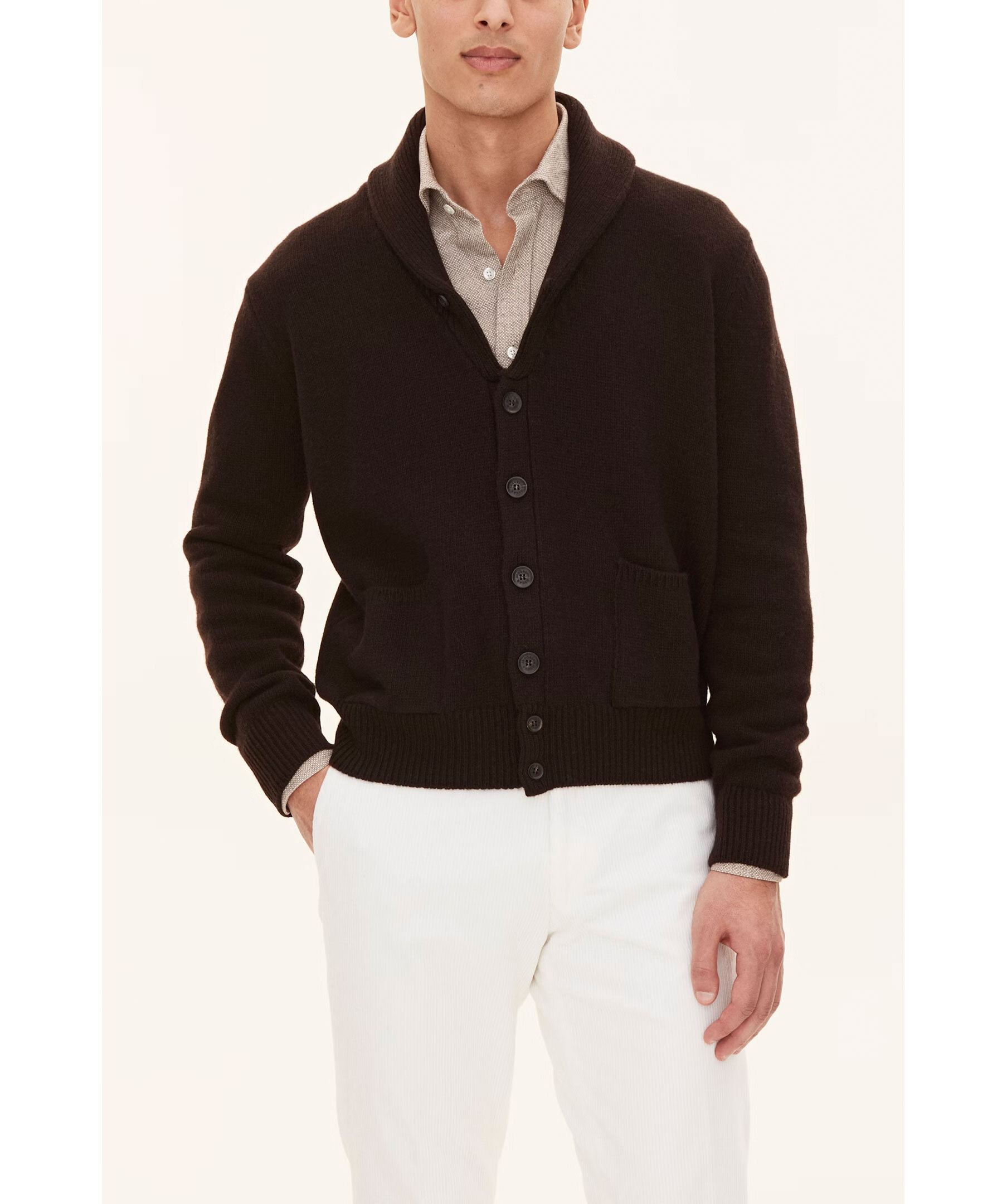 Mörkbrun stickad cardigan från Oscar Jacobson. Stängs med knappar längst mitten av plaggen. Gjord i en ull och kashmirblandning.