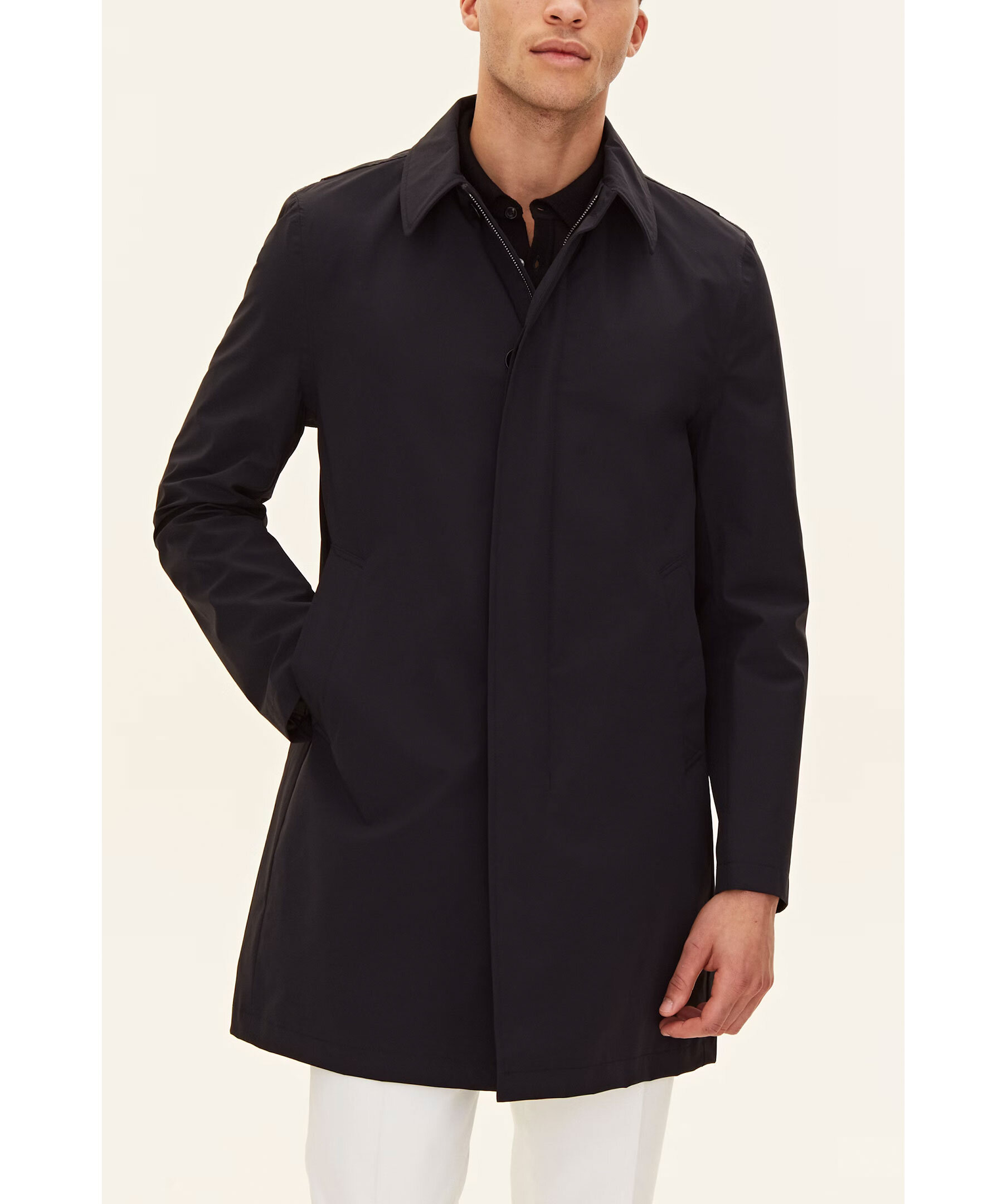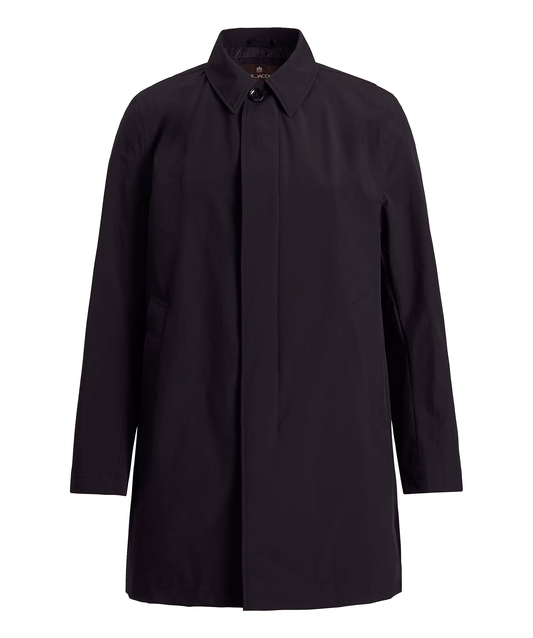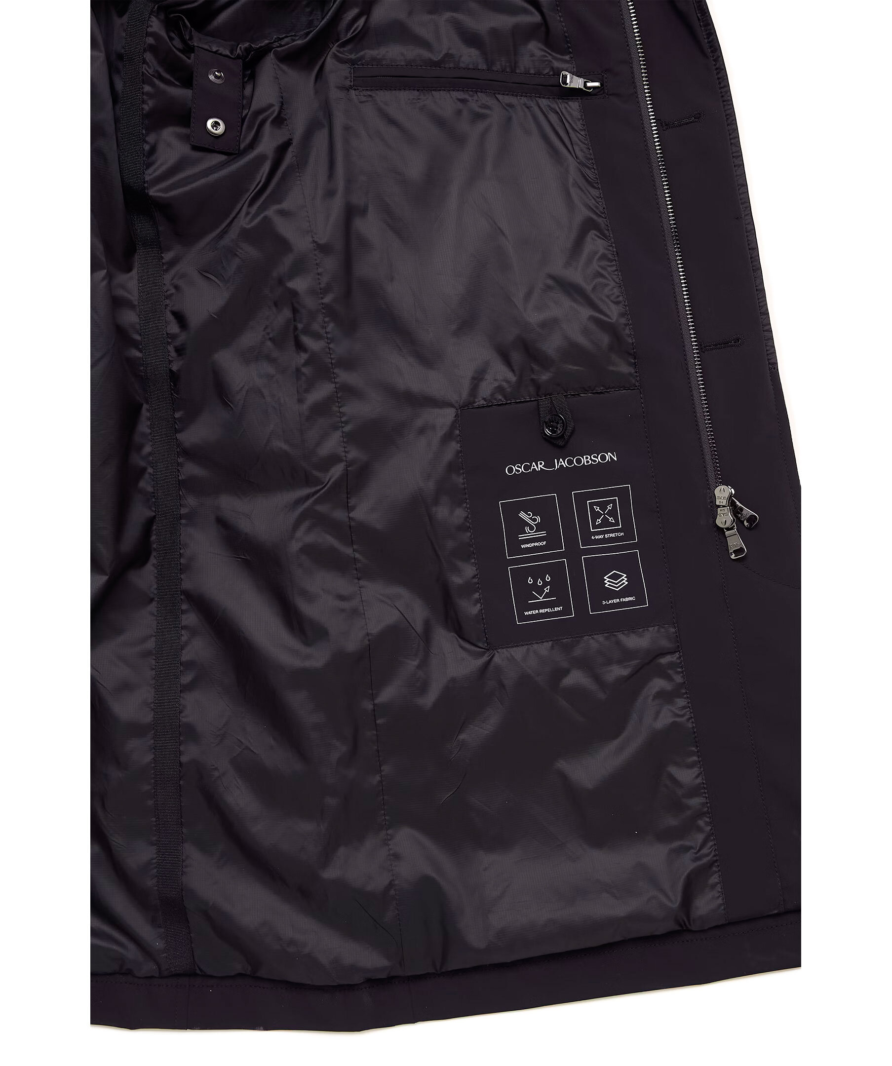 Mörkblå Car Coat från Oscar Jacobson. Gjord i Nylon Shell och är designad för att vara ett heltäckande skalplagg till din vardag och fungera till både formell kostym och lediga jeans. Utöver det vattenavvisande och vattentäta yttertyget så har rocken tejpade sömmar i axel och rygg för att hålla dig torr i tuffare väderförhållanden. Insidan av rocken är täckt i ett slitstarkt ripstop-foder och innehåller tre innerfickor samt knappar till infästning av våra liner-västar. Nylon Shell är vårt tre-lagers skalmaterial, framtaget för att skydda mot väder och vind helt utan att kompromissa på rörlighet, andningsförmåga eller stil.