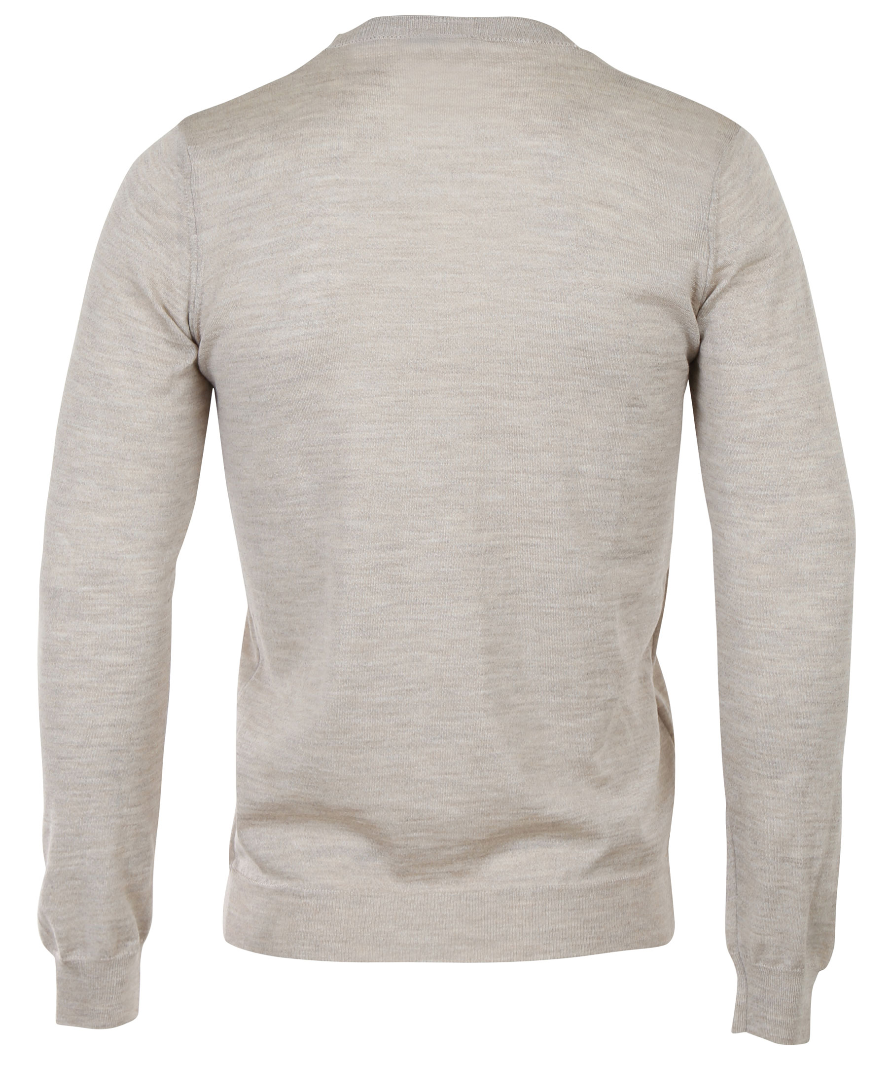 Beige finstickad pullover från Oscar Jacobson. Tillverkad i 100% merinoull. Rundad hals, ribbstickade muddar.
