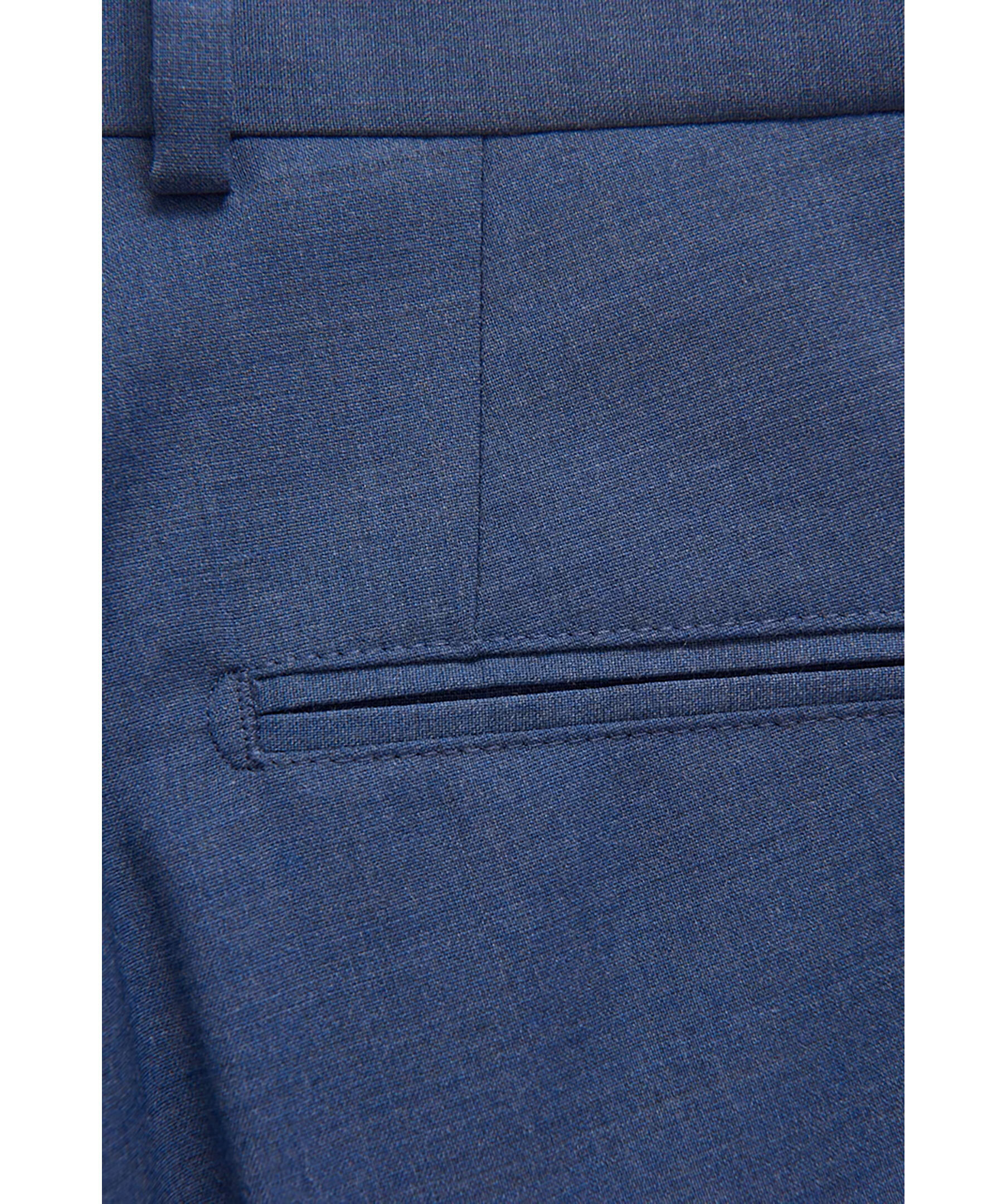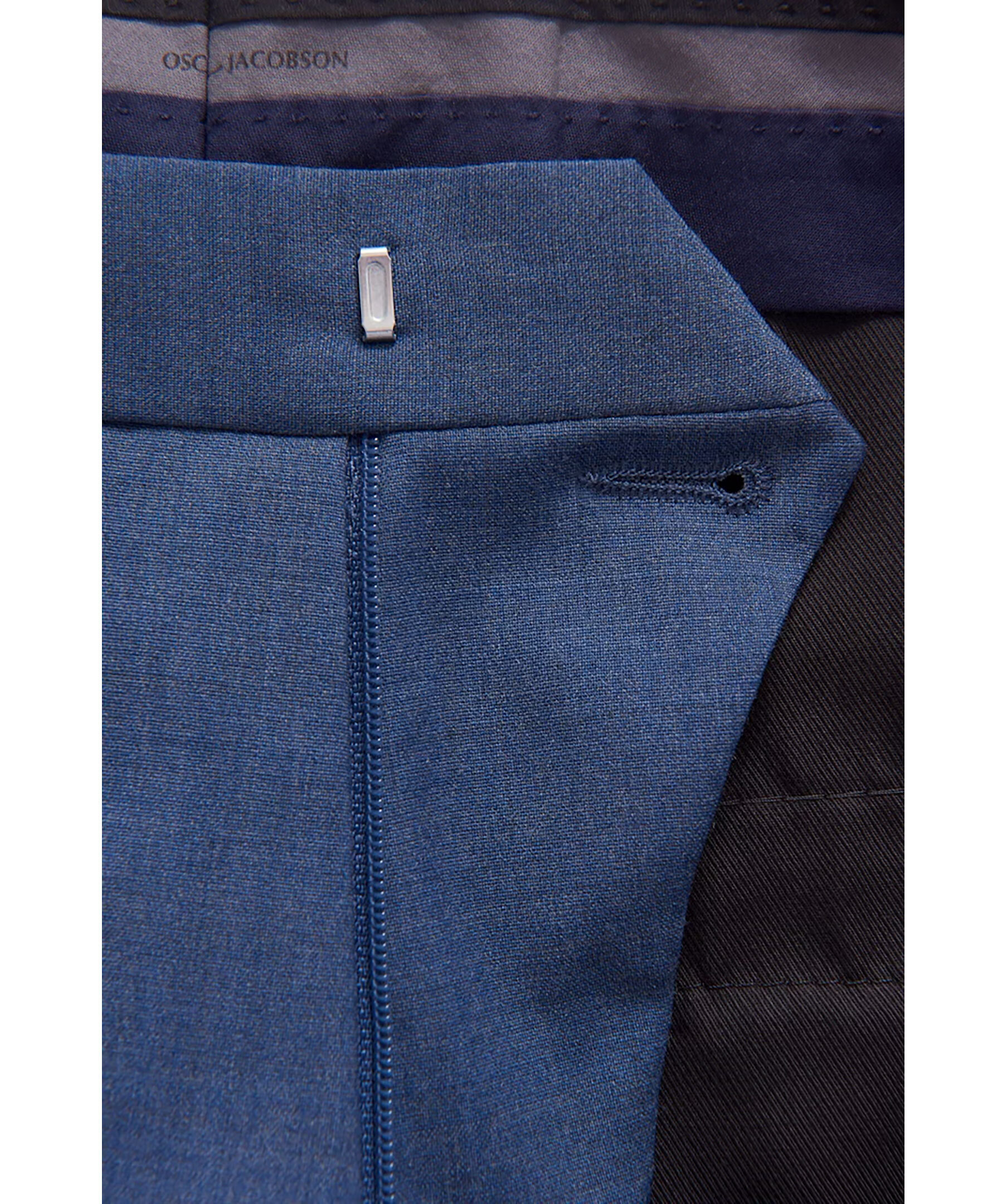 Blåa kostymbyxor från Oscar Jacobson. Hällor för bälte. Gylfen stängs med hakar och dragkedja. Tillverkad i 100% Ull. Slim fit modell.