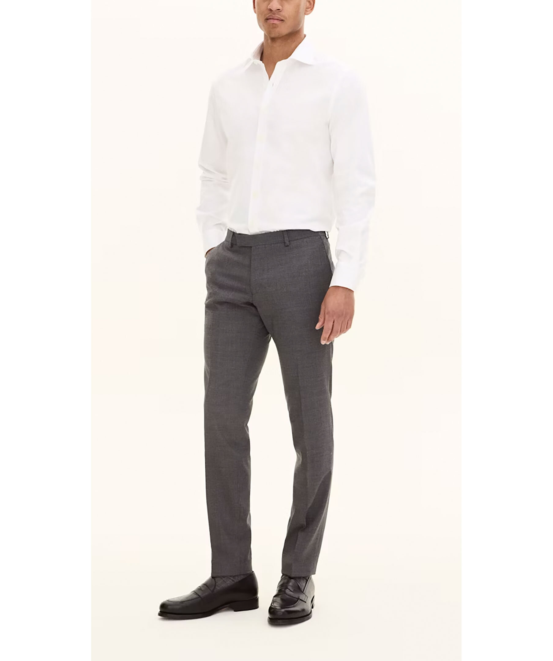 Gråa kostymbyxor från Oscar Jacobson. Hällor för bälte. Gylfen stängs med hakar och dragkedja. Tillverkad i 100% Ull. Slim fit modell.