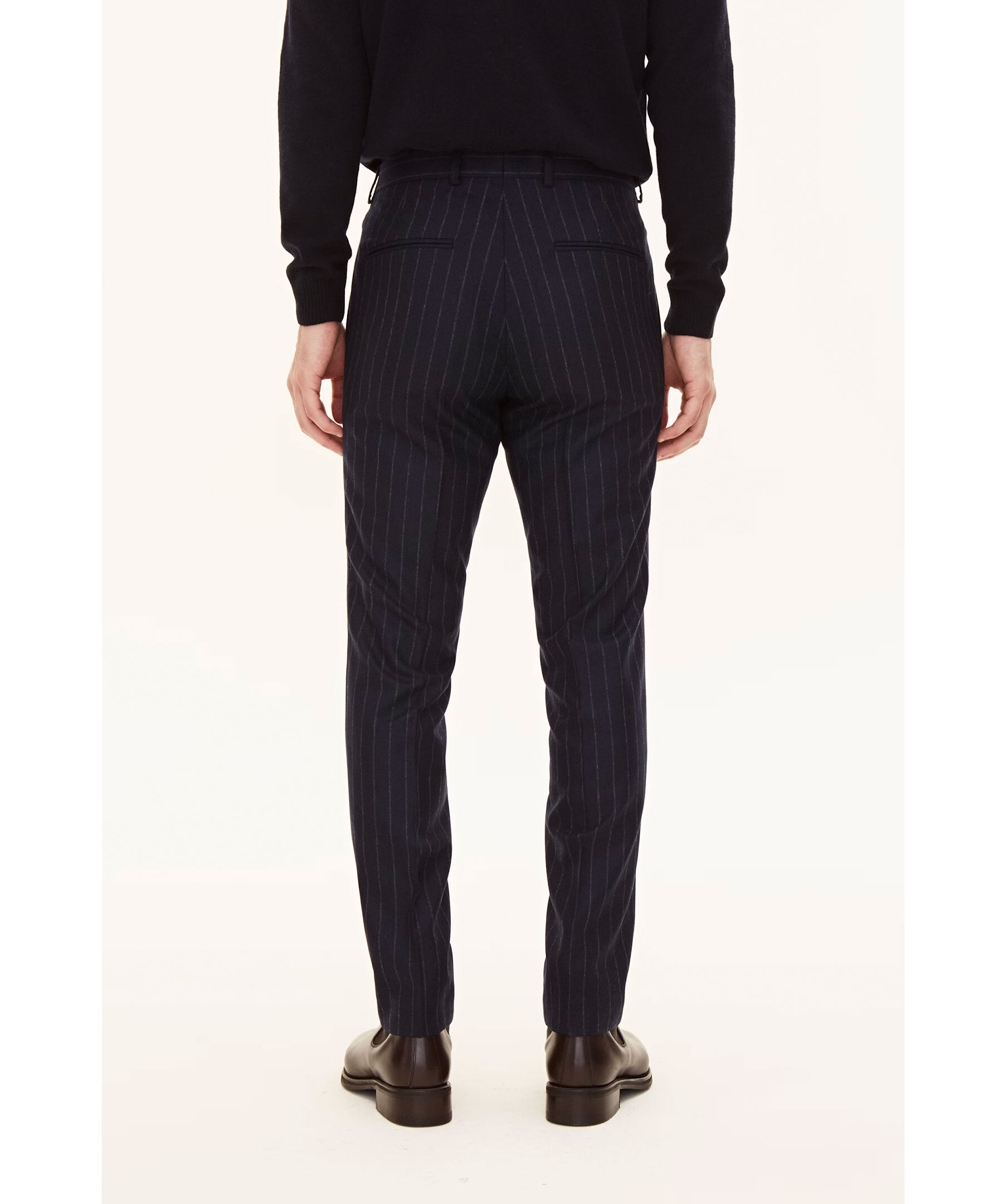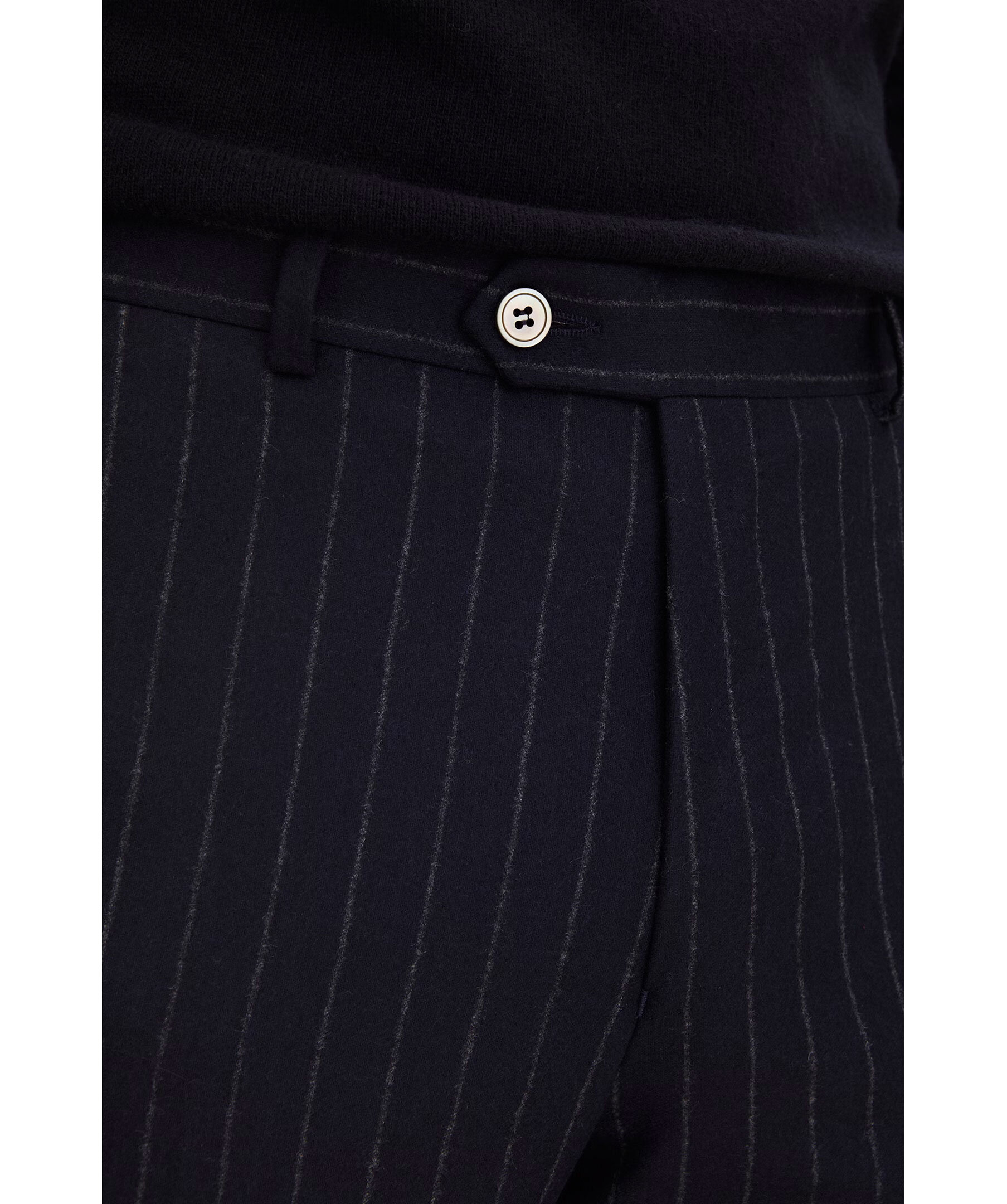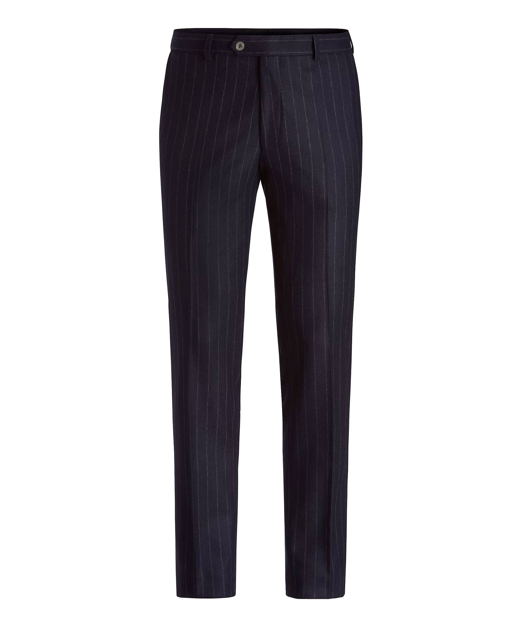 Marinblå pinstripe mönstrade kostymbyxor från Oscar Jacobson. Slim fit modell och tillverkad i 100% ull.