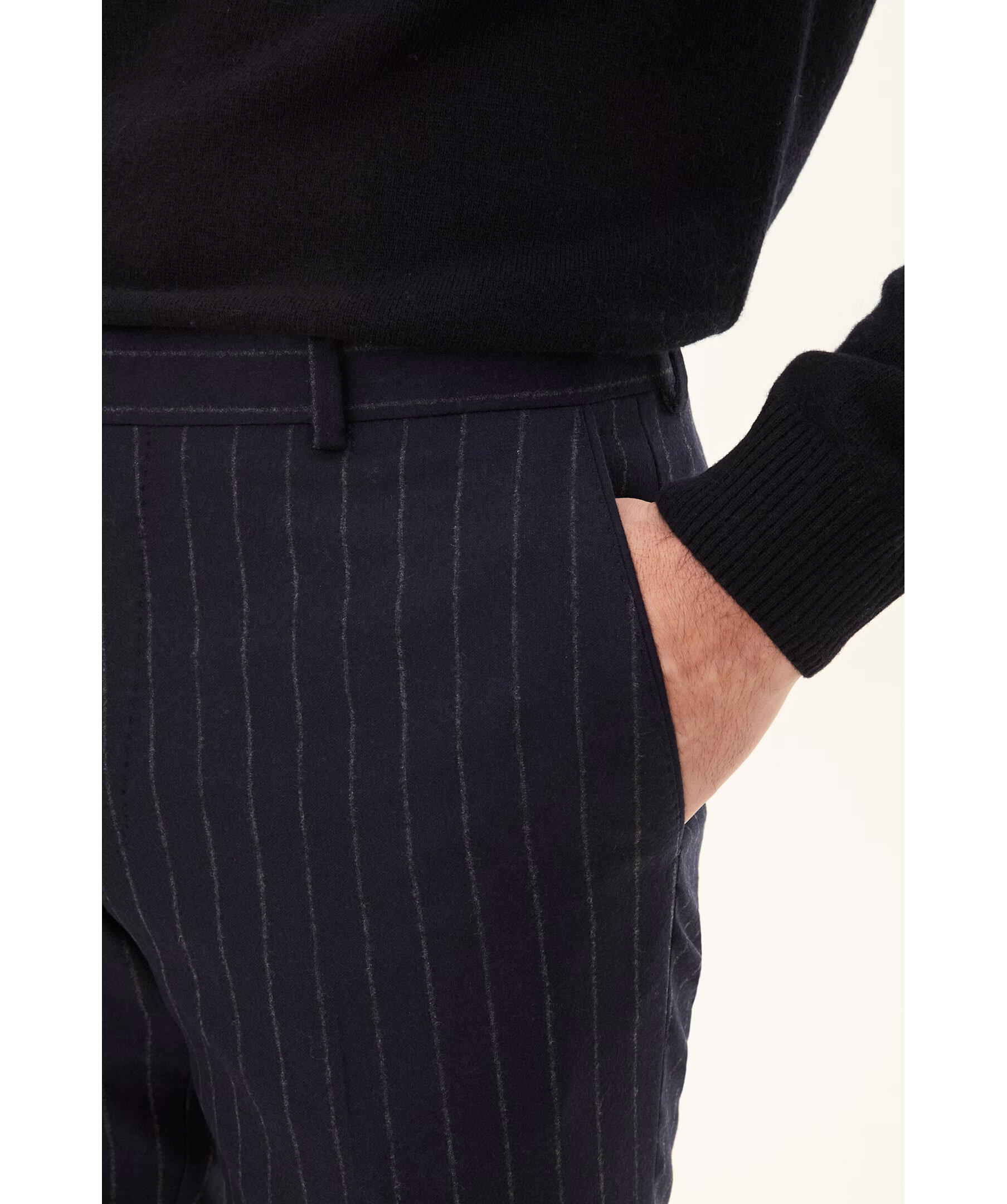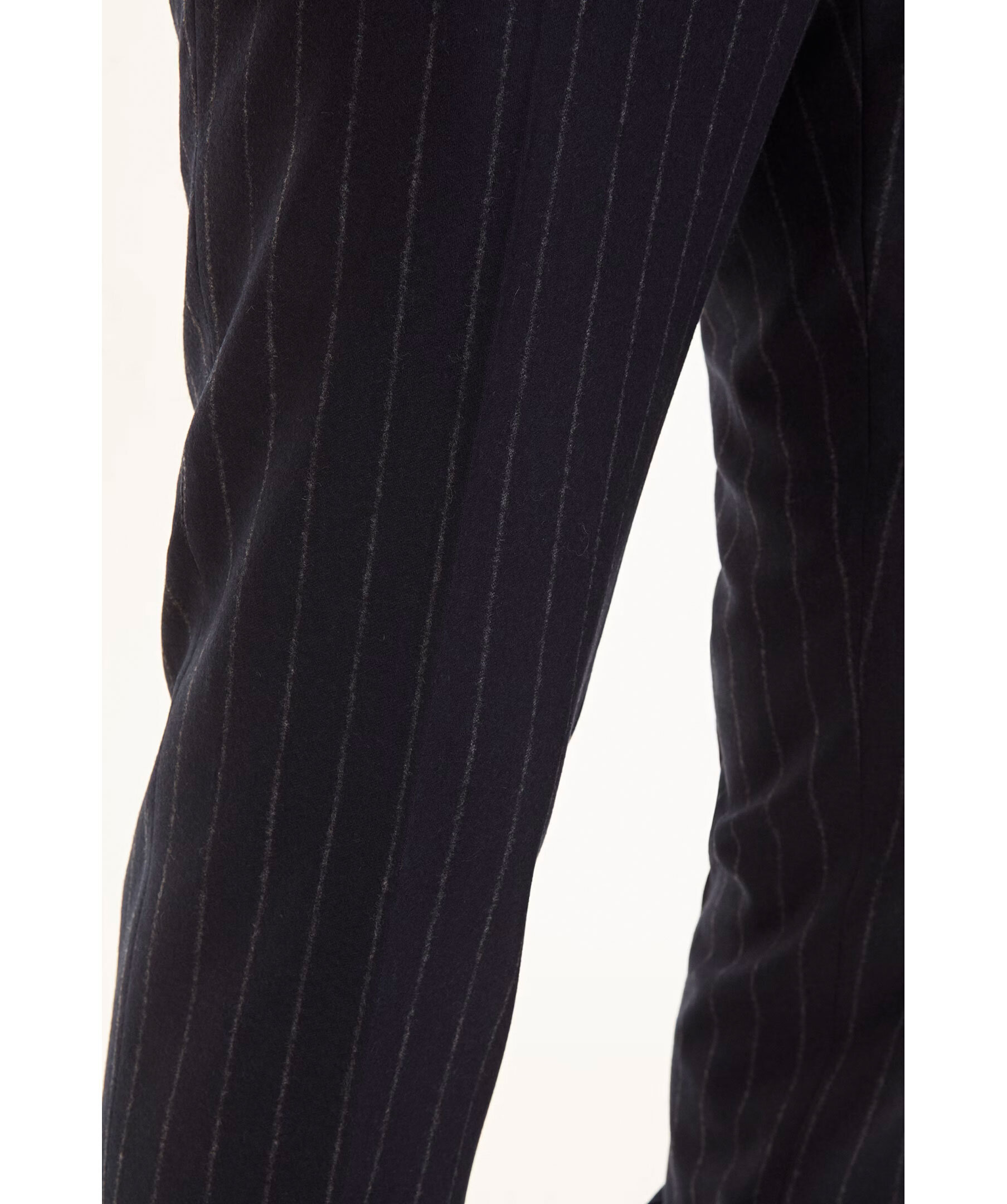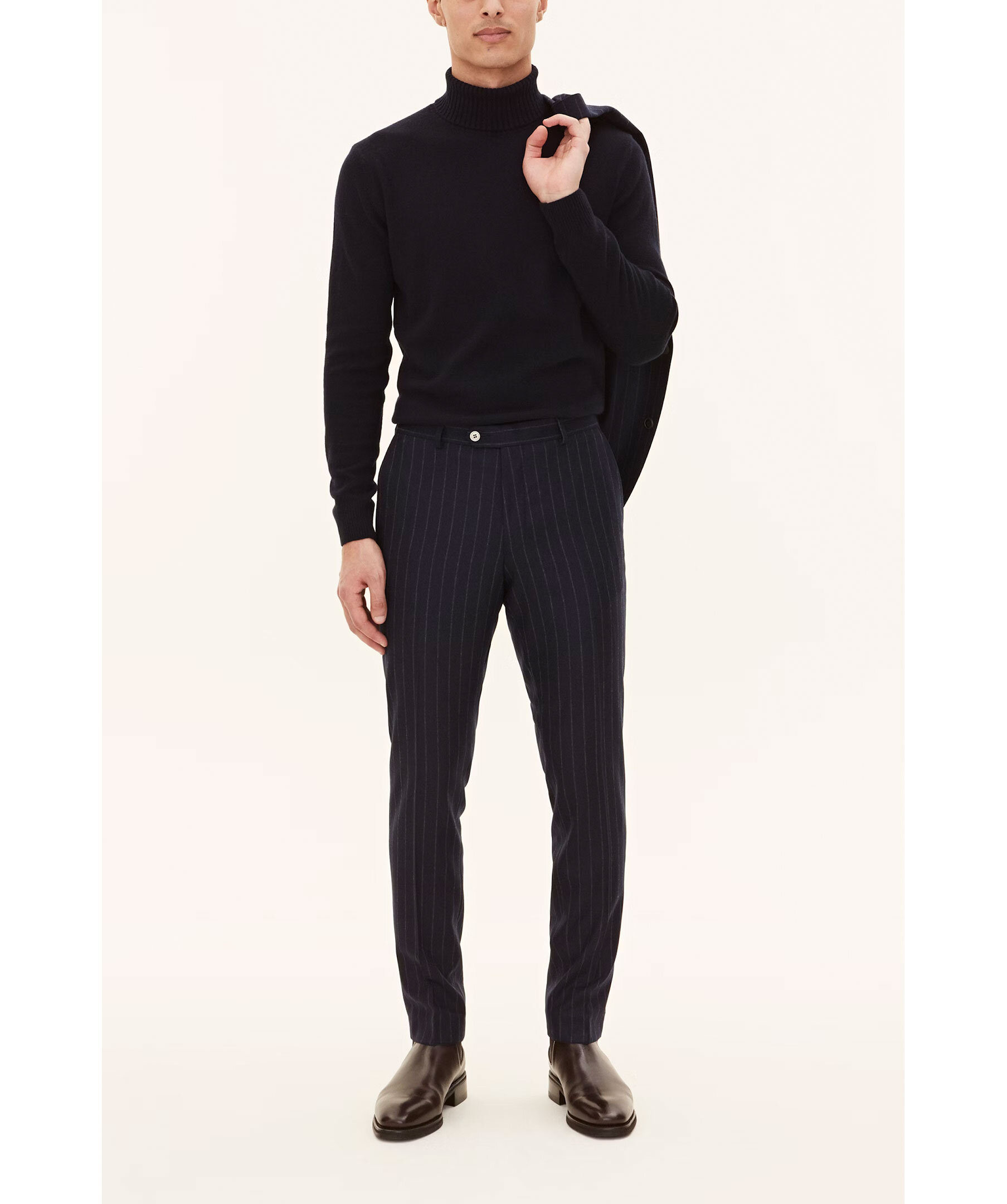 Marinblå pinstripe mönstrade kostymbyxor från Oscar Jacobson. Slim fit modell och tillverkad i 100% ull.