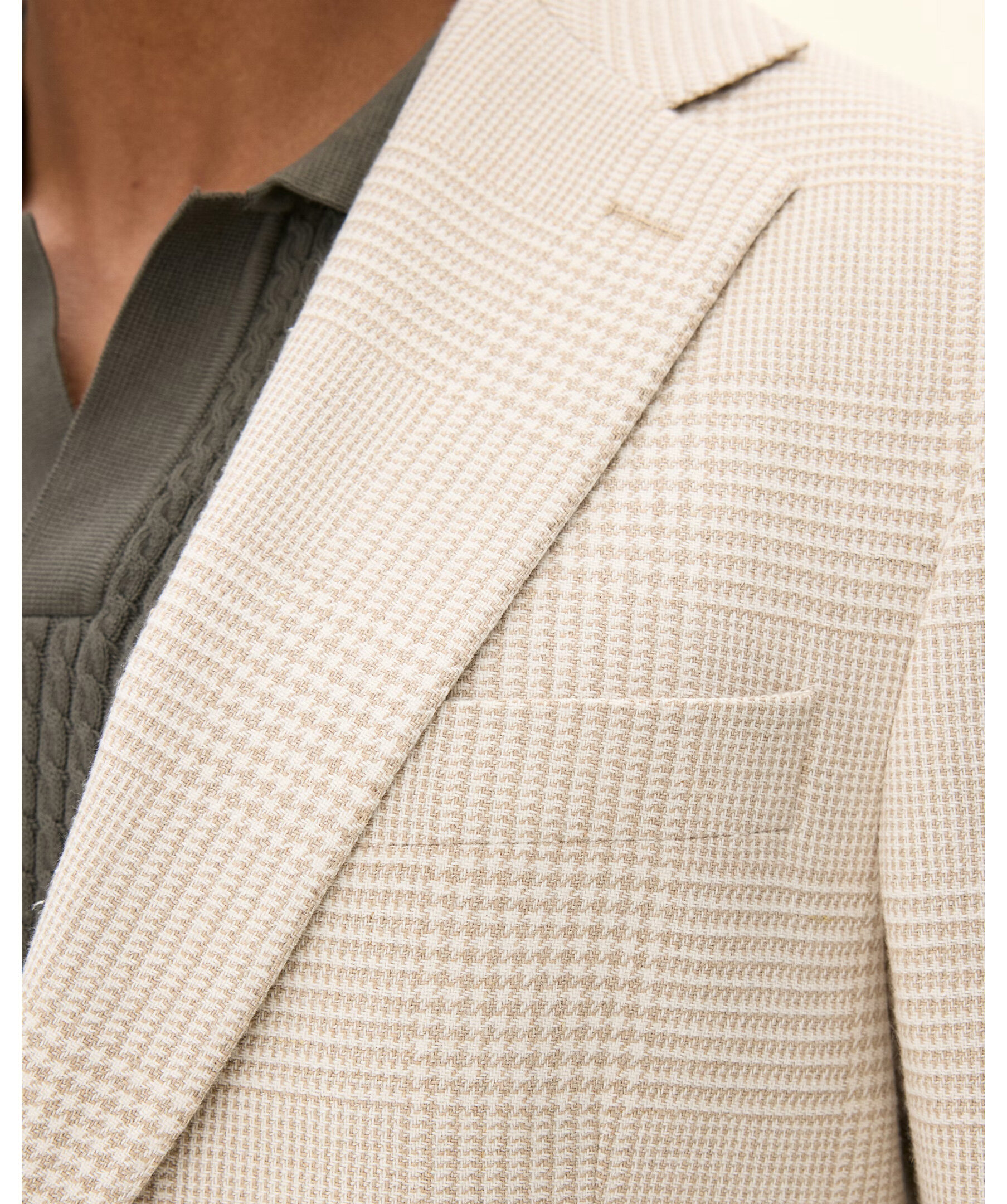 Beige regular fit rutig kavaj från Oscar Jacobson. Kavajen har ett klassiskt rutigt mönster, enkelknäppt design och mjukt konstruerade axlar för en elegant och lättskött stil. Den är fodrad och har ficklock som ger en sofistikerad finish – perfekt för både kontoret och sociala tillfällen.