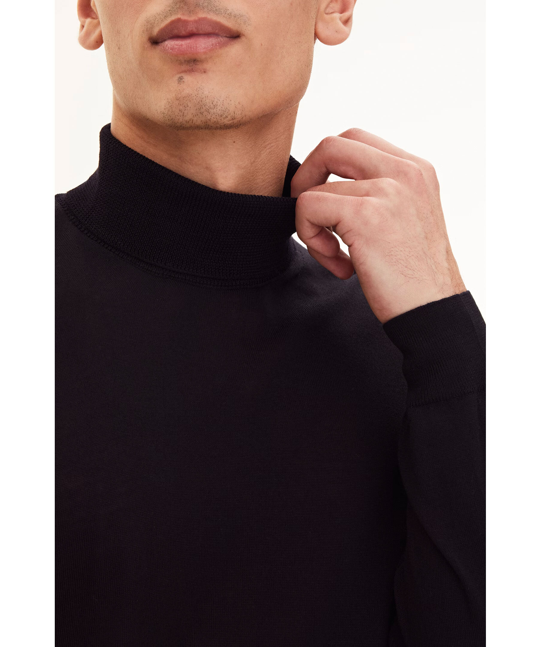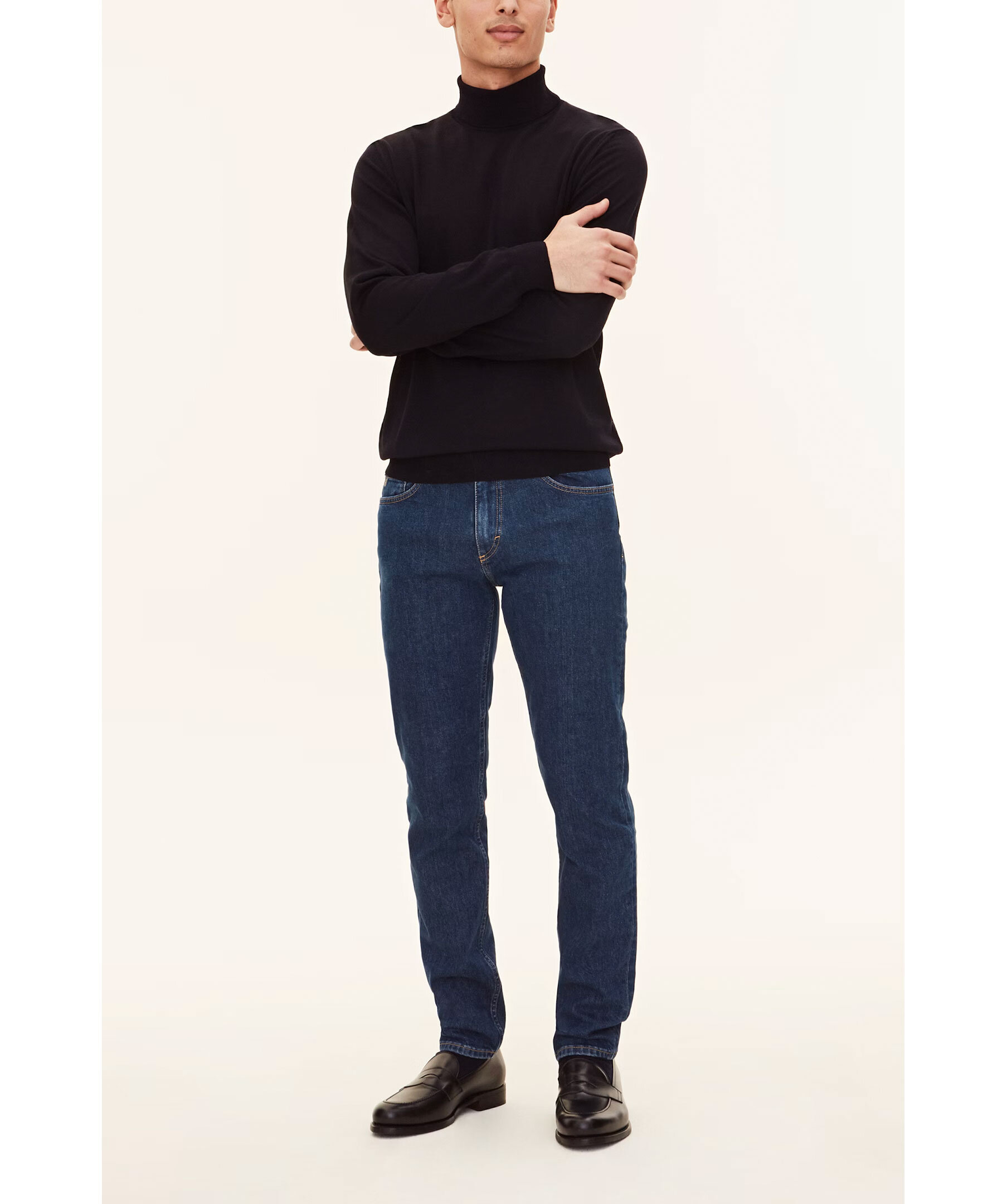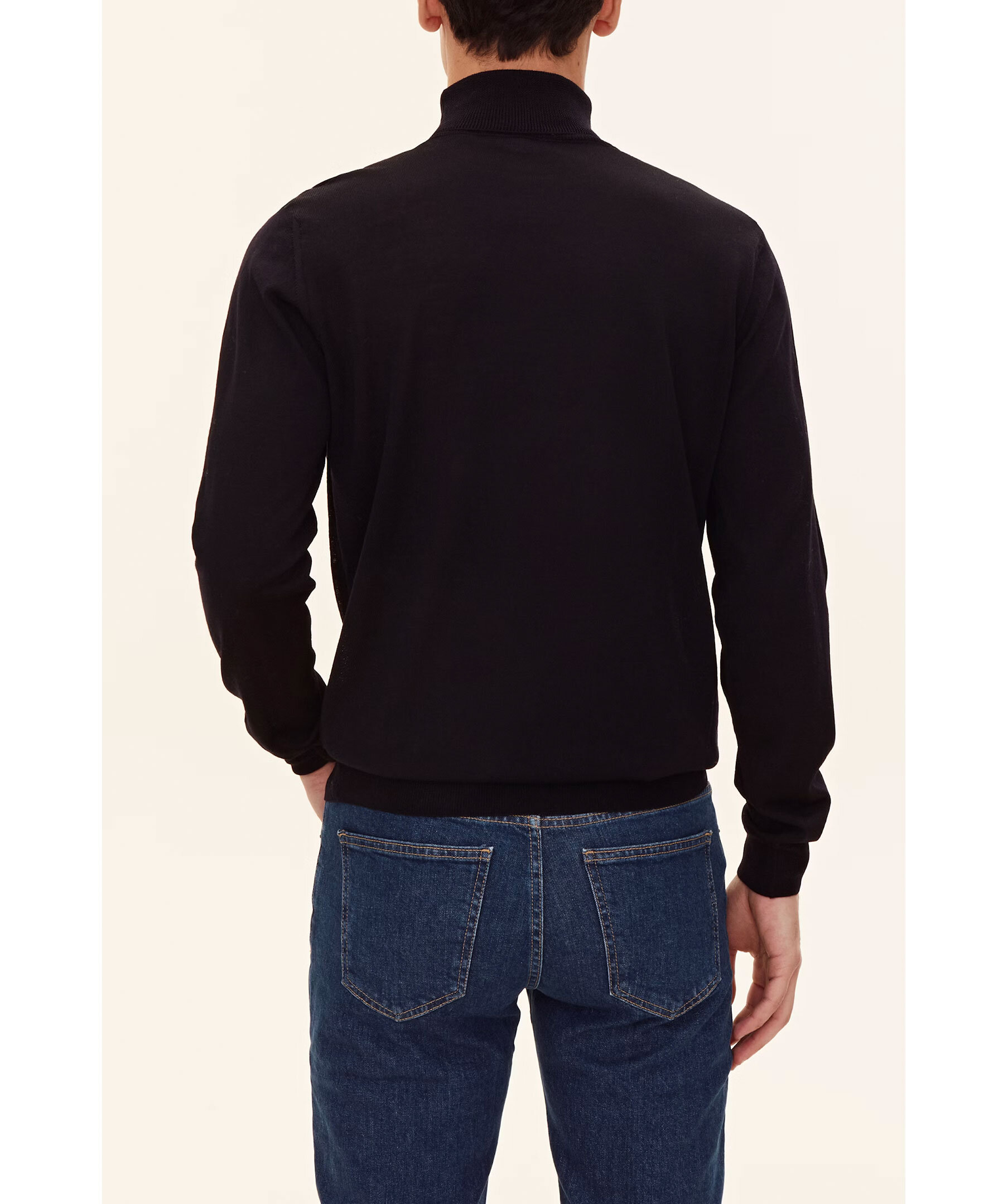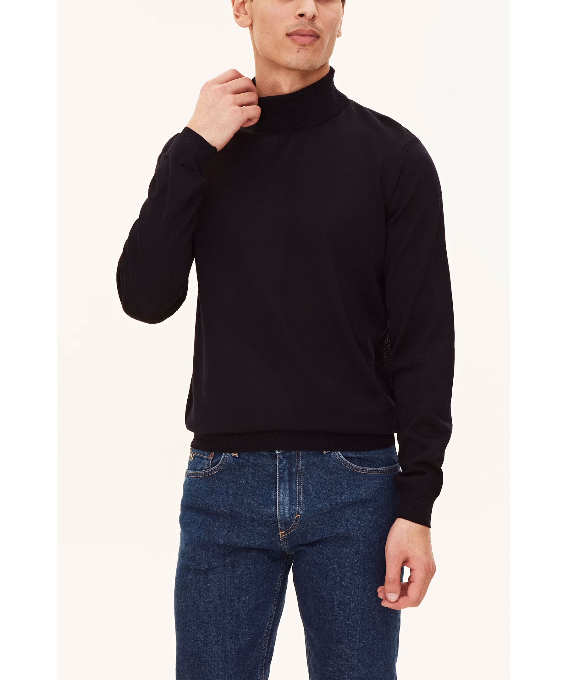 Mörkblå polotröja från Oscar Jacobson. Tillverkad i fin merinoull. Ribbstickade muddar.