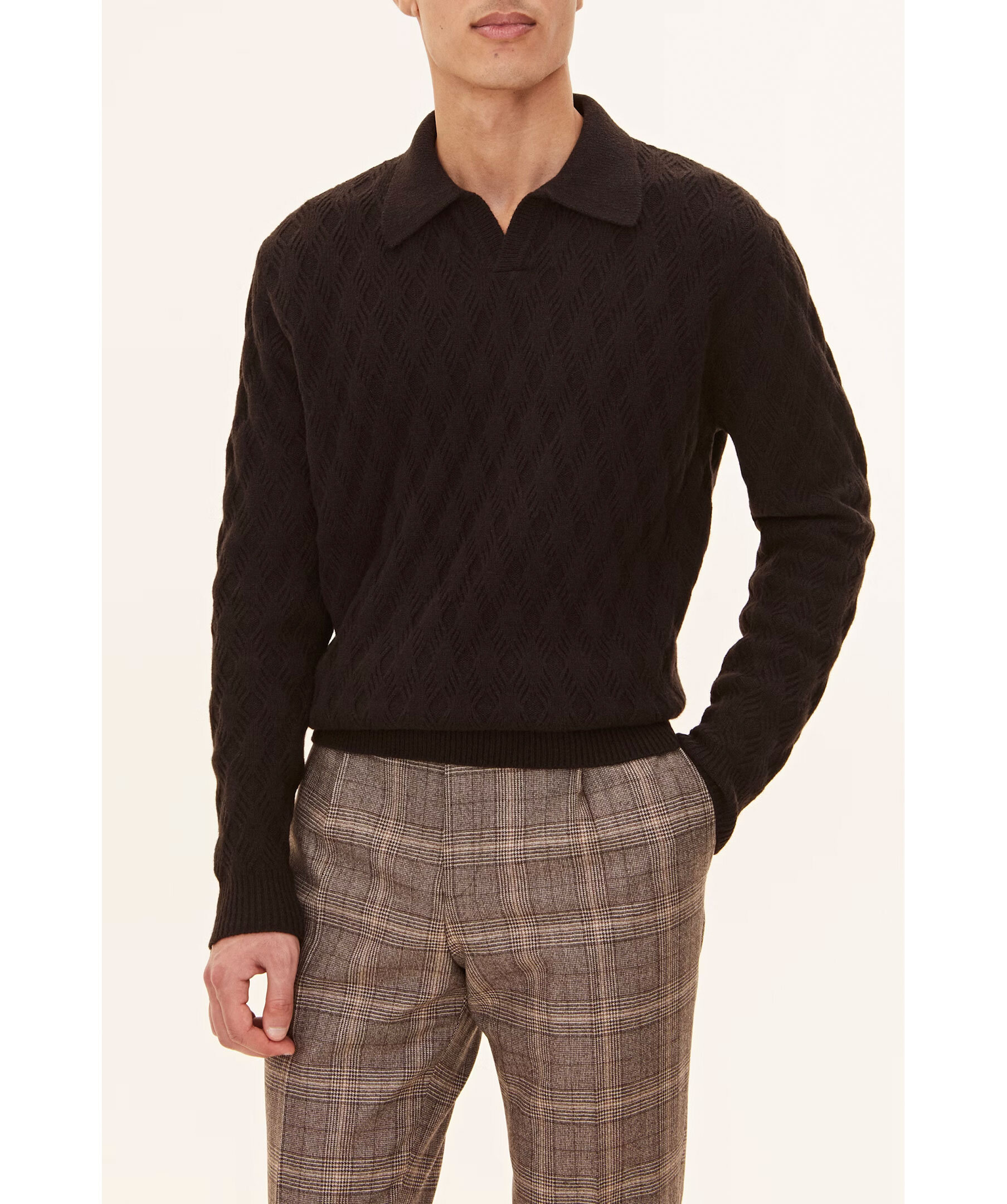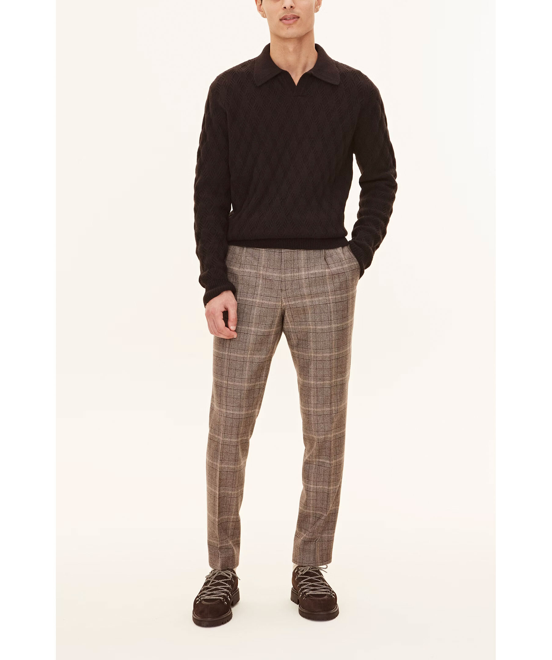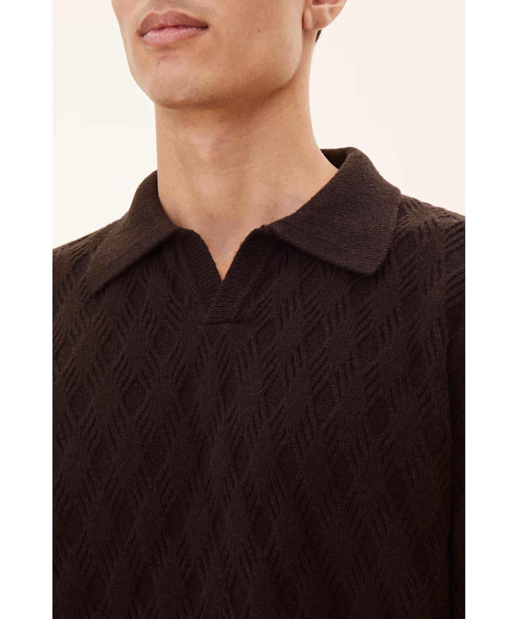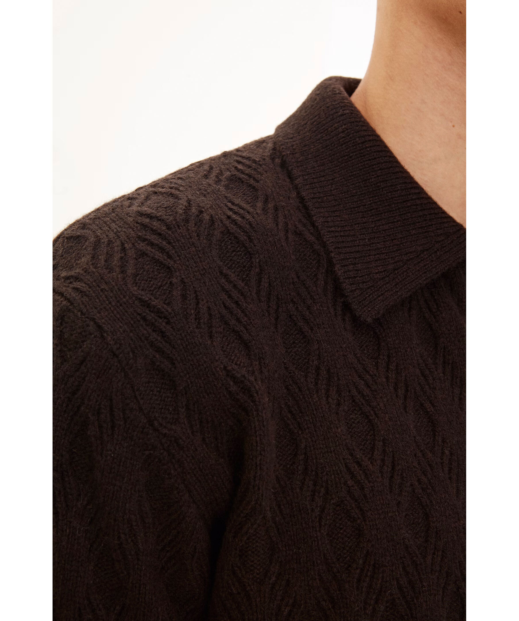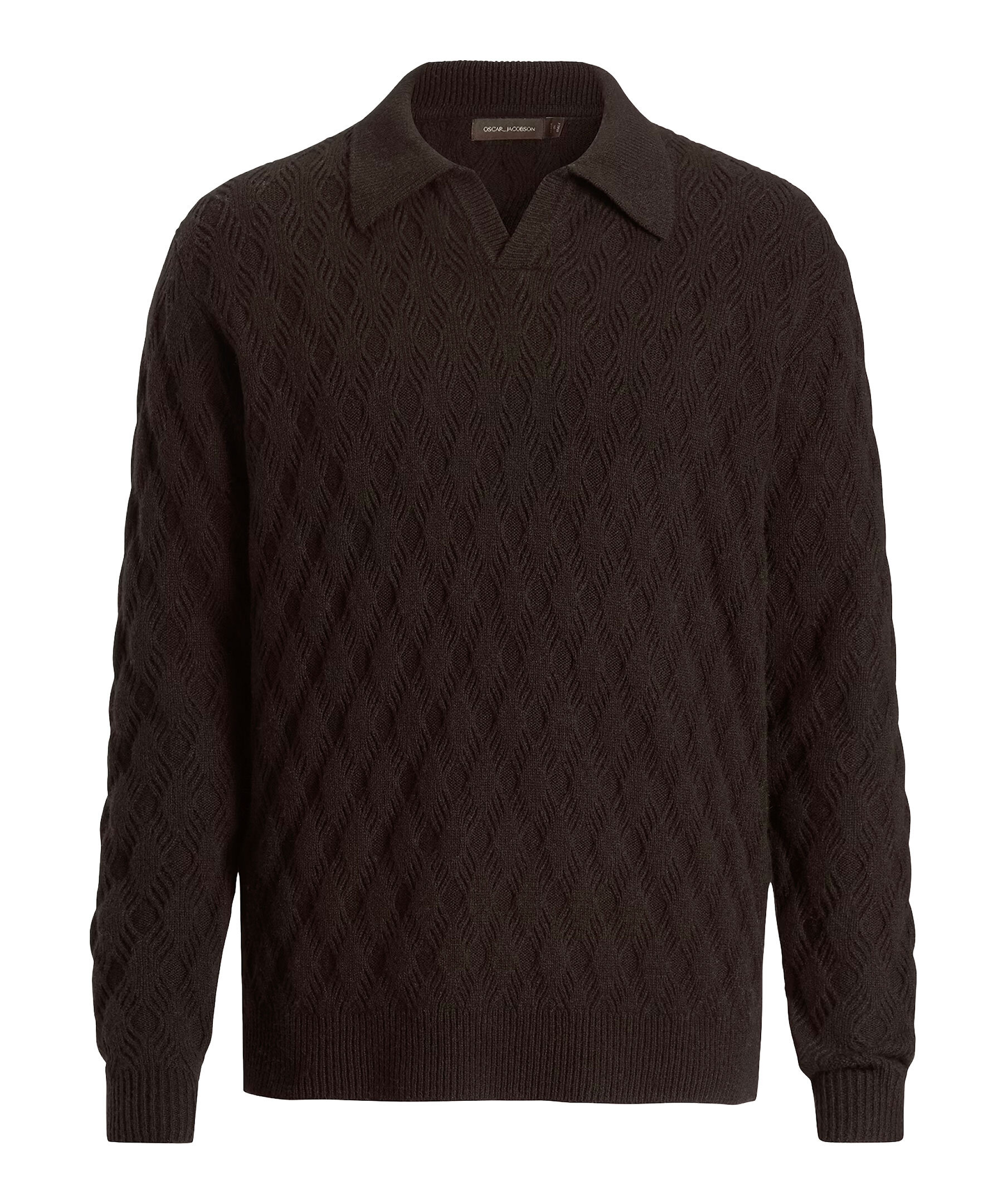 Mörkbrun strukturstickad tröja från Oscar Jacobson. Tröjan har en simple krage med öppen v-ringning. Ribbstickade muddar. Gjord i en ull och kashmirblandning.