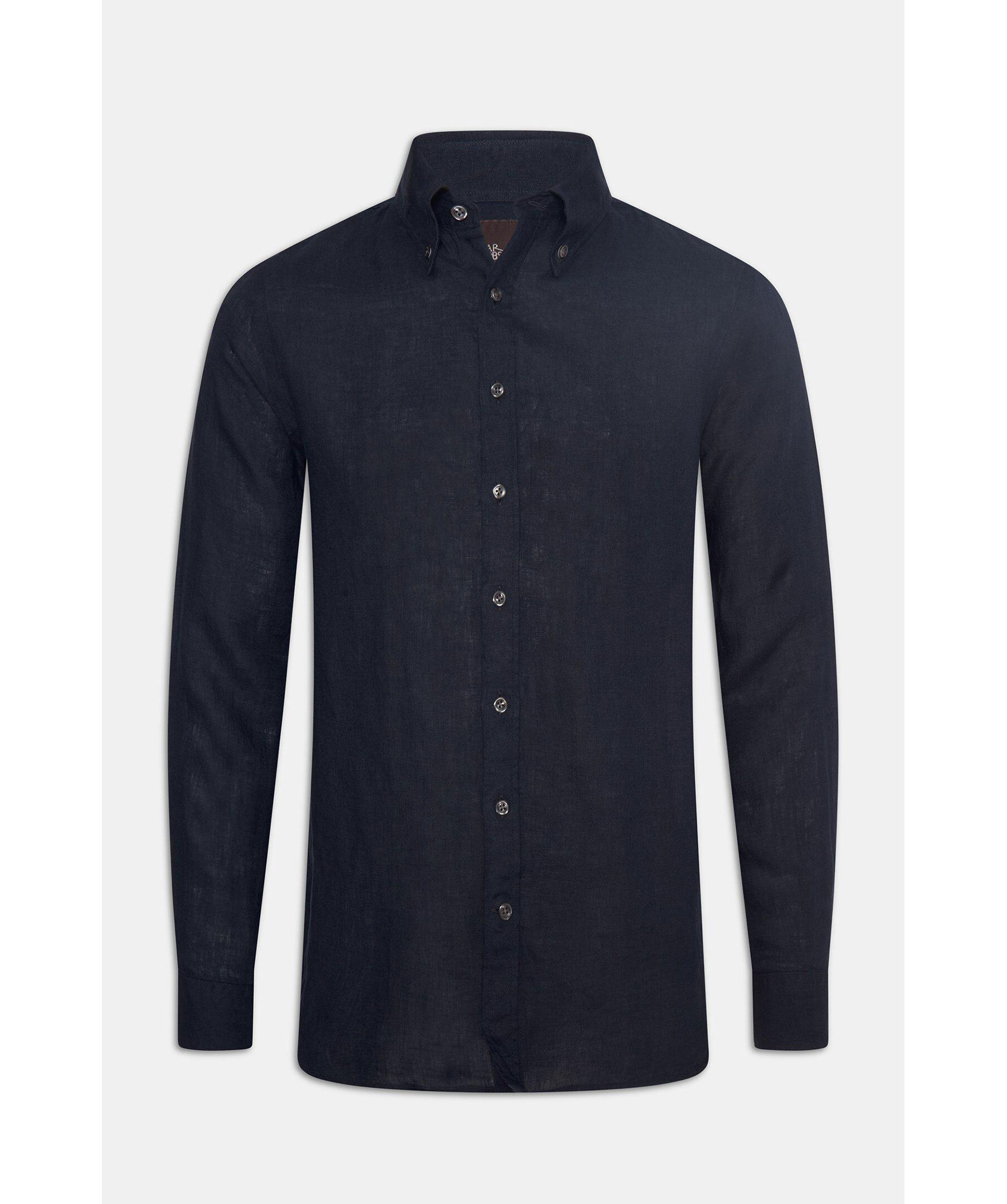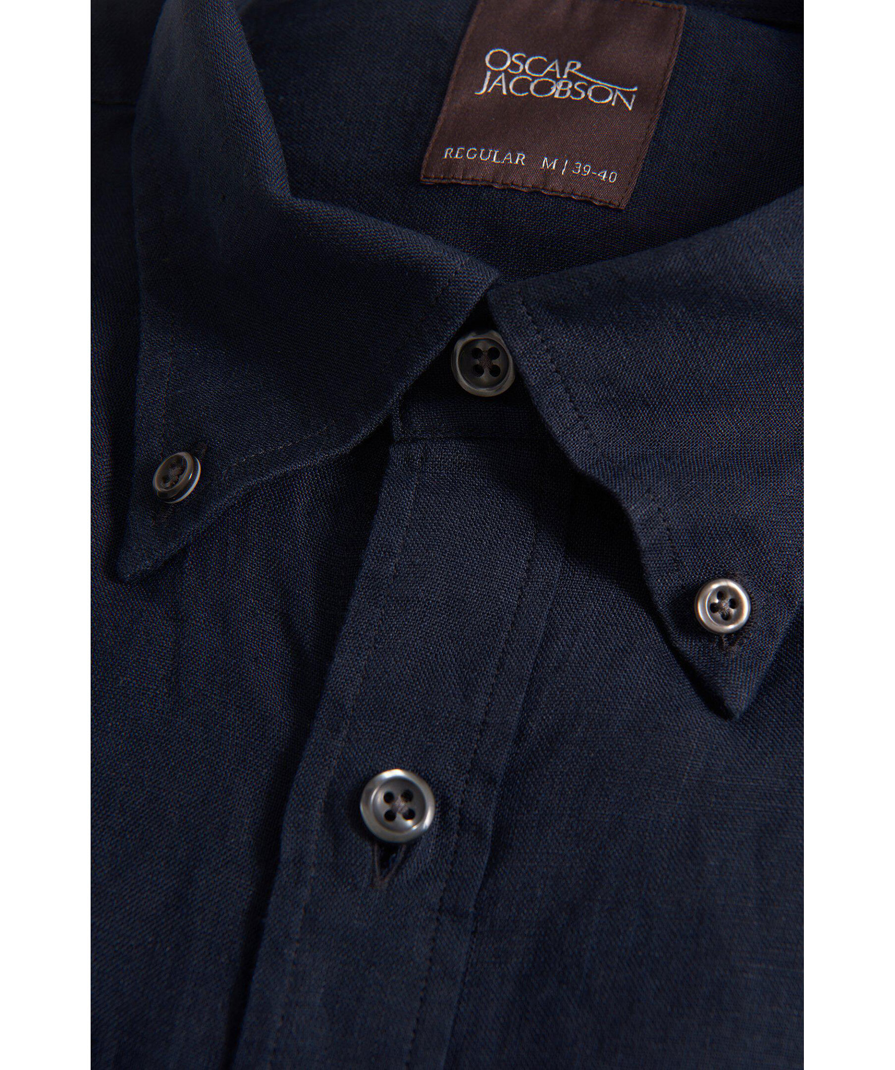Mörkblå linneskjorta från Oscar Jacobson. Skjortan är i regular fit med en ledigare button down krage och enkel manschett. Tillverkad av 100% linen.