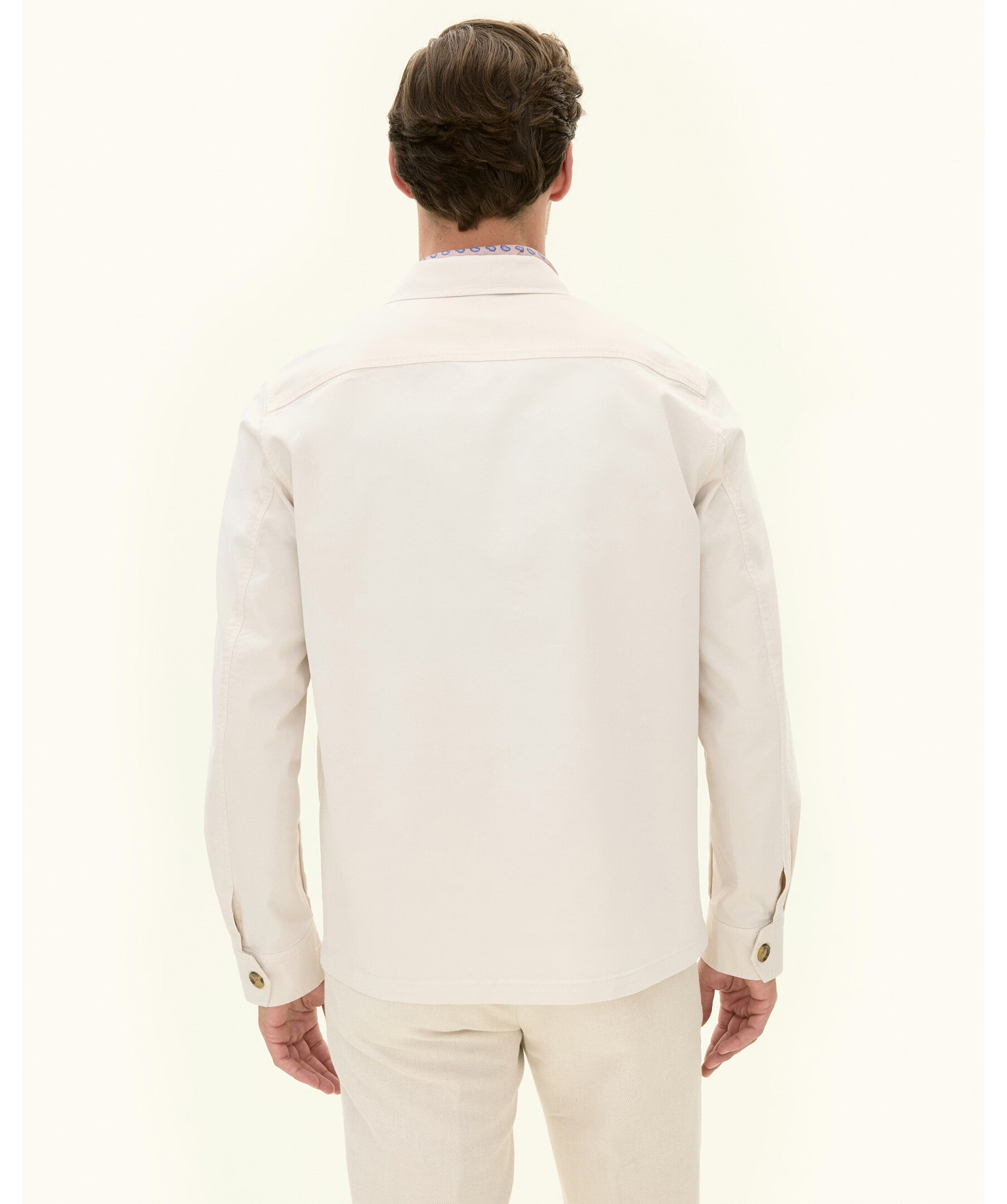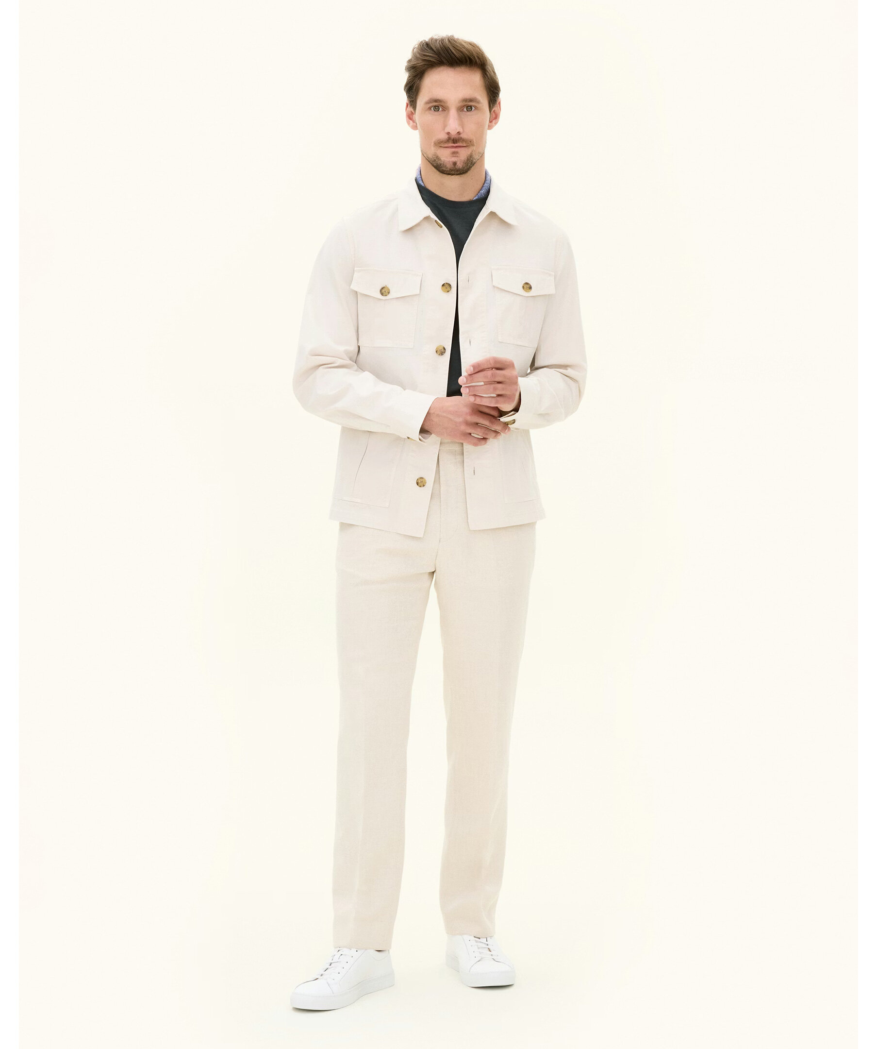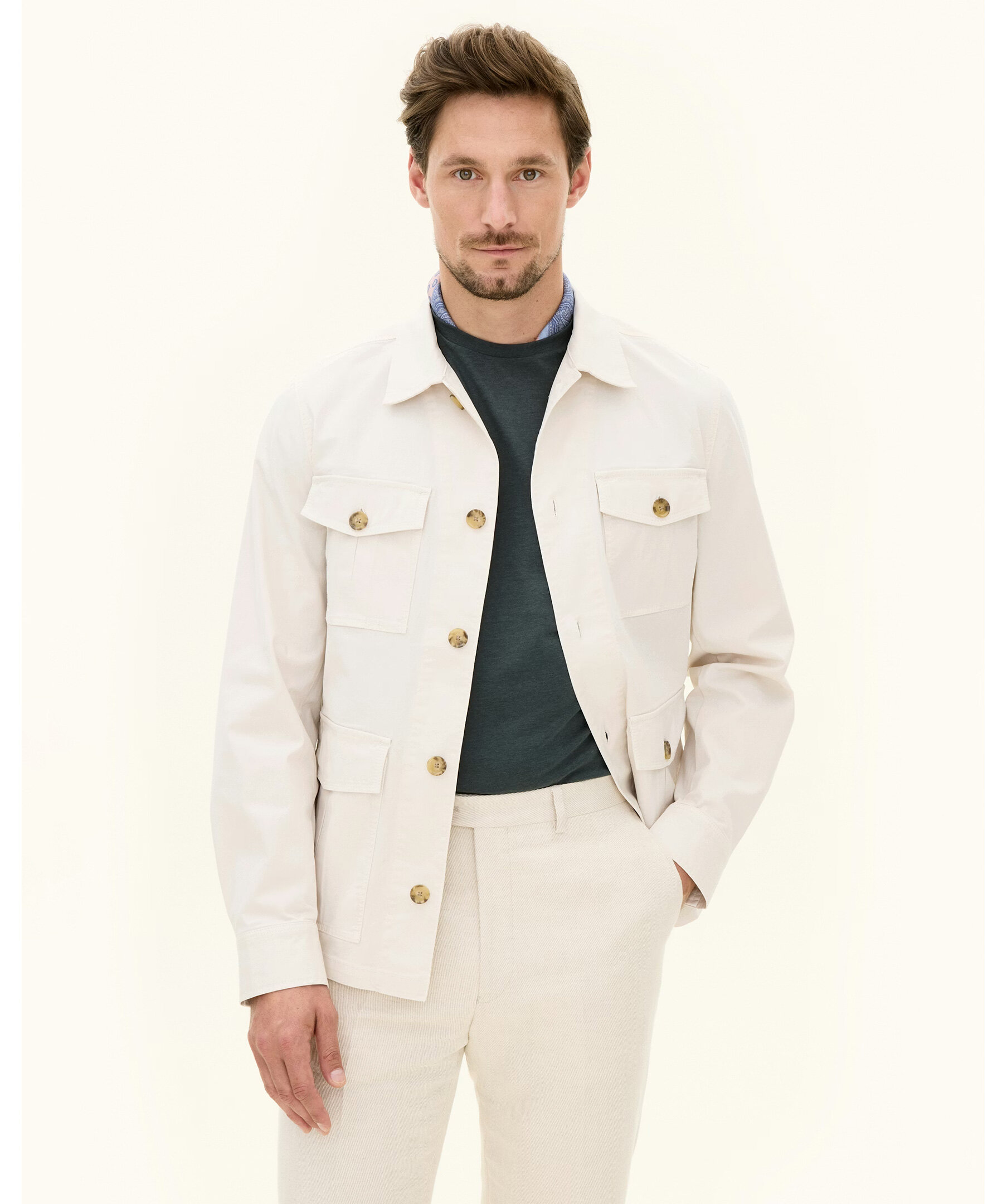 Vit safari overshirt i bomullsstretch från Oscar Jacobson. Overshirten har en klassisk safari‑inspirerad design med knappstängning framtill och flera fickor med lock, vilket erbjuder både stil och funktion i en avslappnad, mångsidig modell. Tillverkad i en mjuk bomullsblandning med stretch som ger rörelsefrihet och komfort — perfekt att bäras som ett lätt ytterlager till jeans, chinos eller skjorta.