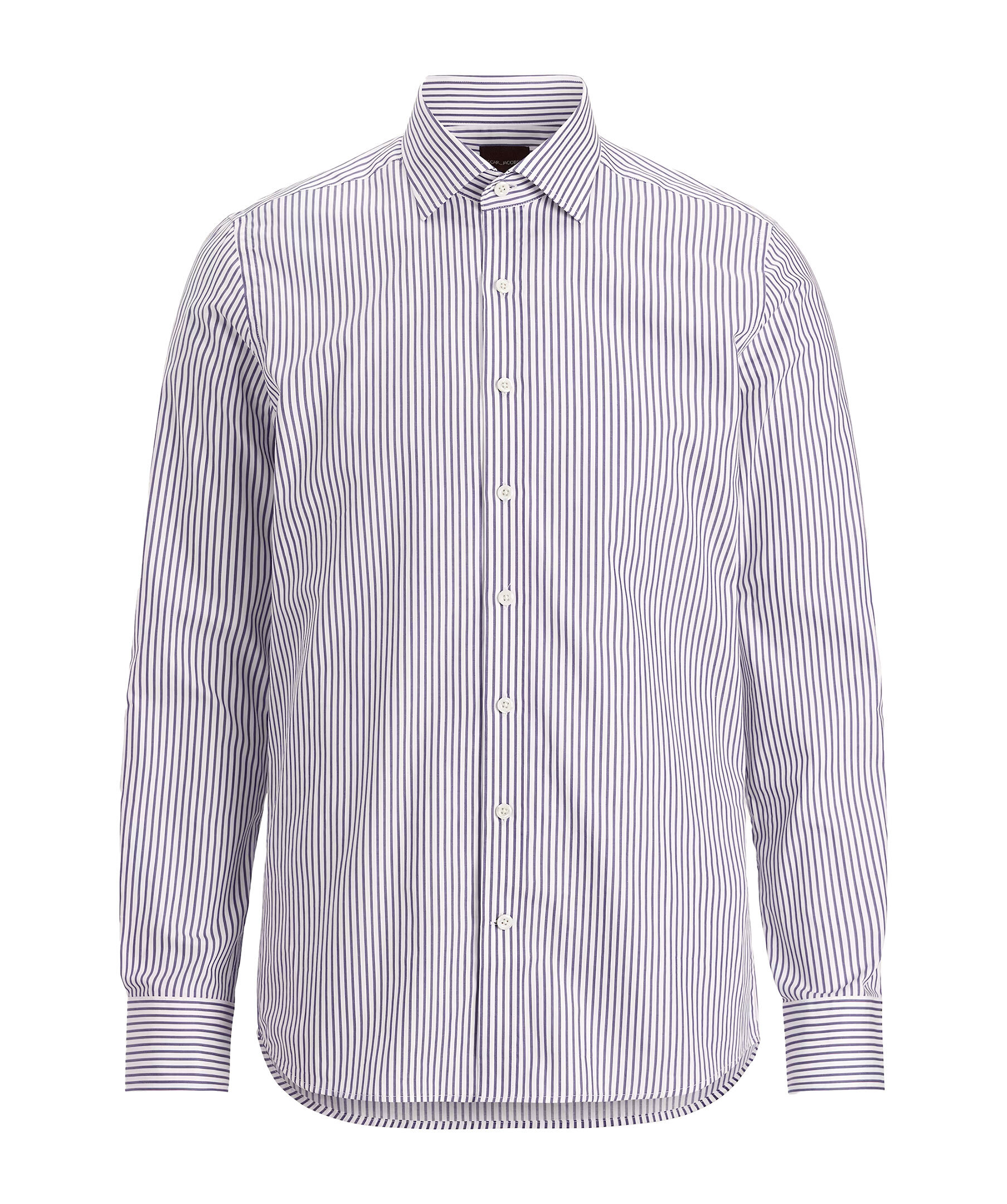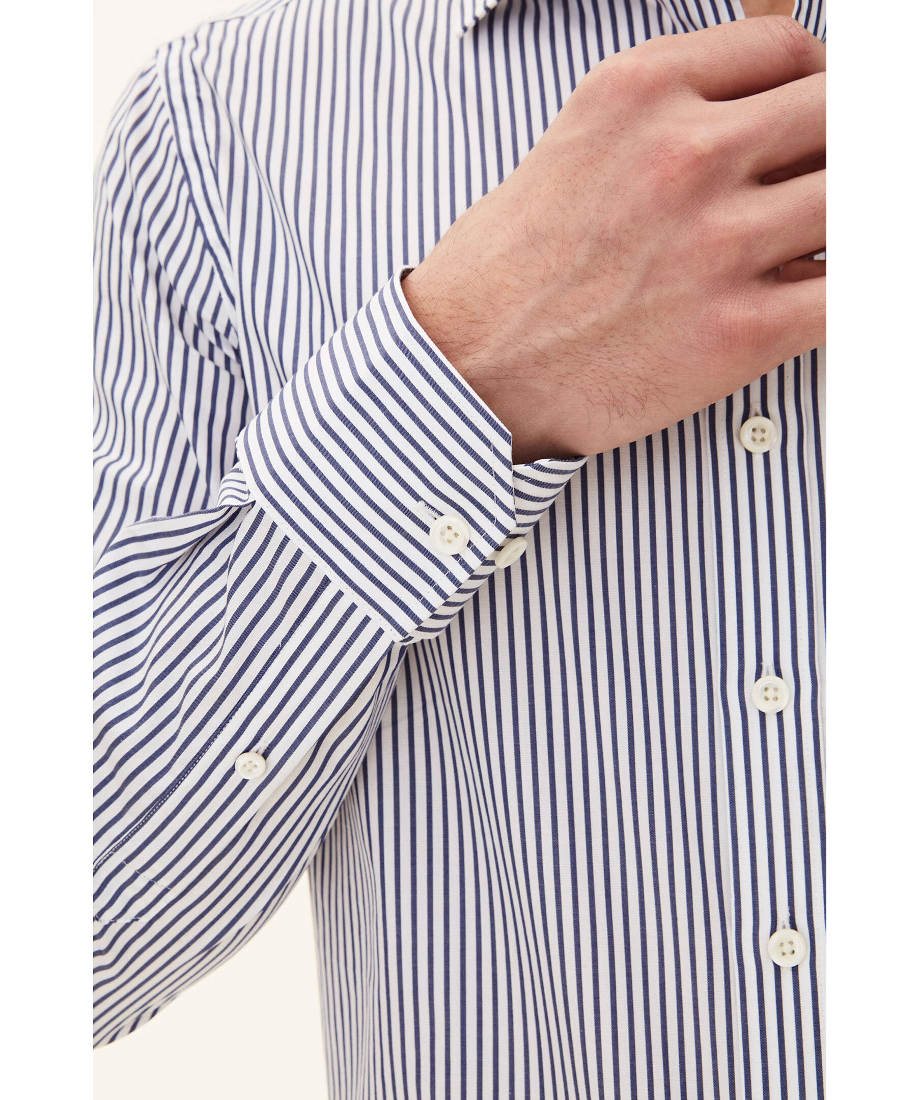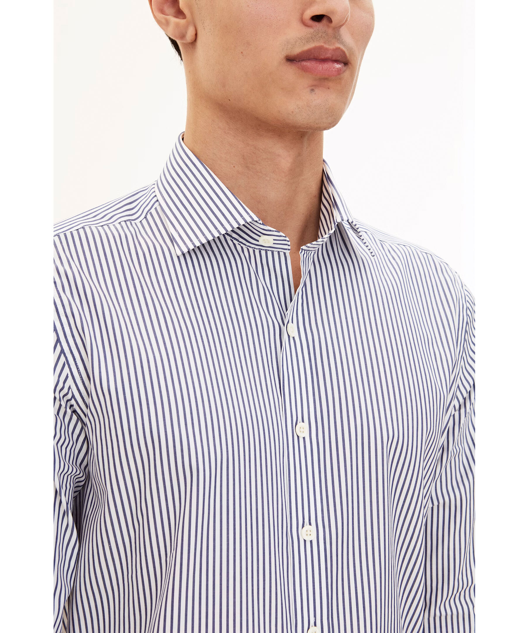 Randig skjorta i blått och vitt från Oscar Jacobson. Slim fit modell med cut away krage och enkel manschett. Tillverkad av 100% bomullspoplin med ränder.