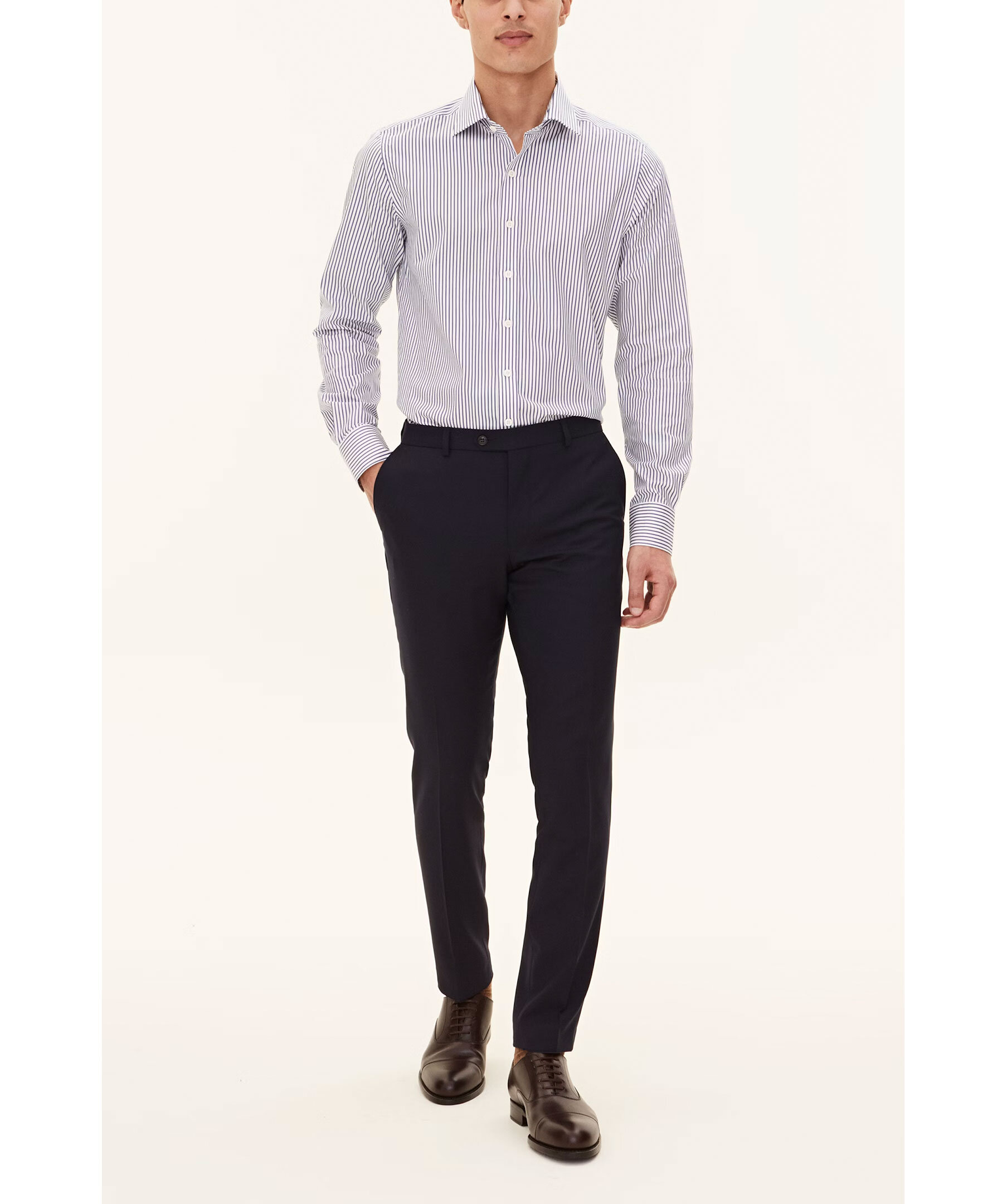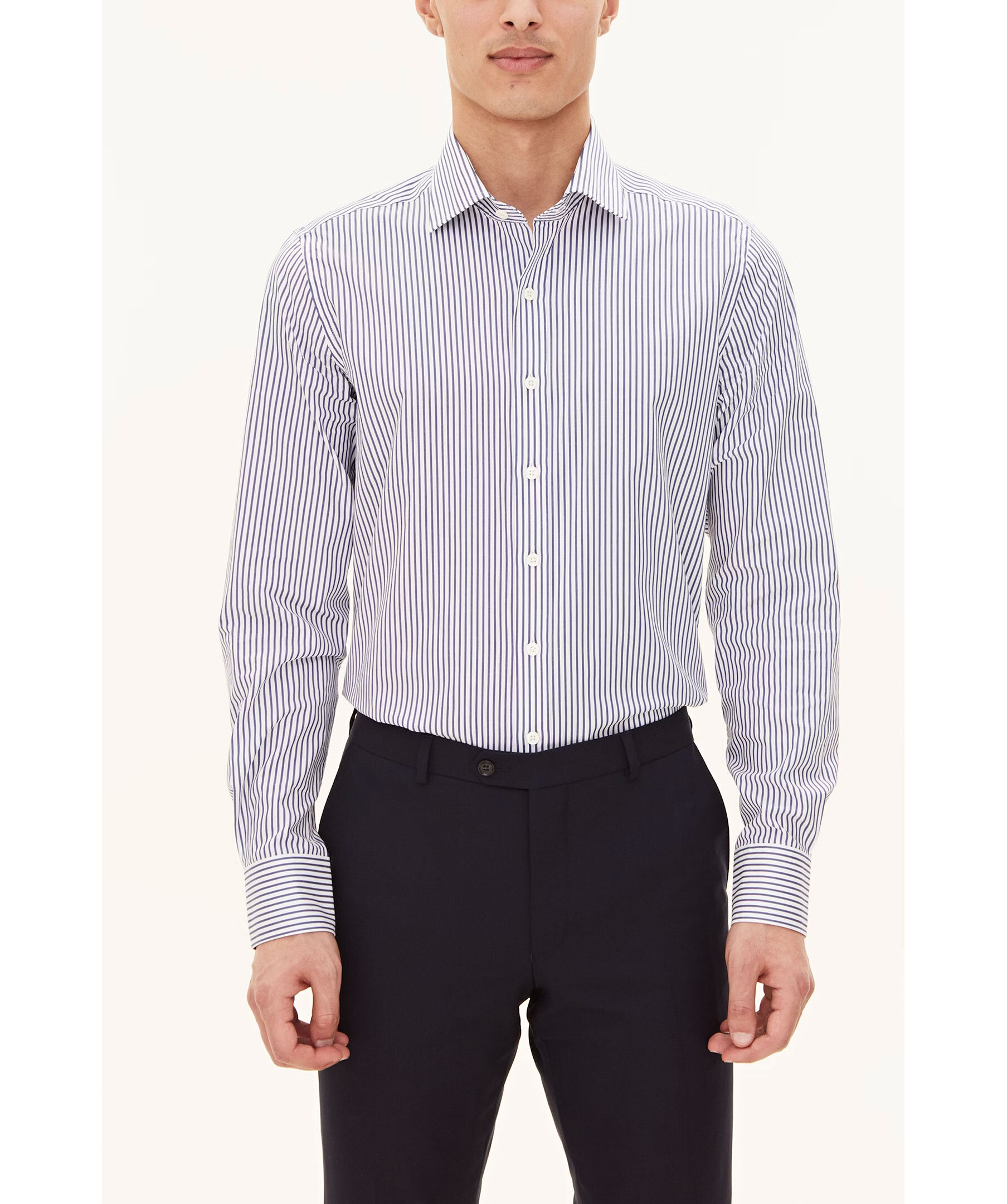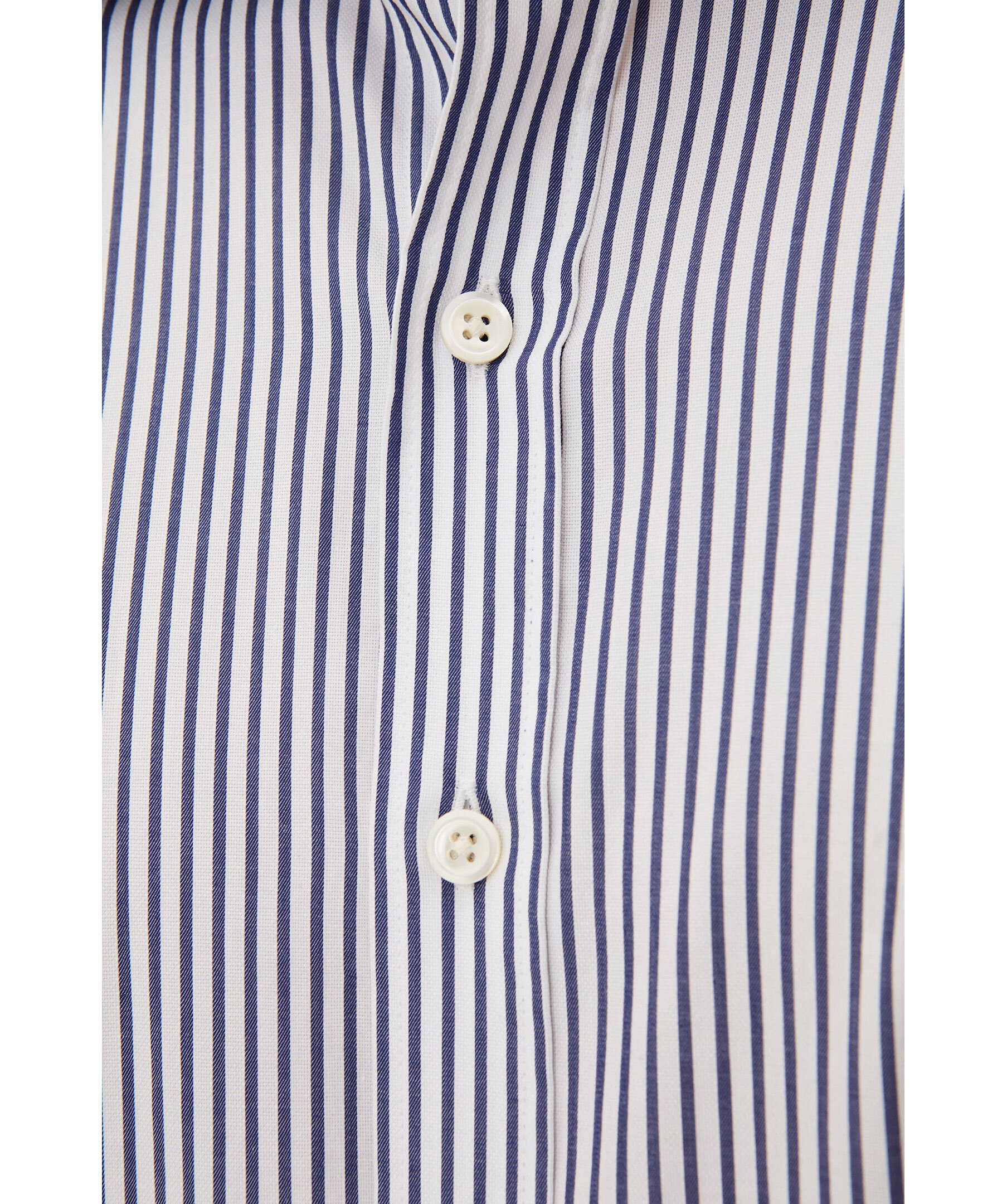 Randig skjorta i blått och vitt från Oscar Jacobson. Slim fit modell med cut away krage och enkel manschett. Tillverkad av 100% bomullspoplin med ränder.