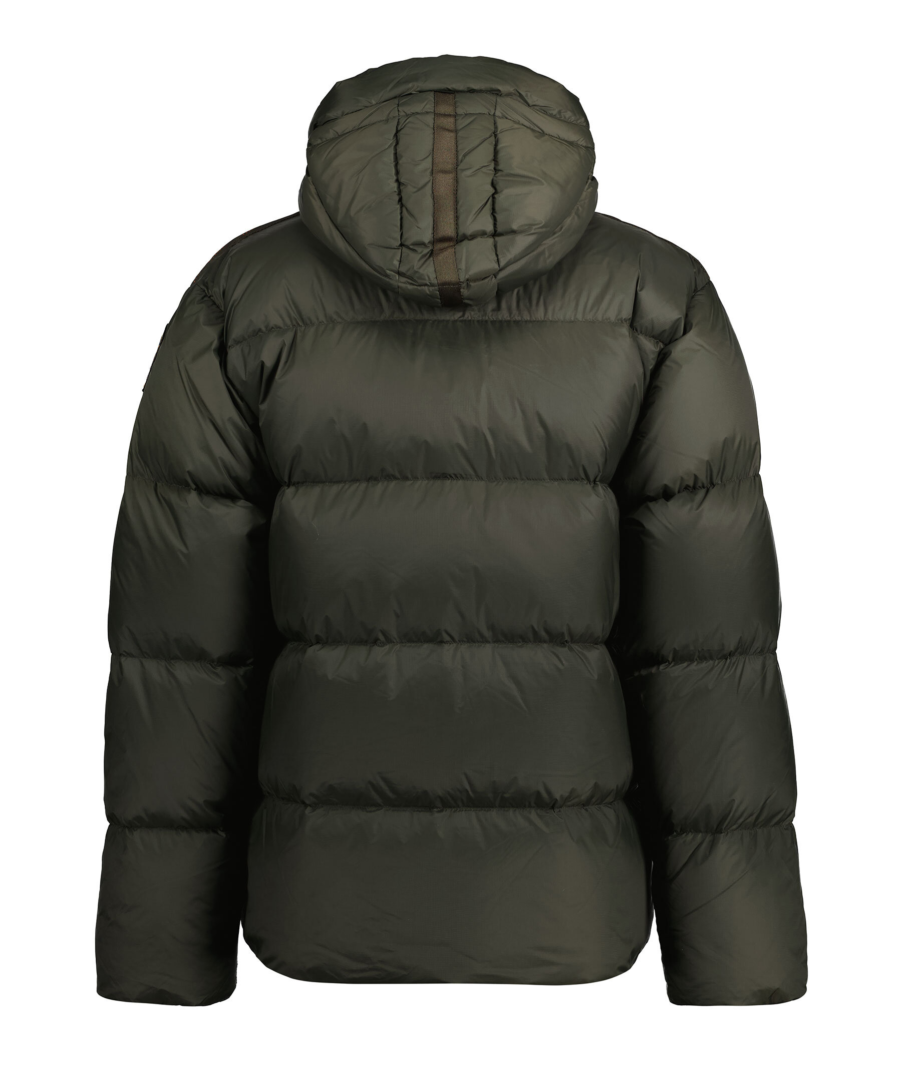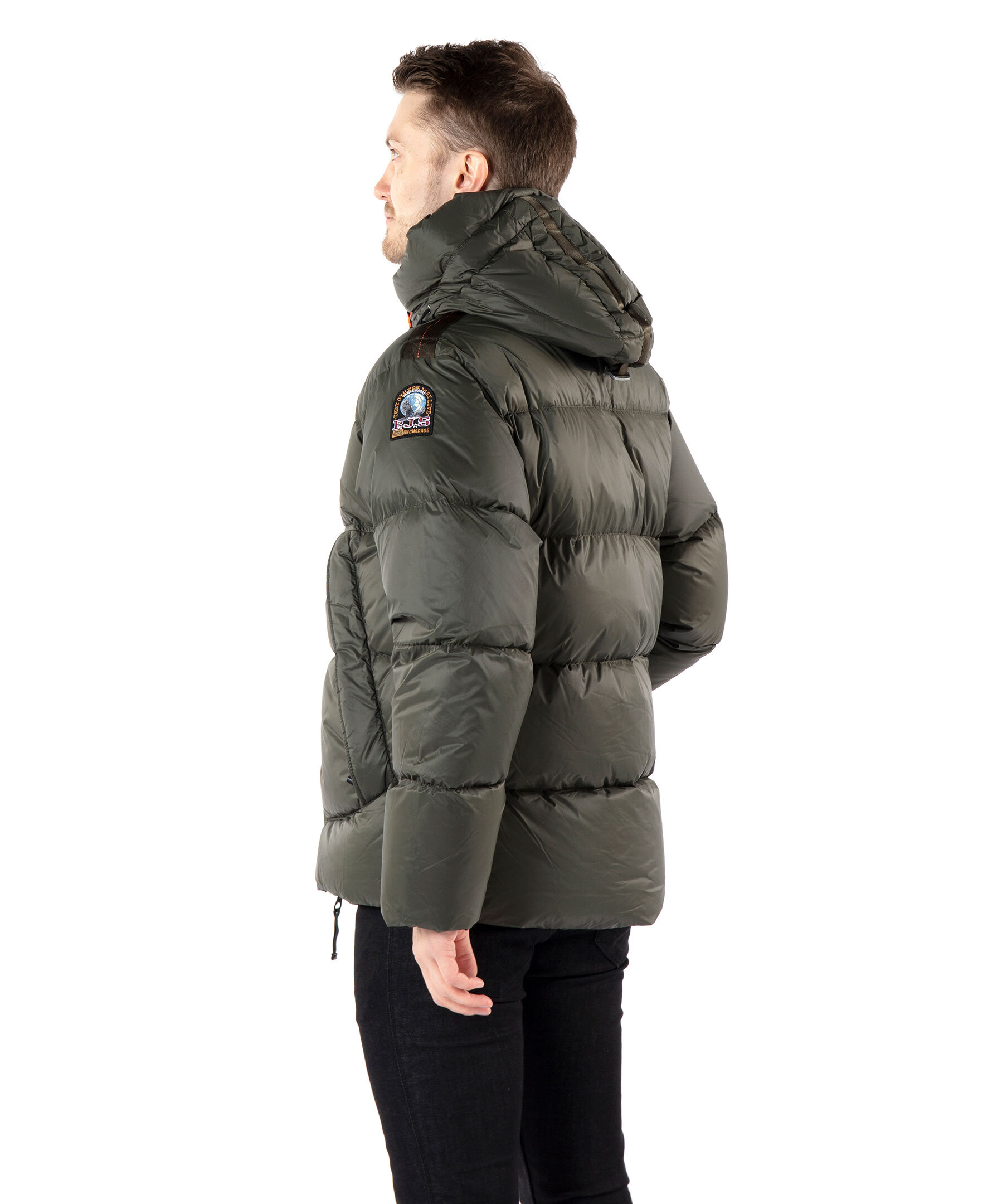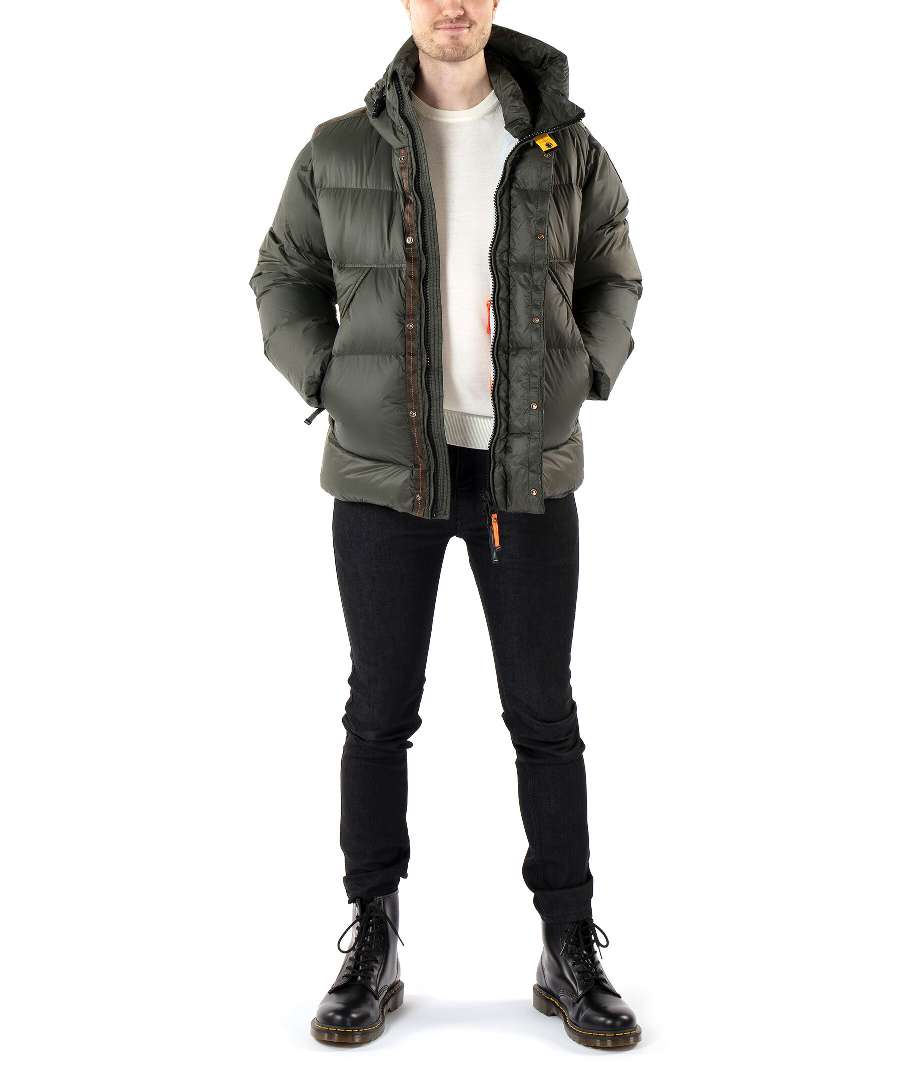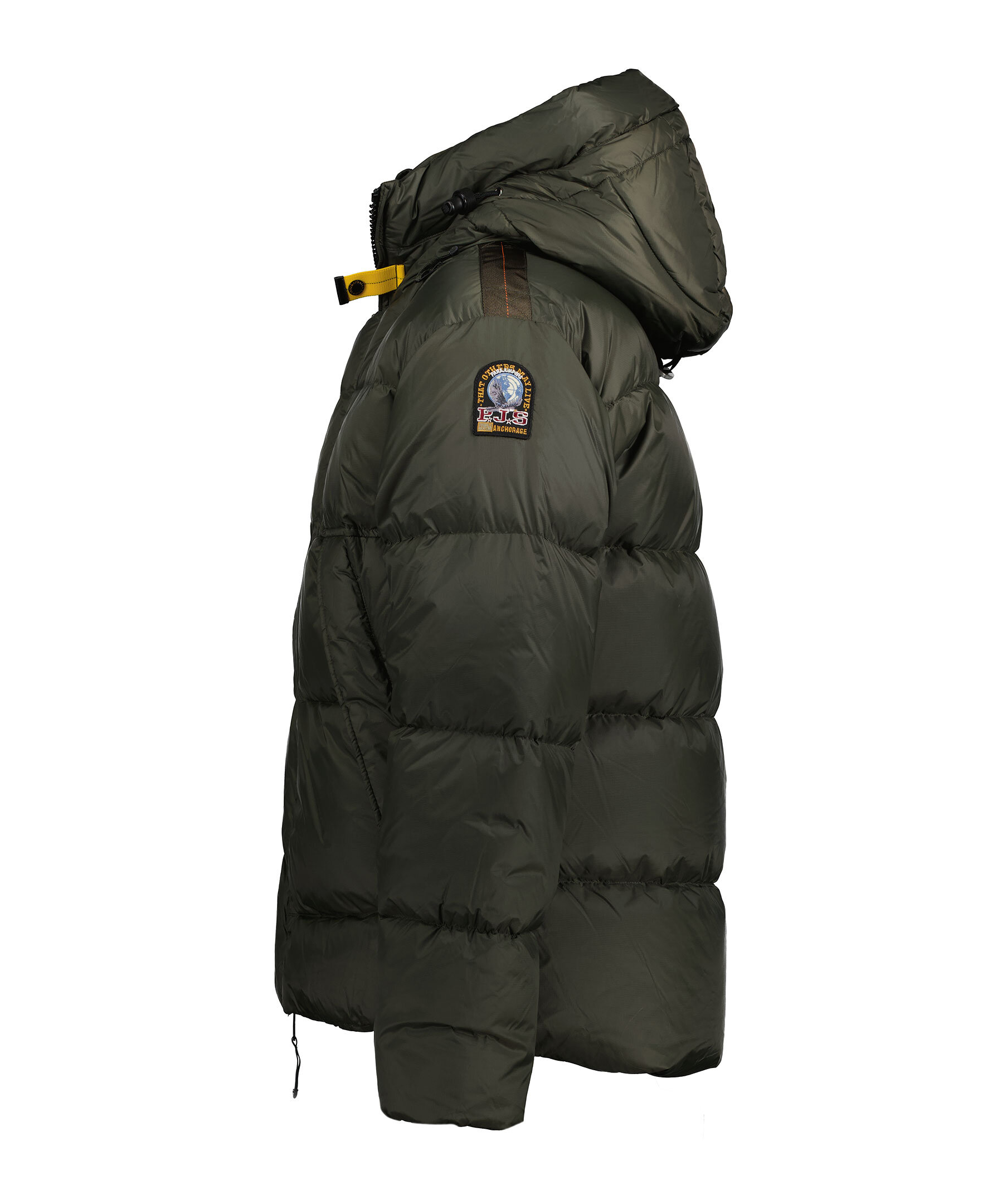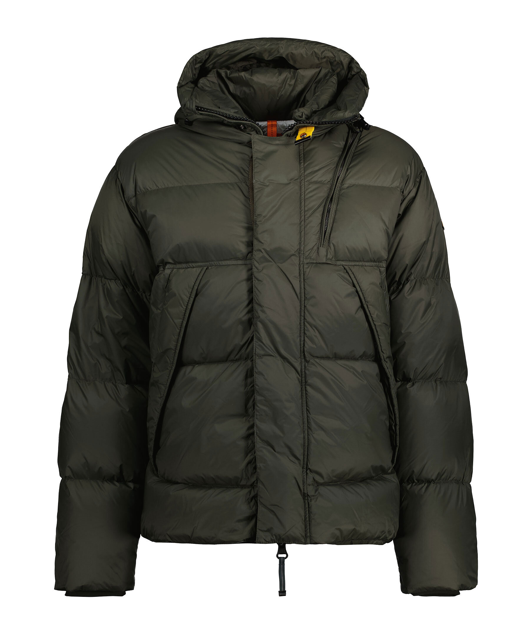 Skogsgrön kort dunjacka från Parajumpers. Yttermaterial i polyesterblandning. Jackan har två framfickor med dold dragkedja, en snedställd bröstficka med dragkedja samt två innerfickor, en i meshtyg och en med dragkedja. Jackan stängs med en dold tvåvägsdragkedja och tryckknappar. Luva med dragsko, hög krage och gul flärp med tryckknapp på kragen. PJ's tygpatch på vänster överärm. Modellen är 188cm lång och har på sig storlek M.