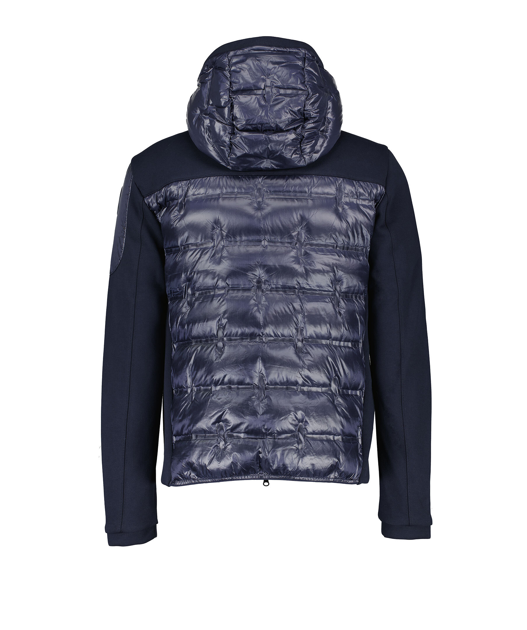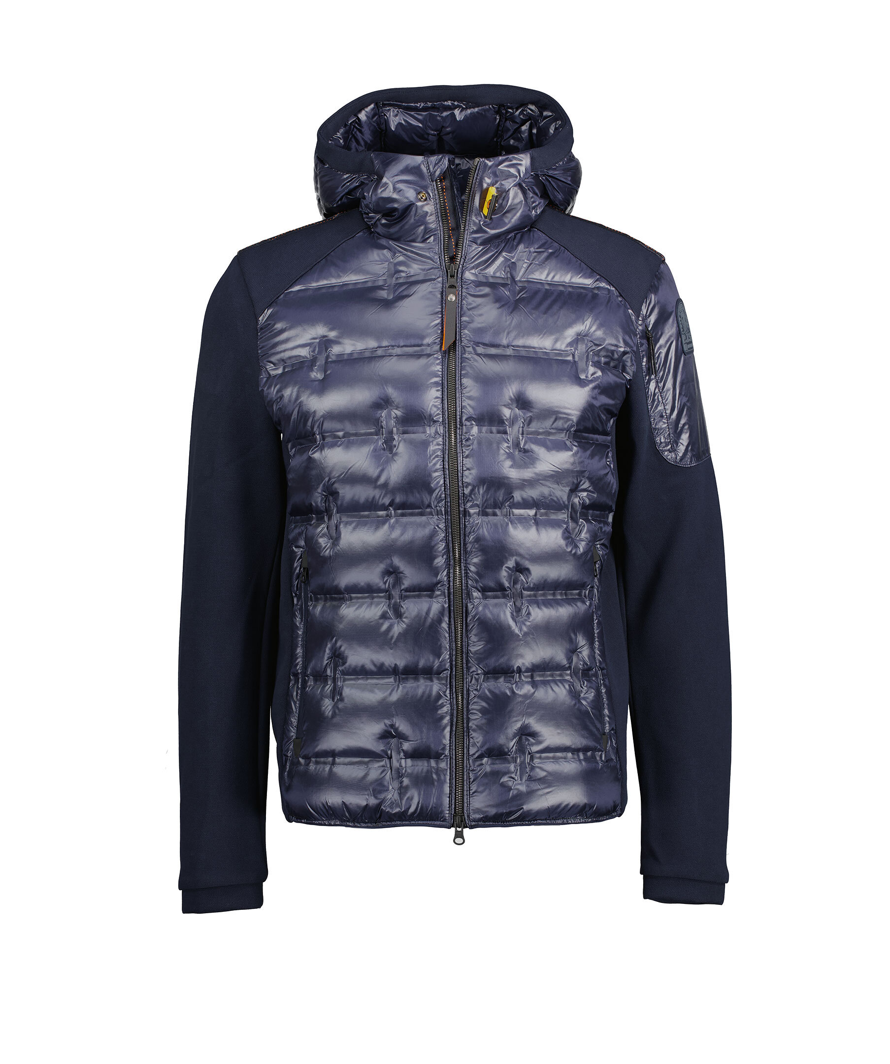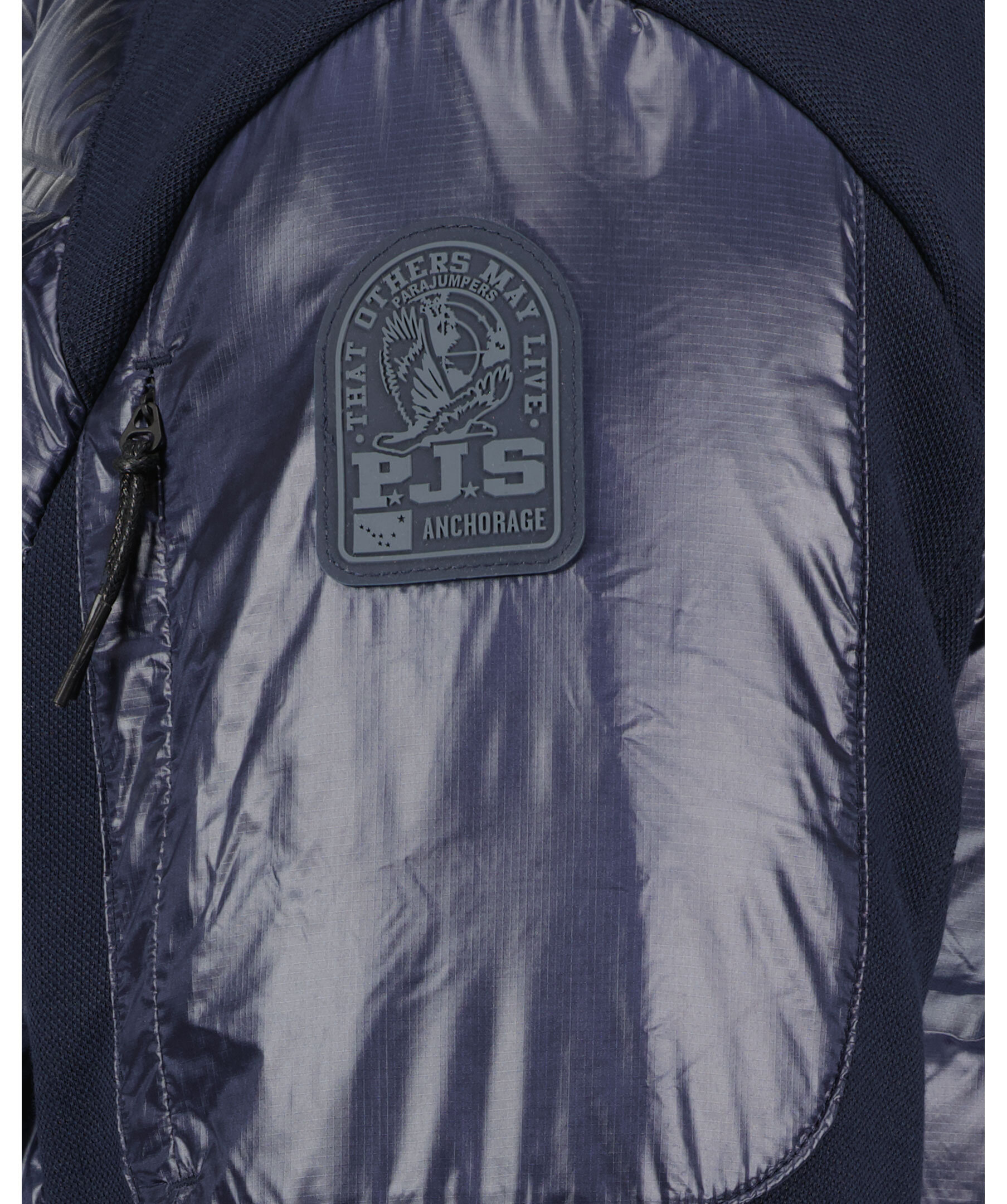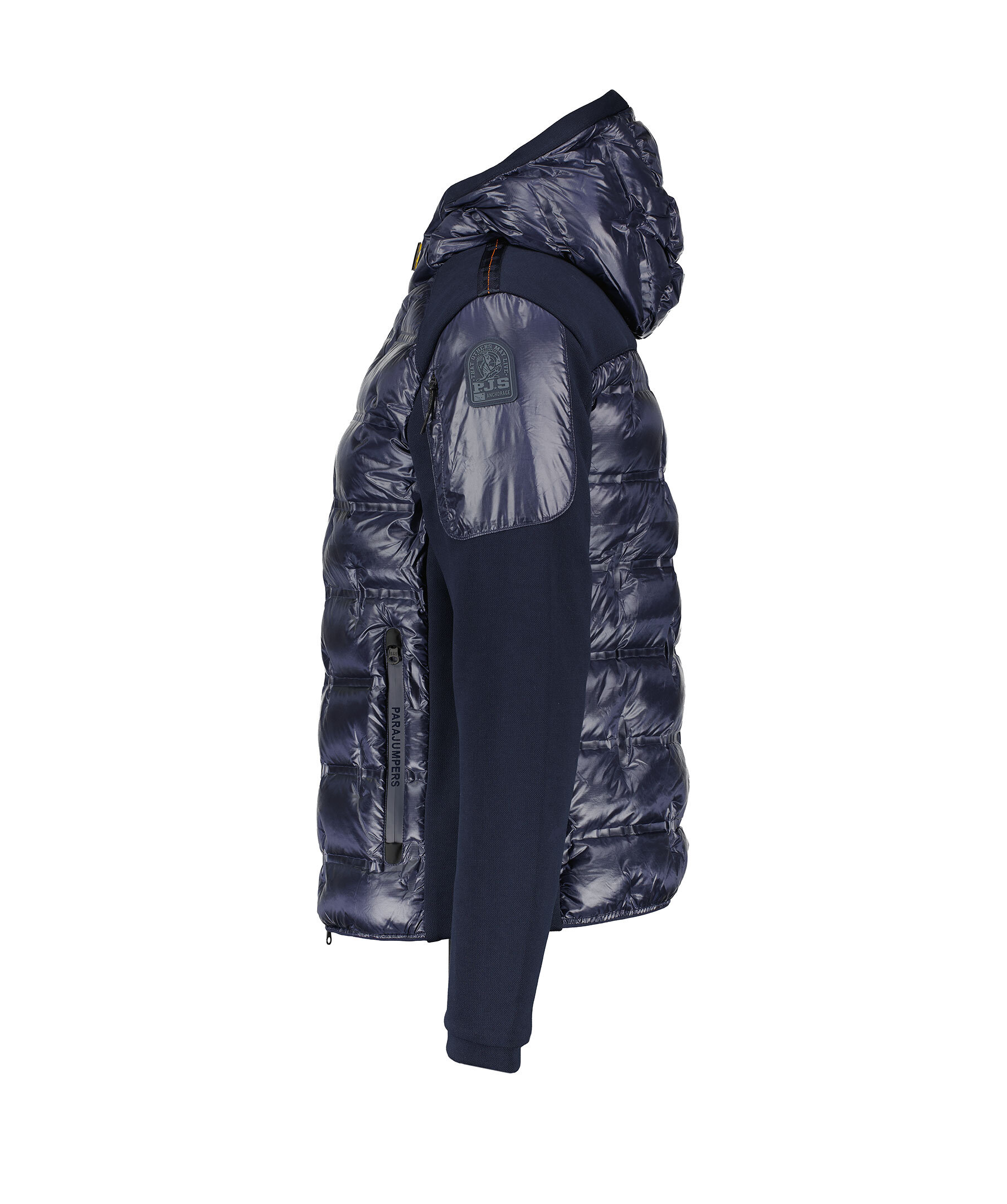 Marinblå hybridjacka från Parajumpers. Jackan stängs med tvåvägsdragkedja och har två sidfickor med dragkedja, en ficka med dragkedja vid axeln samt patch logotyp på vänster ärm. Jackan kombinerar en dunfylld nylon mini ripstop med en stretchig polyester-bomullspiké. ■ OBS! Modellbilderna visar endast passform