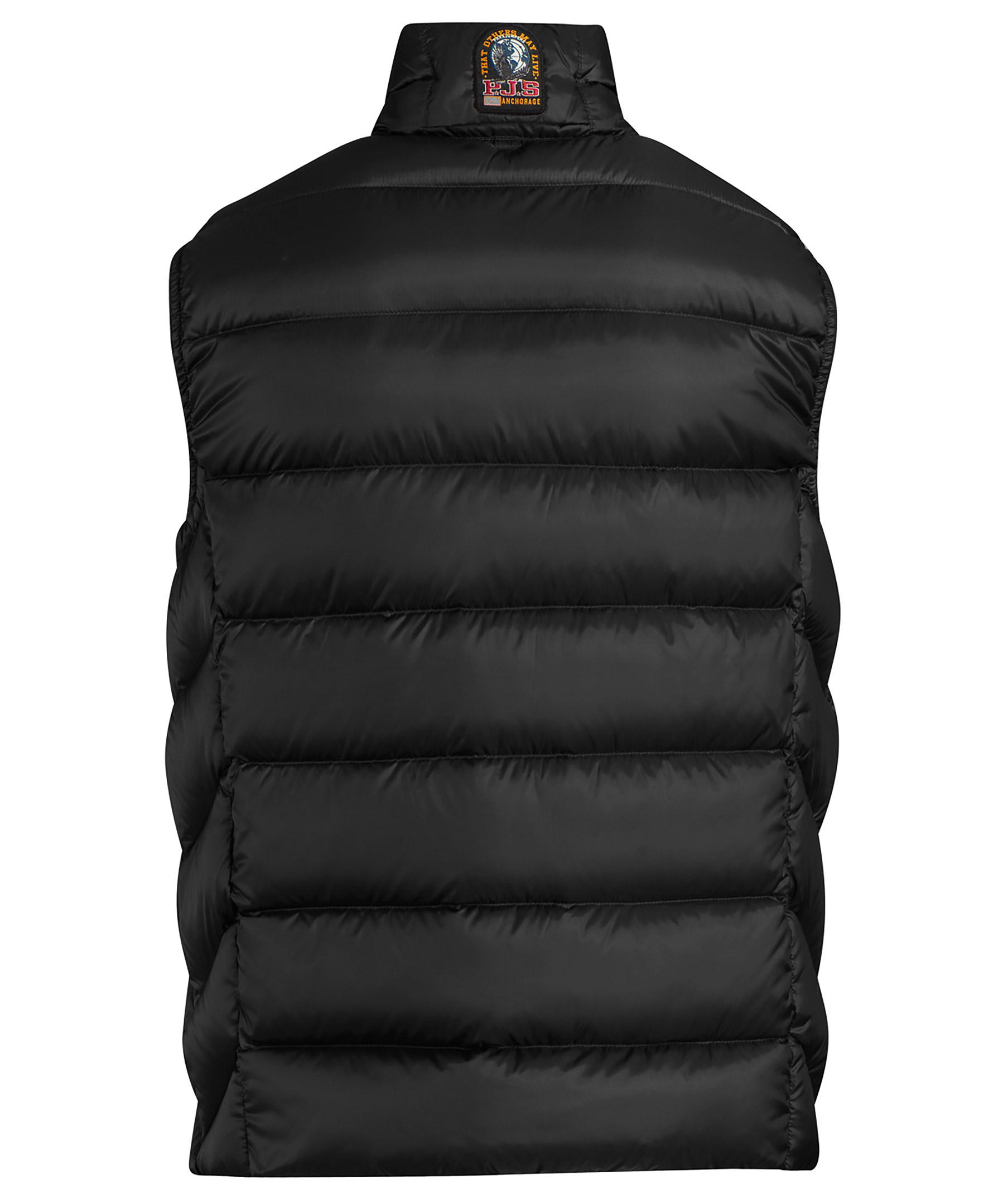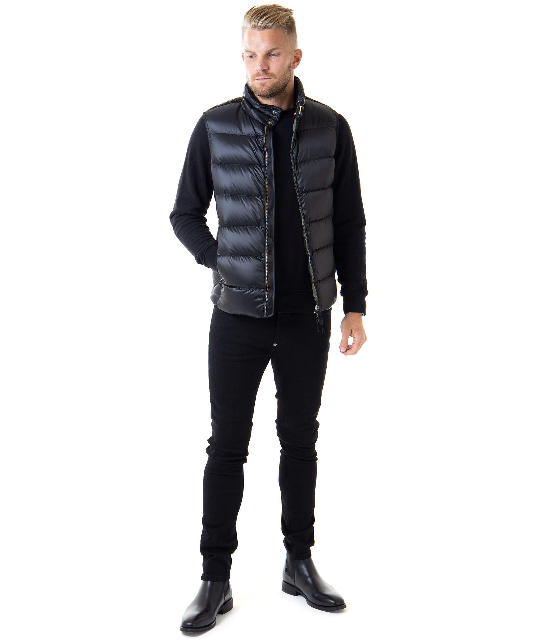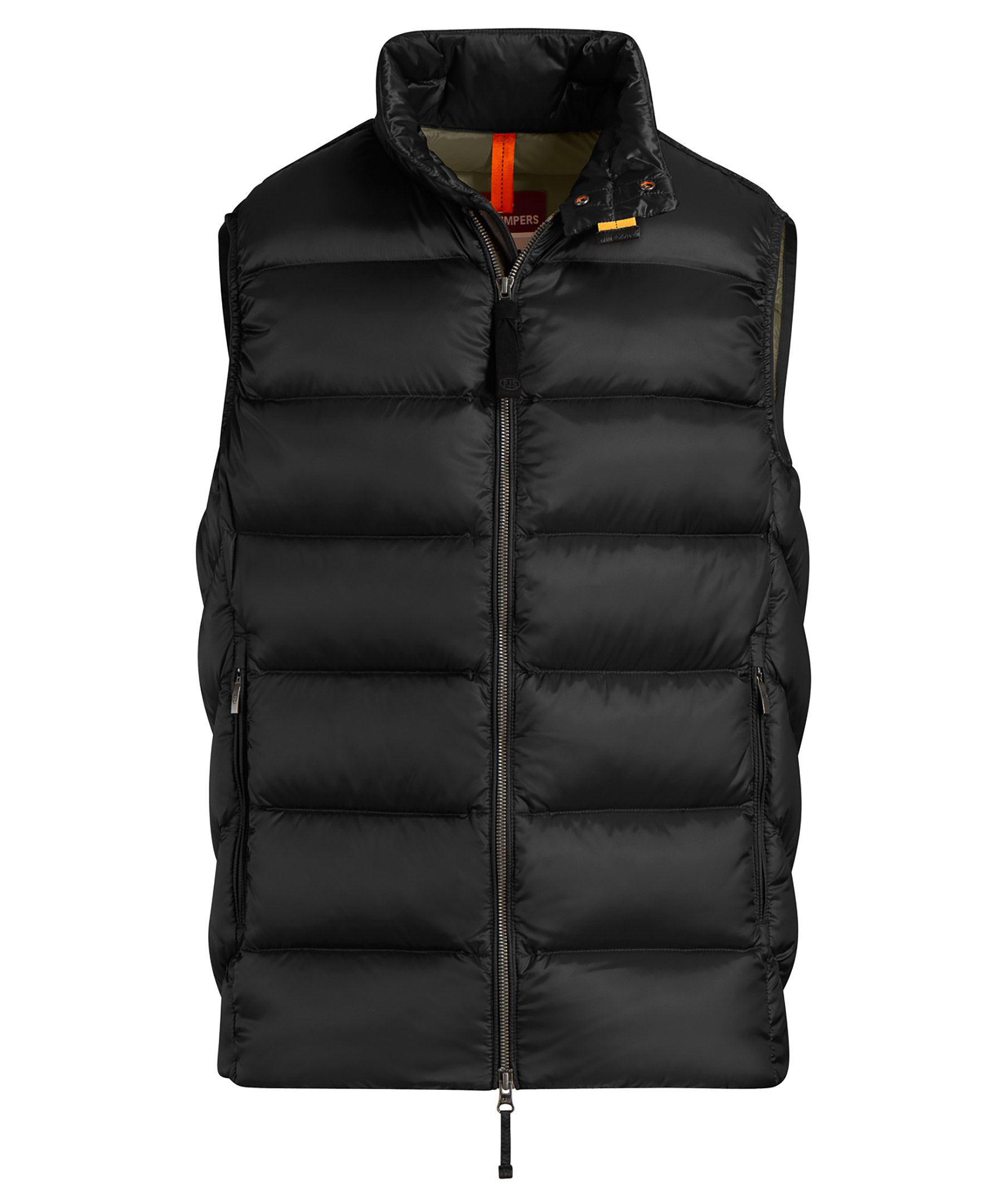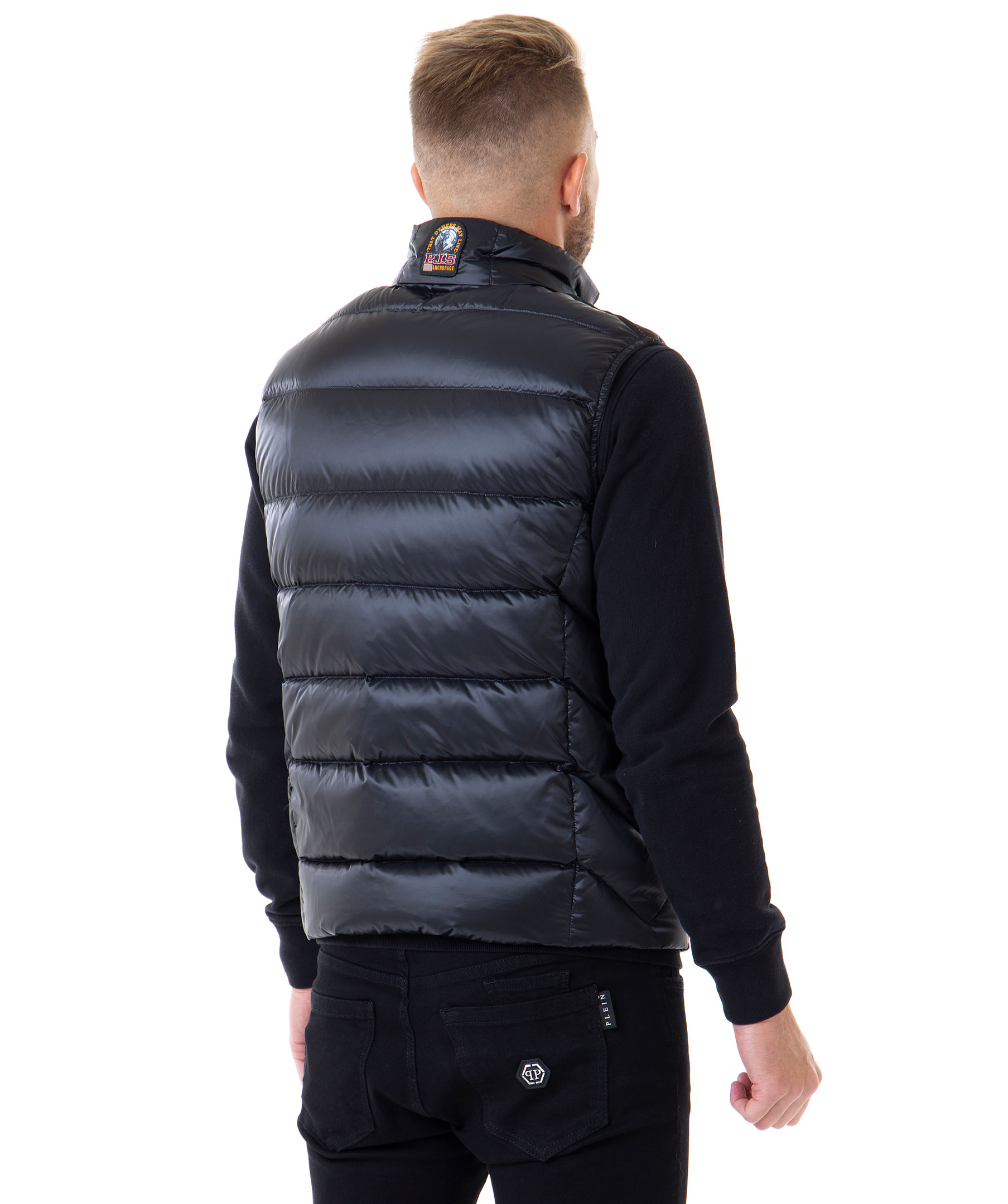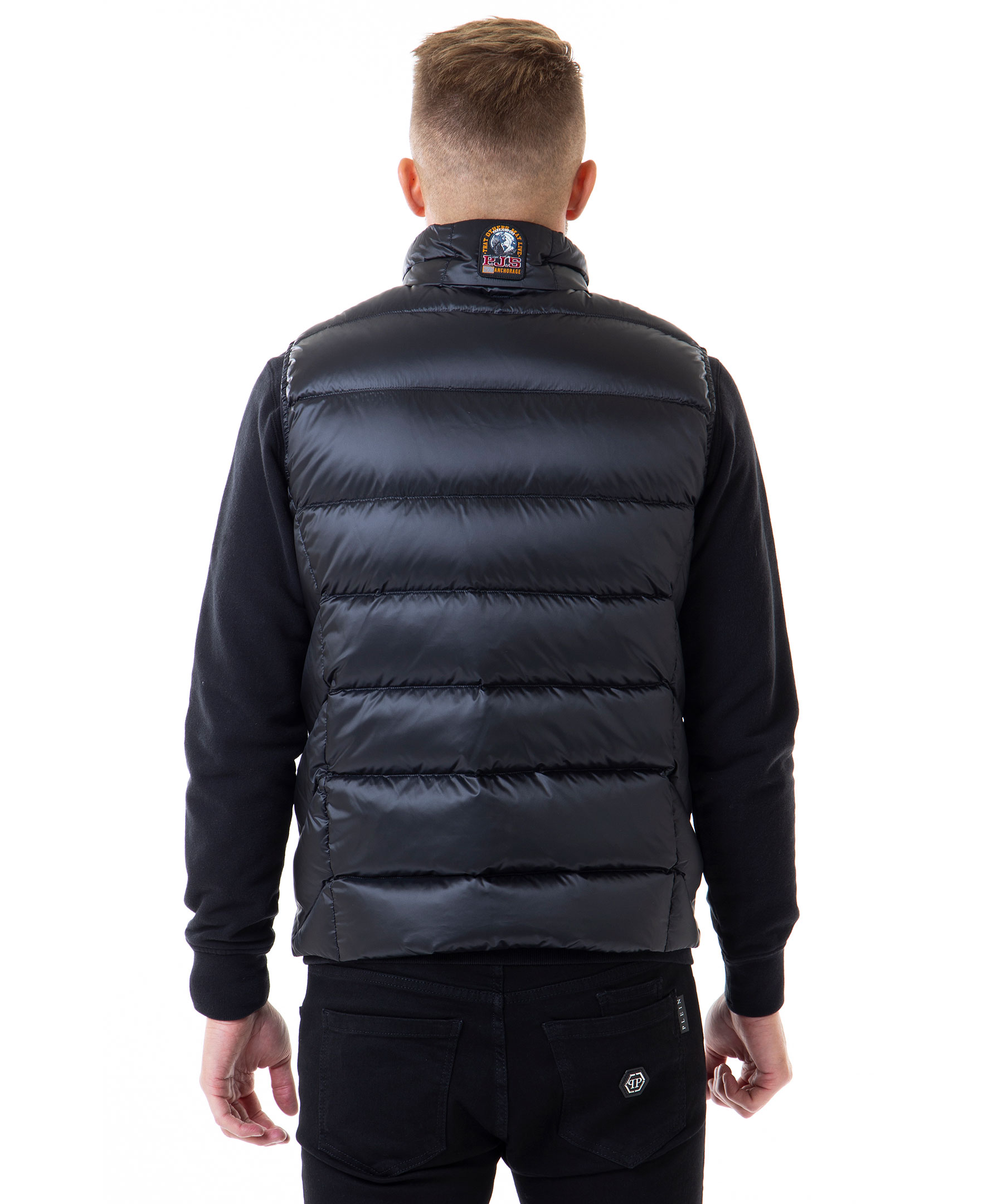 Svart dunväst från Parajumpers. Västen har en glansig finish, två vertikala framfickor med dragkedja samt två innerfickor. Broderat märke i nacken. Modellen är 188 cm lång och bär storlek M.