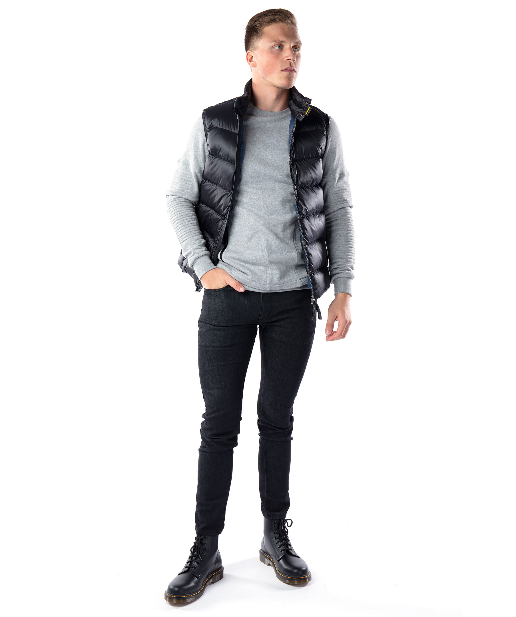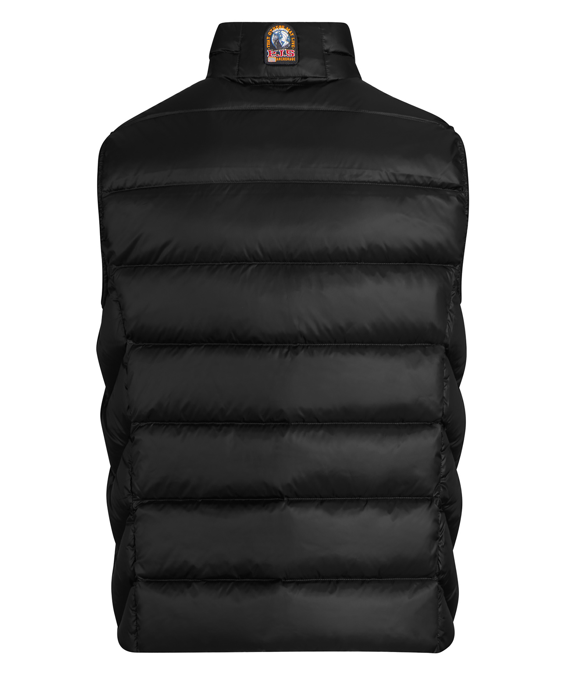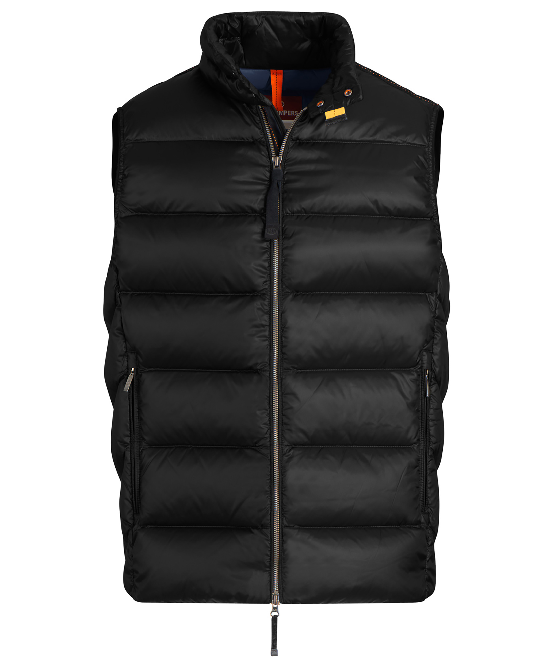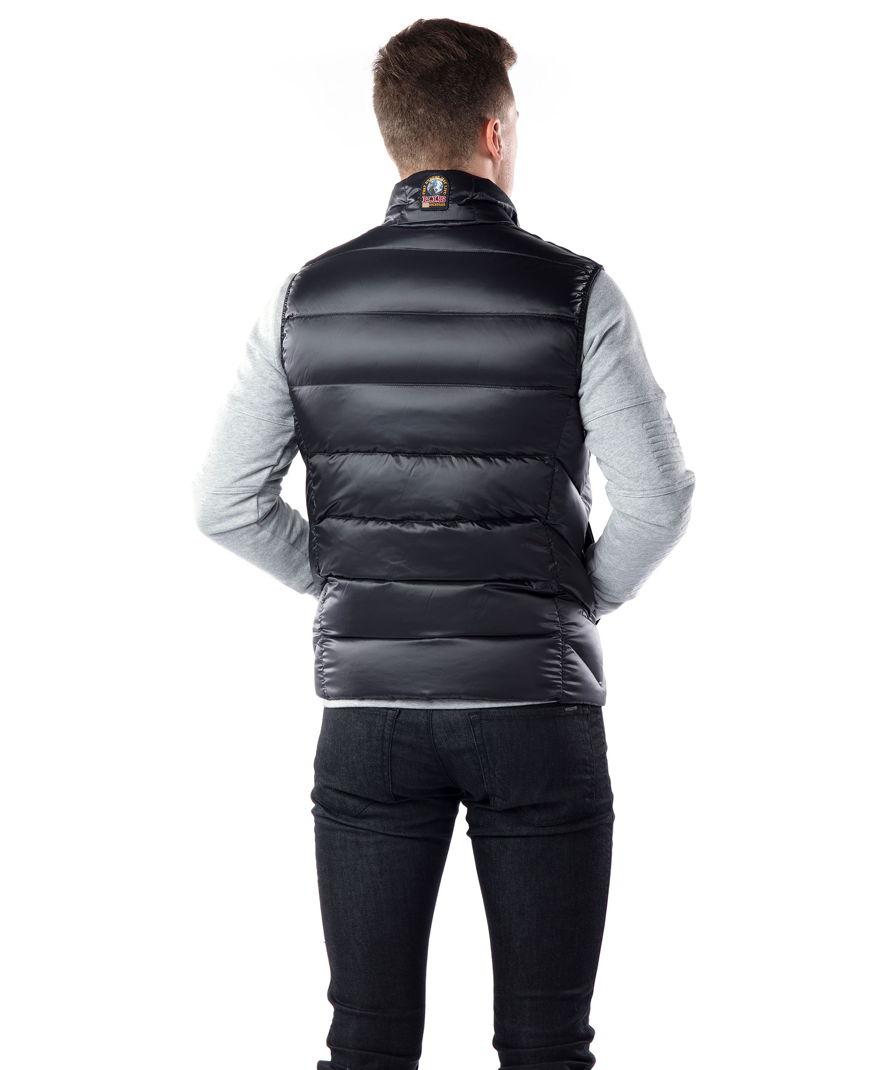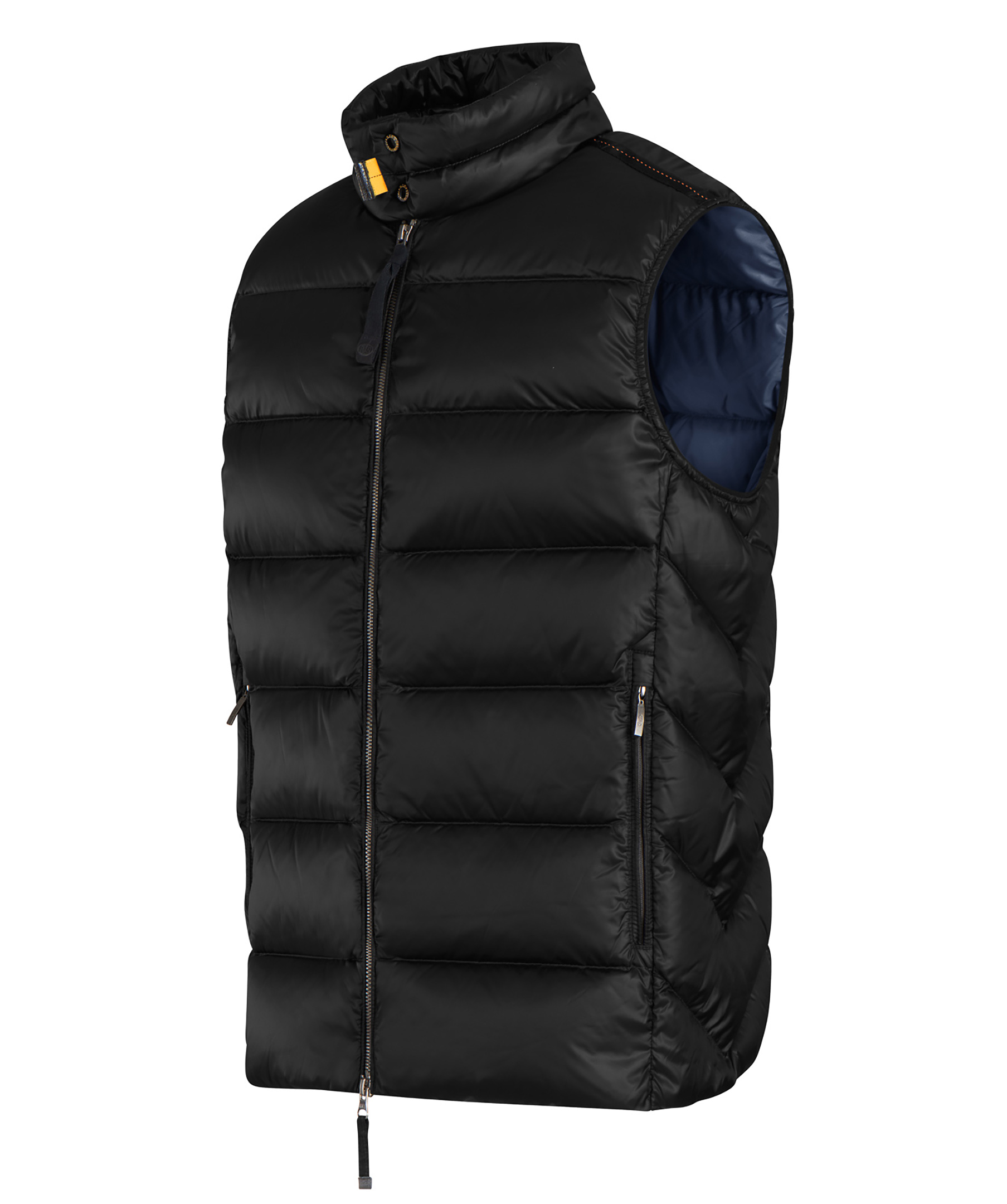 Svart dunväst från Parajumpers. Västen har en glansig finish, två vertikala framfickor med dragkedja samt två innerfickor. Broderat märke i nacken. Modellen är 190 cm lång och bär storlek M.