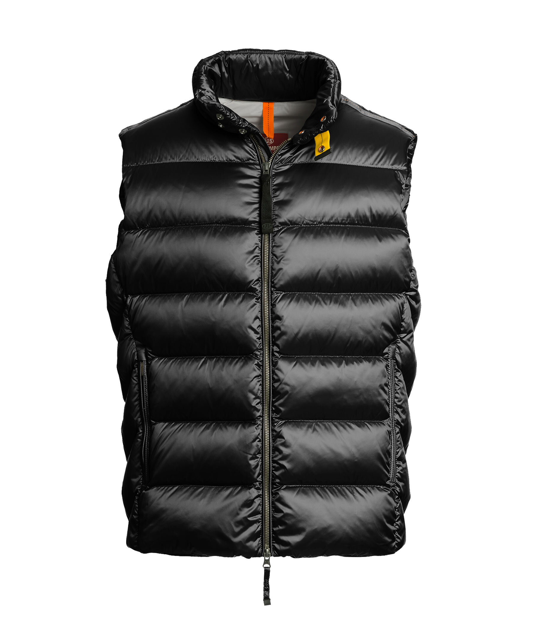 Svart, glansig dunväst från Parajumpers. Västen stängs med tvåvägsdragkedja och har två sidfickor med dragkedja, logotyp i nacken samt deras ikoniska, gula flärp vid krage. Tillverkad av polyester-nylon twill.
