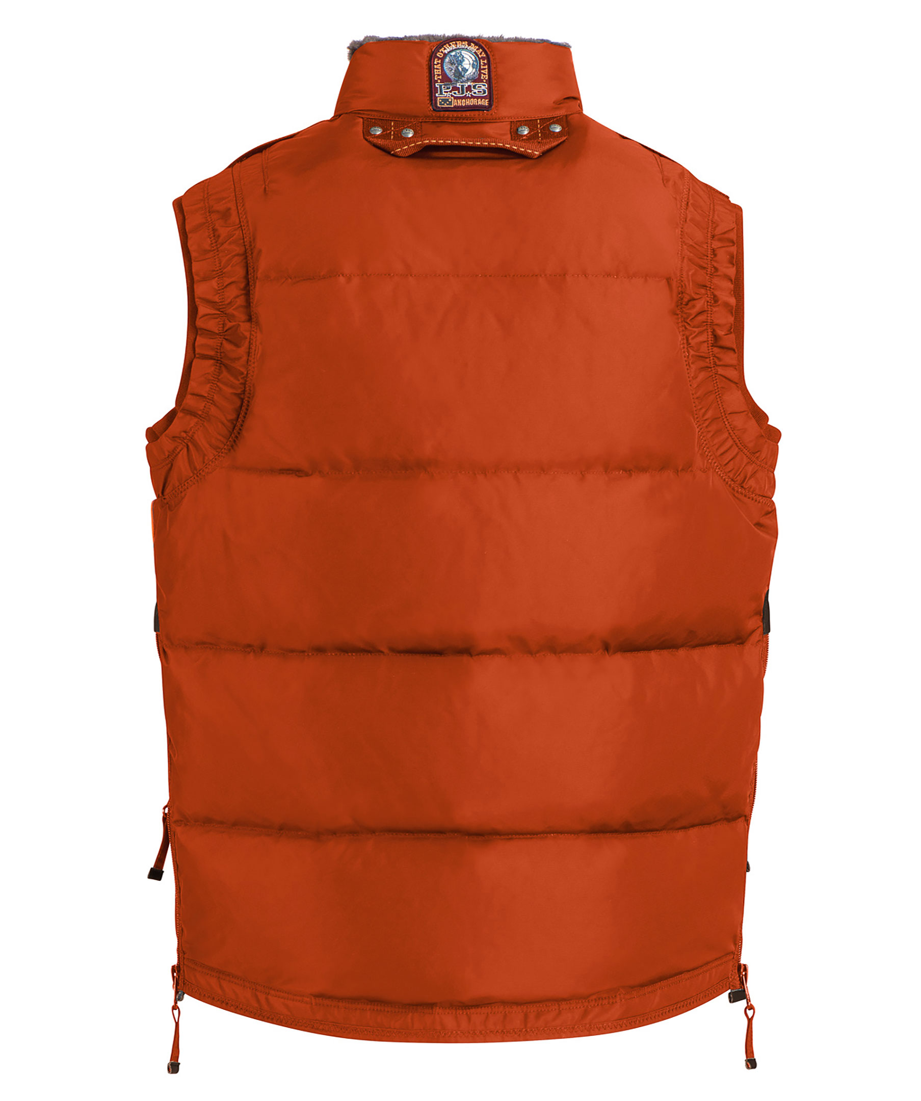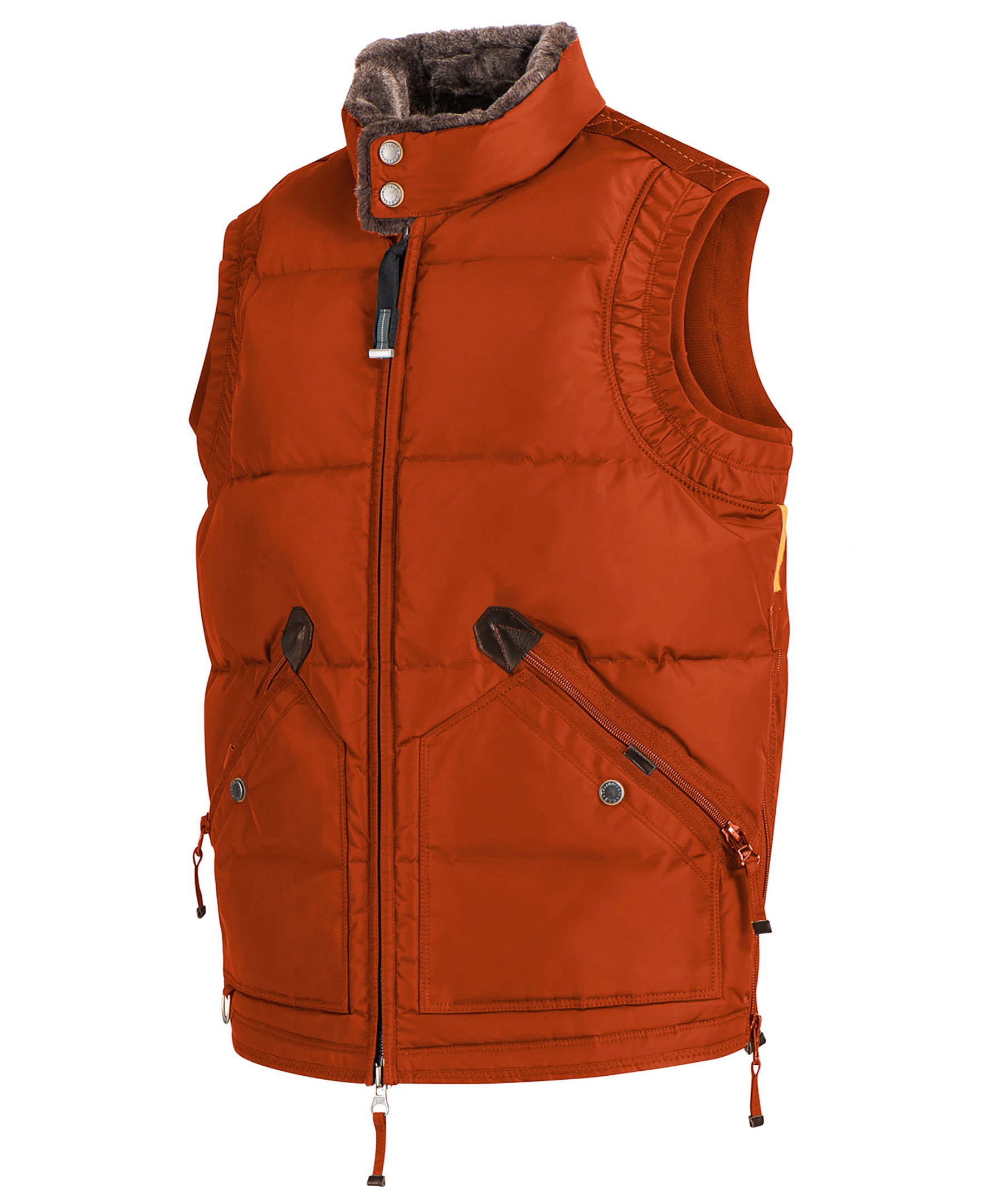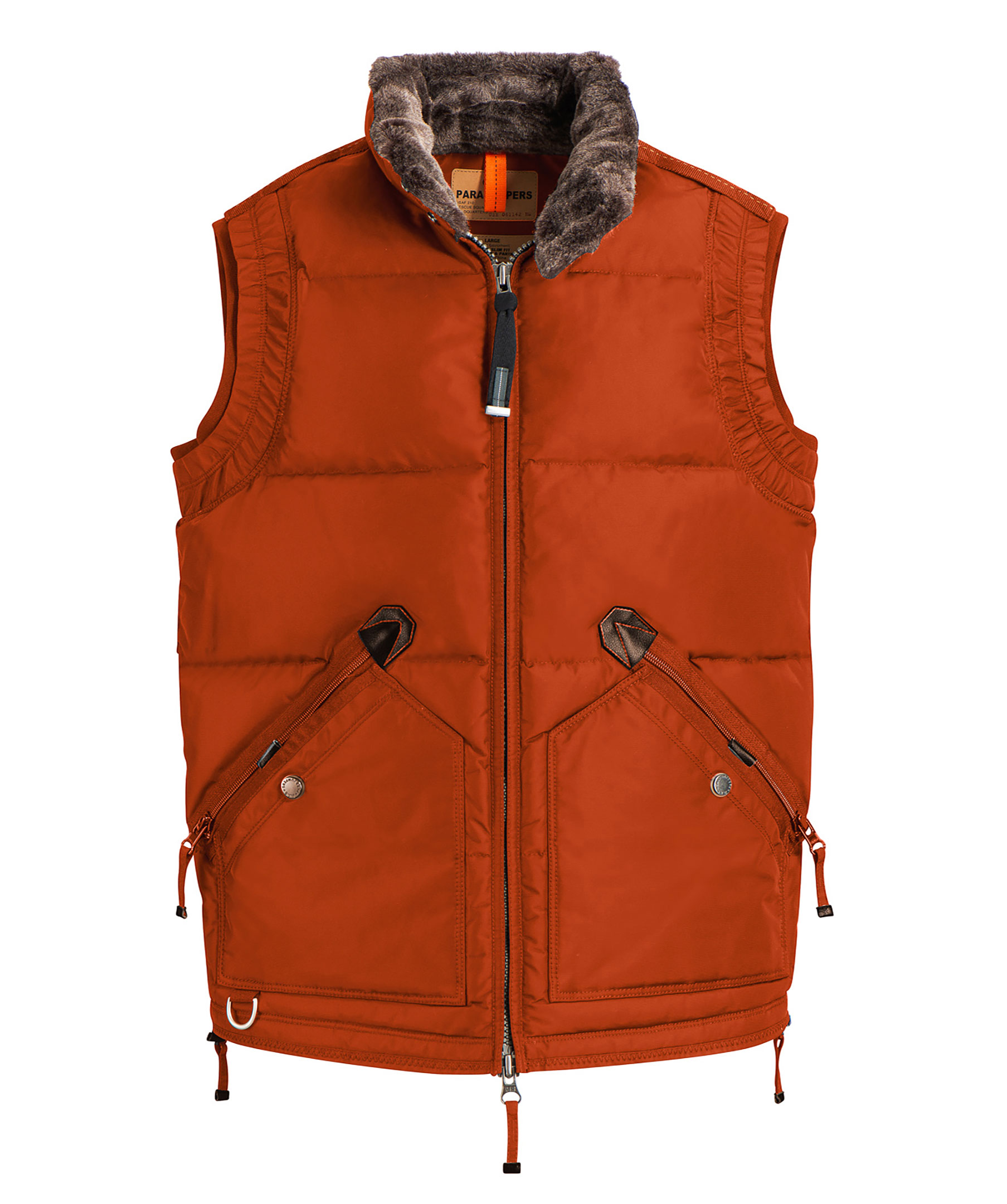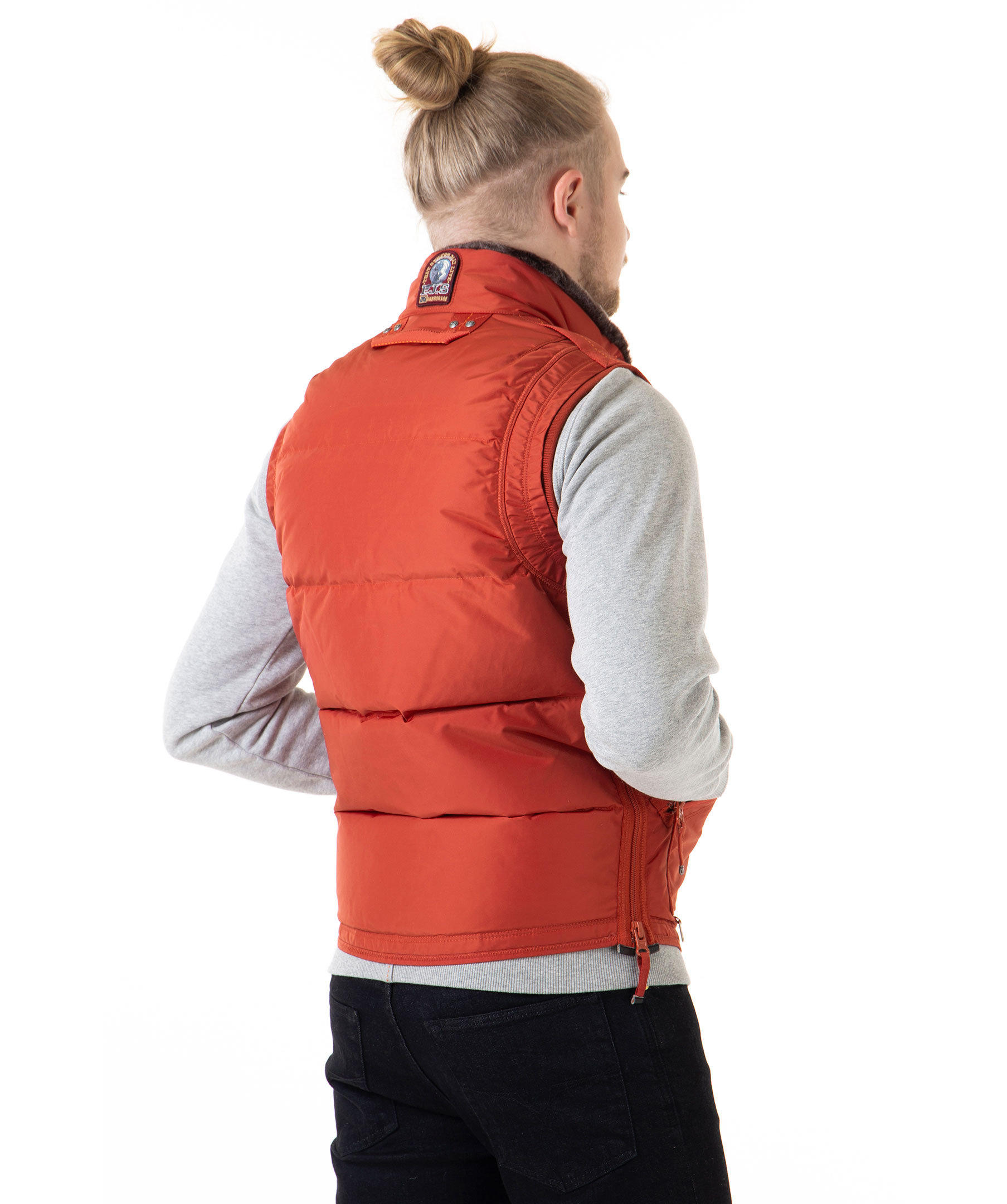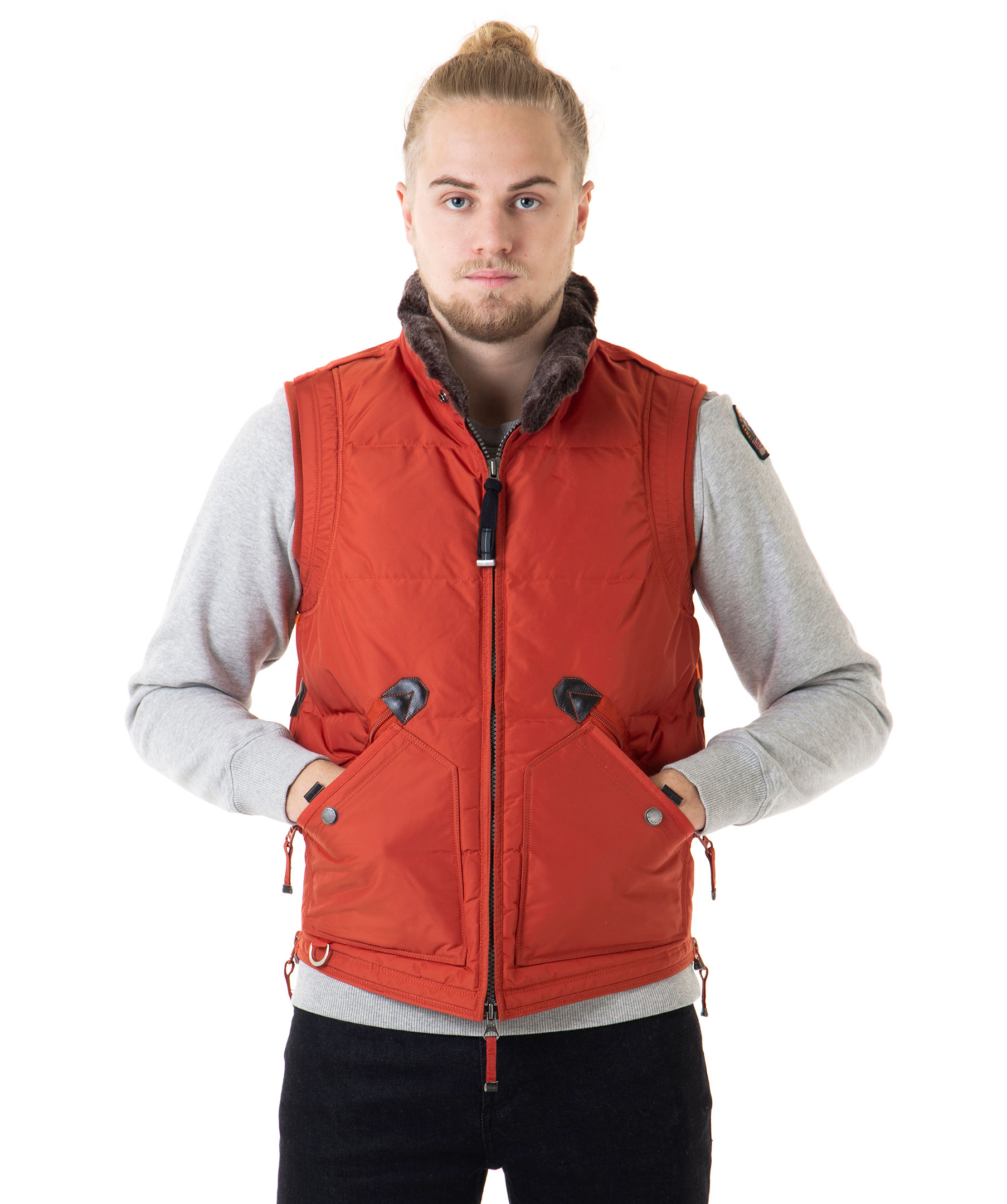 Orange, kraftig dunväst från Parajumpers med en krage i faux fur. Dubbla snedställda frontfickor och två innerfickor i mesh. På jackans utsida så finns det två slits med dragkedja i sidorna på västen. Tvåvägsdragkedja fram samt PJs märke i nacken. Ingår i Parajumpers Masterpiece Series bestående av deras exklusivaste modeller. Modellen är 186 cm lång och bär storlek M.