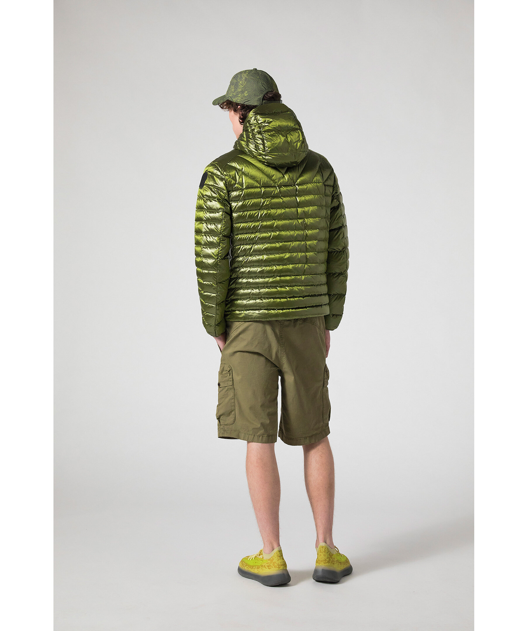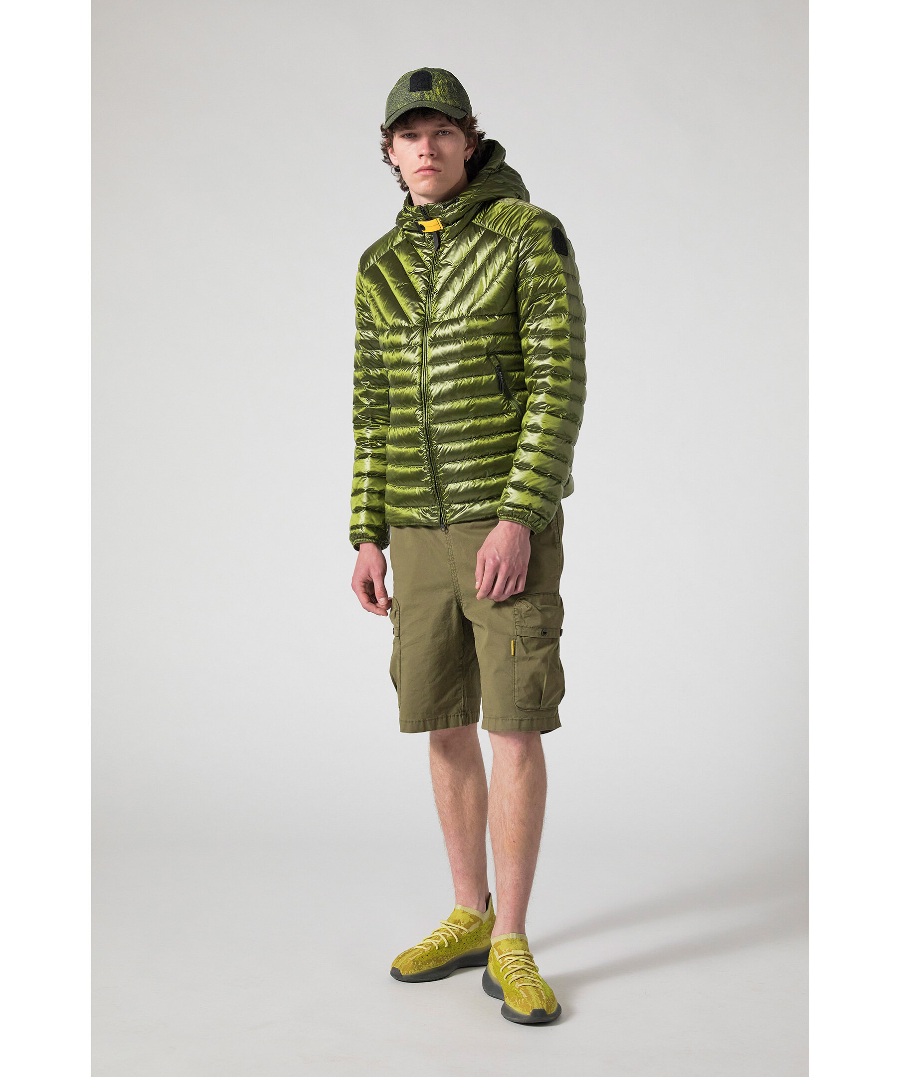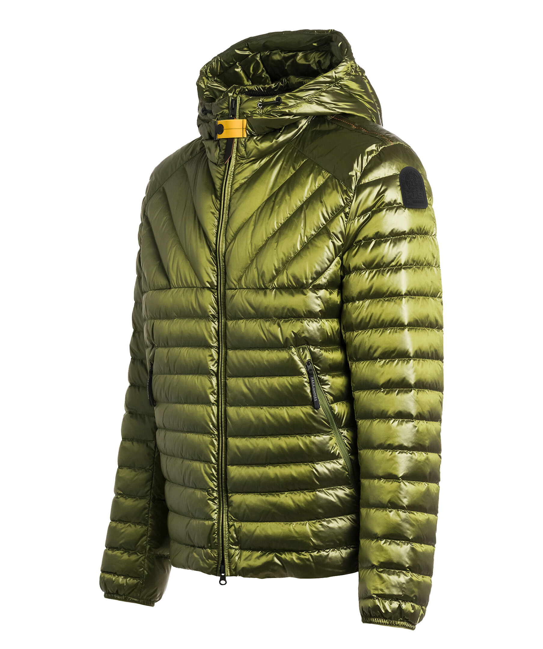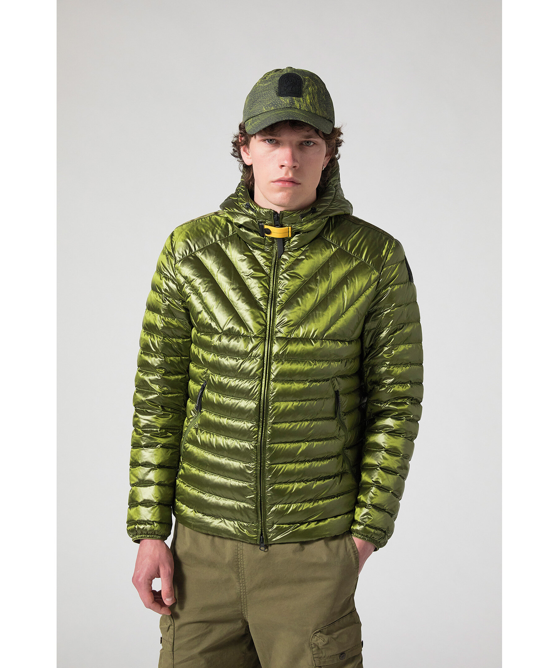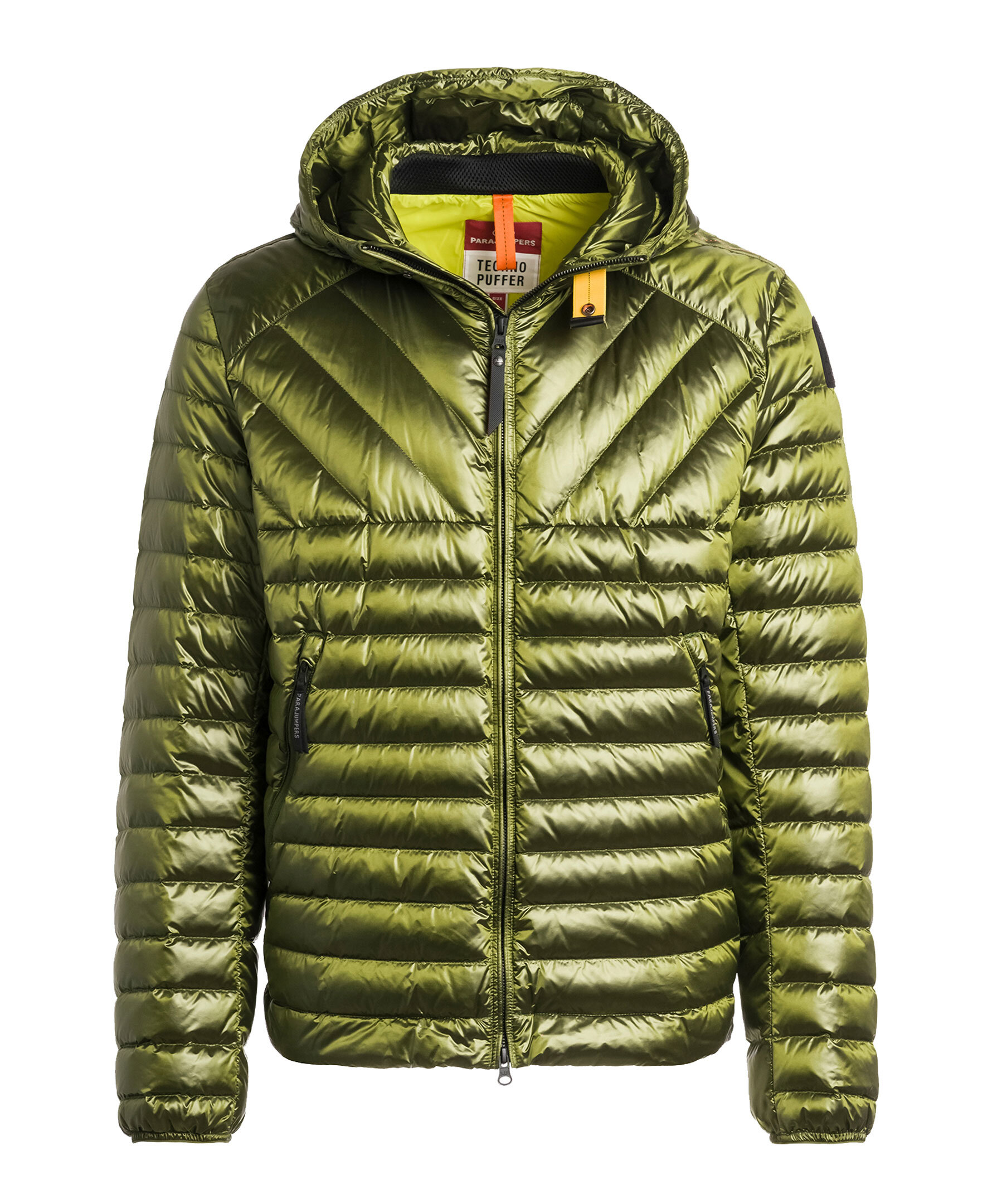 Grön jacka från Parajumpers. Kort quiltad dunjacka med luva, en del av Techno Puffers lätt vadderade familj. Gjord av glänsande och pärlemorskimrande mikro ripstop nylon, uppnådd genom en vaxad tygbehandling. Justerbar huva med dragsko. Stängs framtill med tvåvägsdragkedja. Två fickor med dragkedja och en innerficka, ventilationsöppningar under armarna, andningsbar 3D-mesh-insats mitt bak i nacken samt justerbar botten med dragsko. Jackan har en svart silikon Parajumpers lapp på ärmen och ikonisk gul tejp vid halsförslutningen.