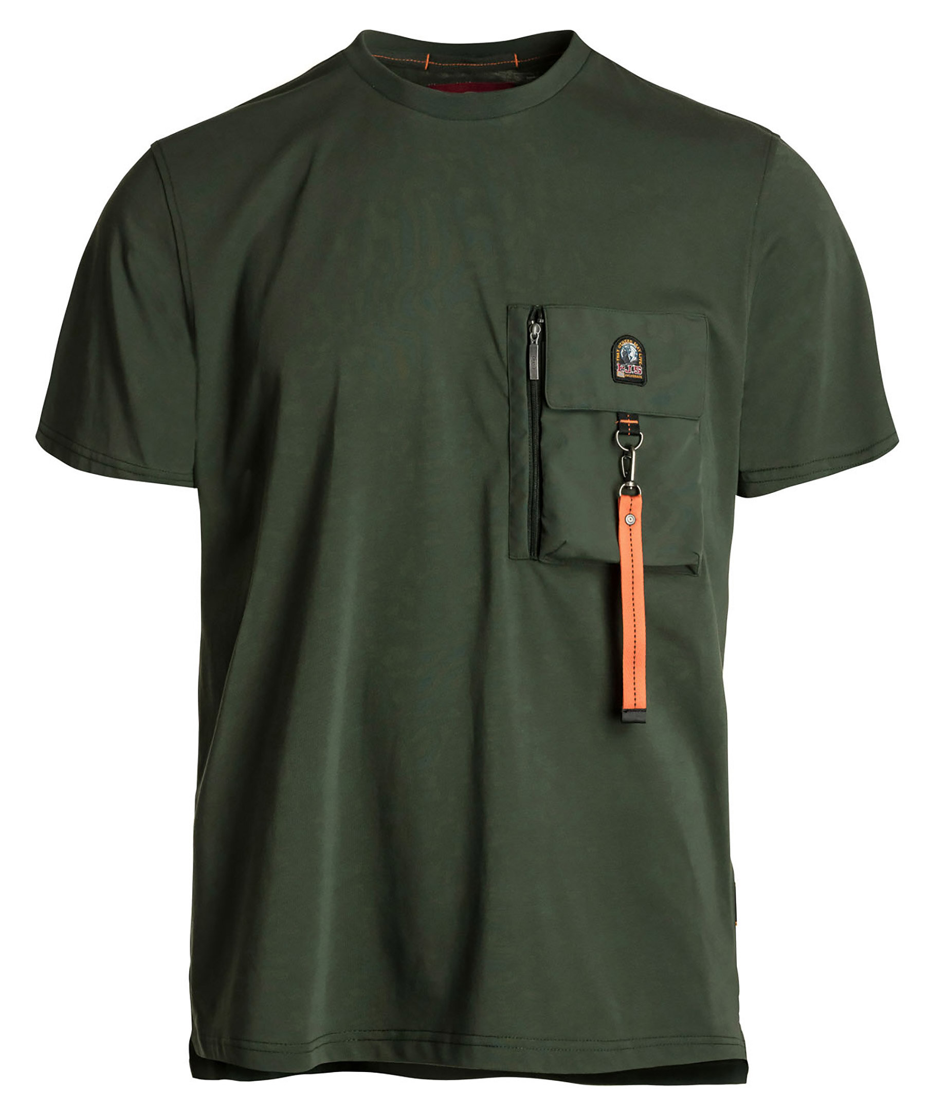 Mörkgrön t-shirt från Parajumpers gjord i 100% bomull. Militärinspirerad. Två bröstfickor en med ficklock och en med dragkedja. Bröstfickan har även en avtagbar nyckelring.