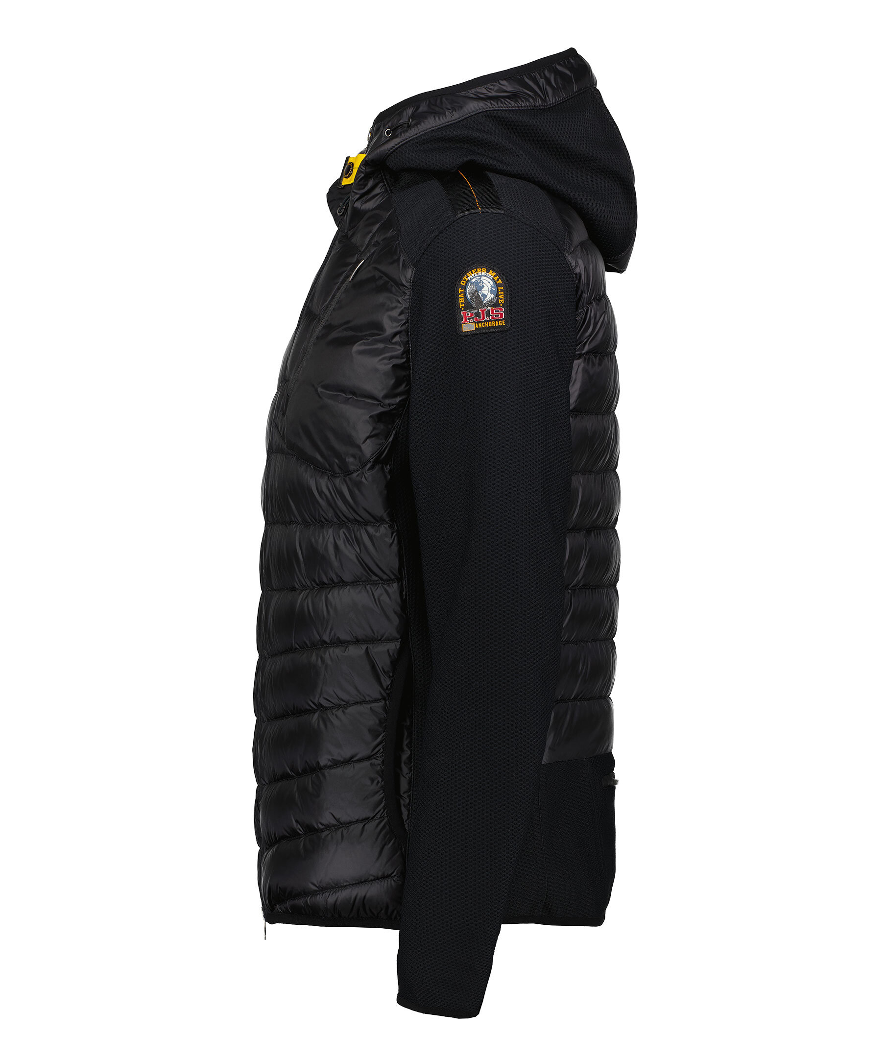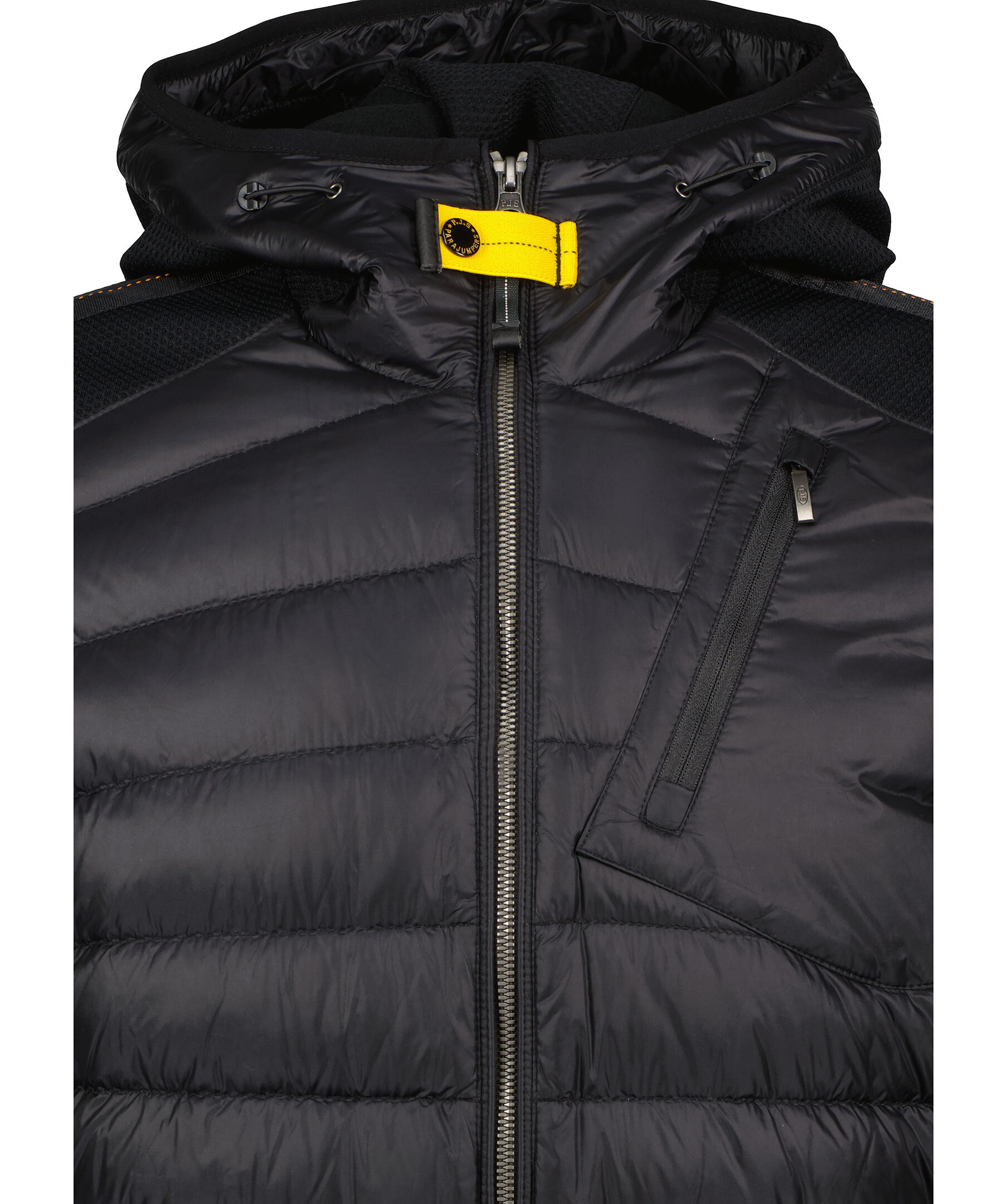 Svart hybrid jacka med huva från Parajumpers. Jackan har två sidfickor samt en snedställd bröstficka med dragkedja. Patch-logotyp på vänster ärm. Ficka med dragkedja i svanken. Dragsko i huvan. Tillverkad i en polyamid- och polyesterblandning. Jackan stängs med tvåvägsdragkedja. Perfekt för mellansäsongsväder, kan enkelt packas ihop för att alltid vara redo när det blir svalare.