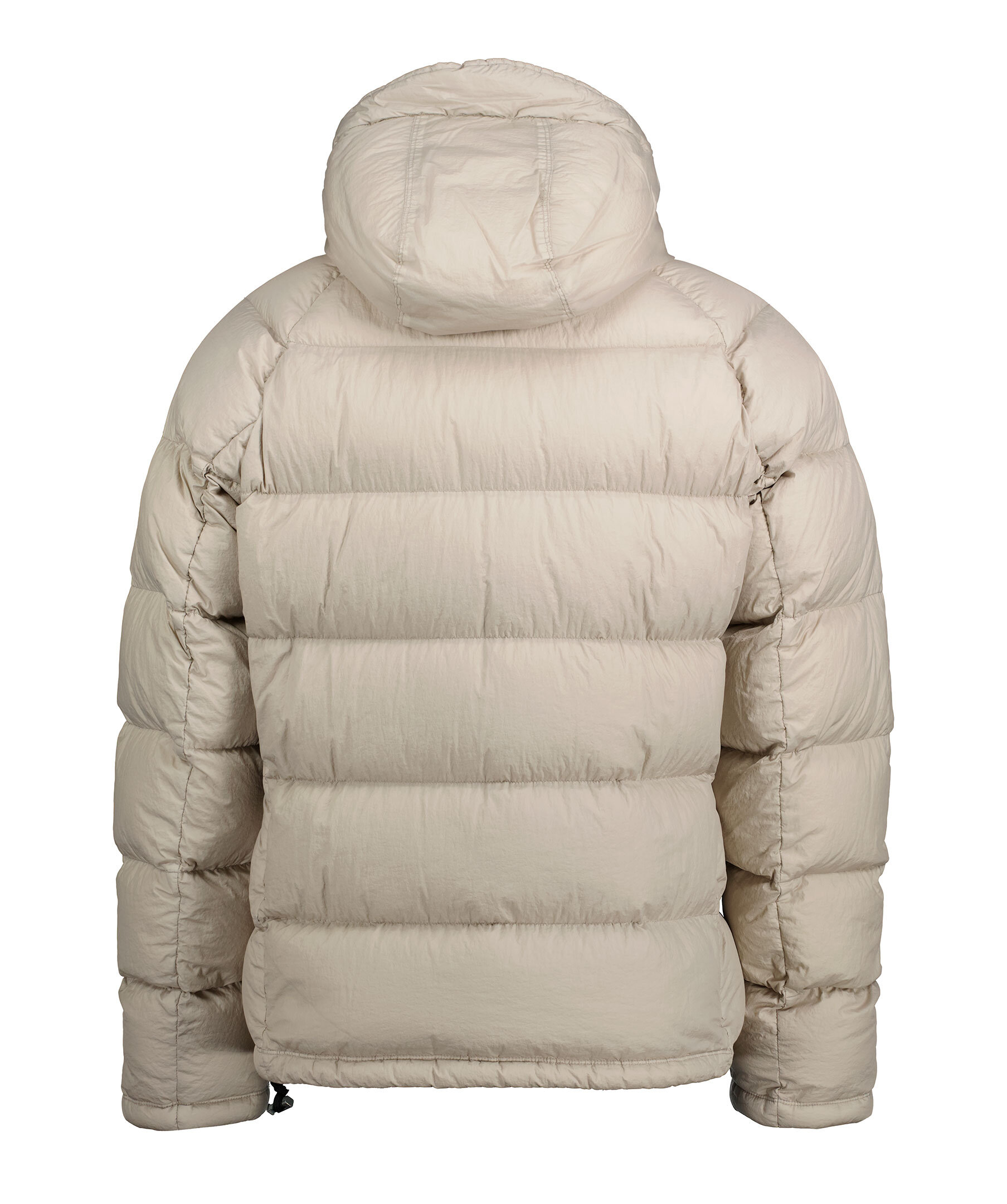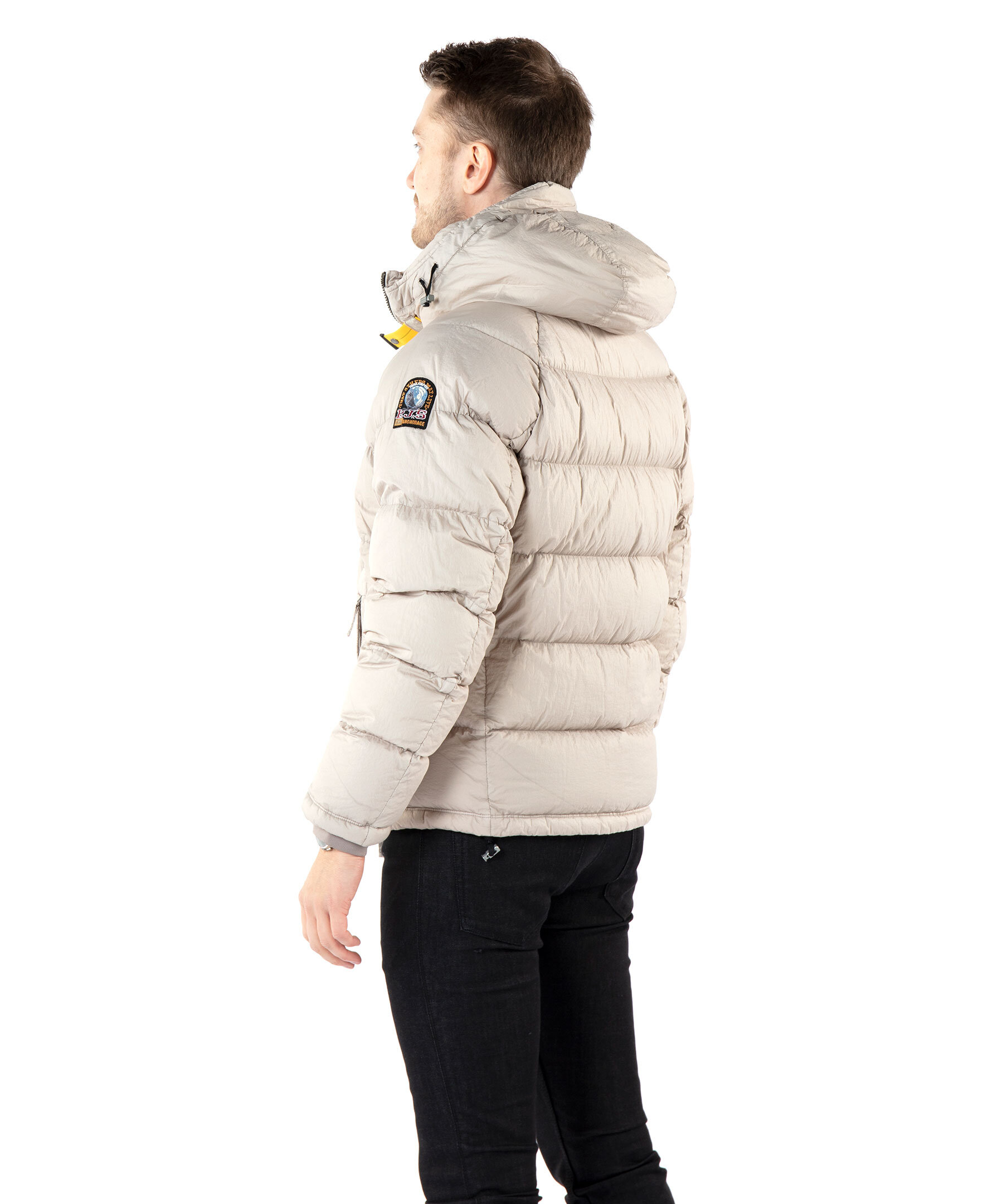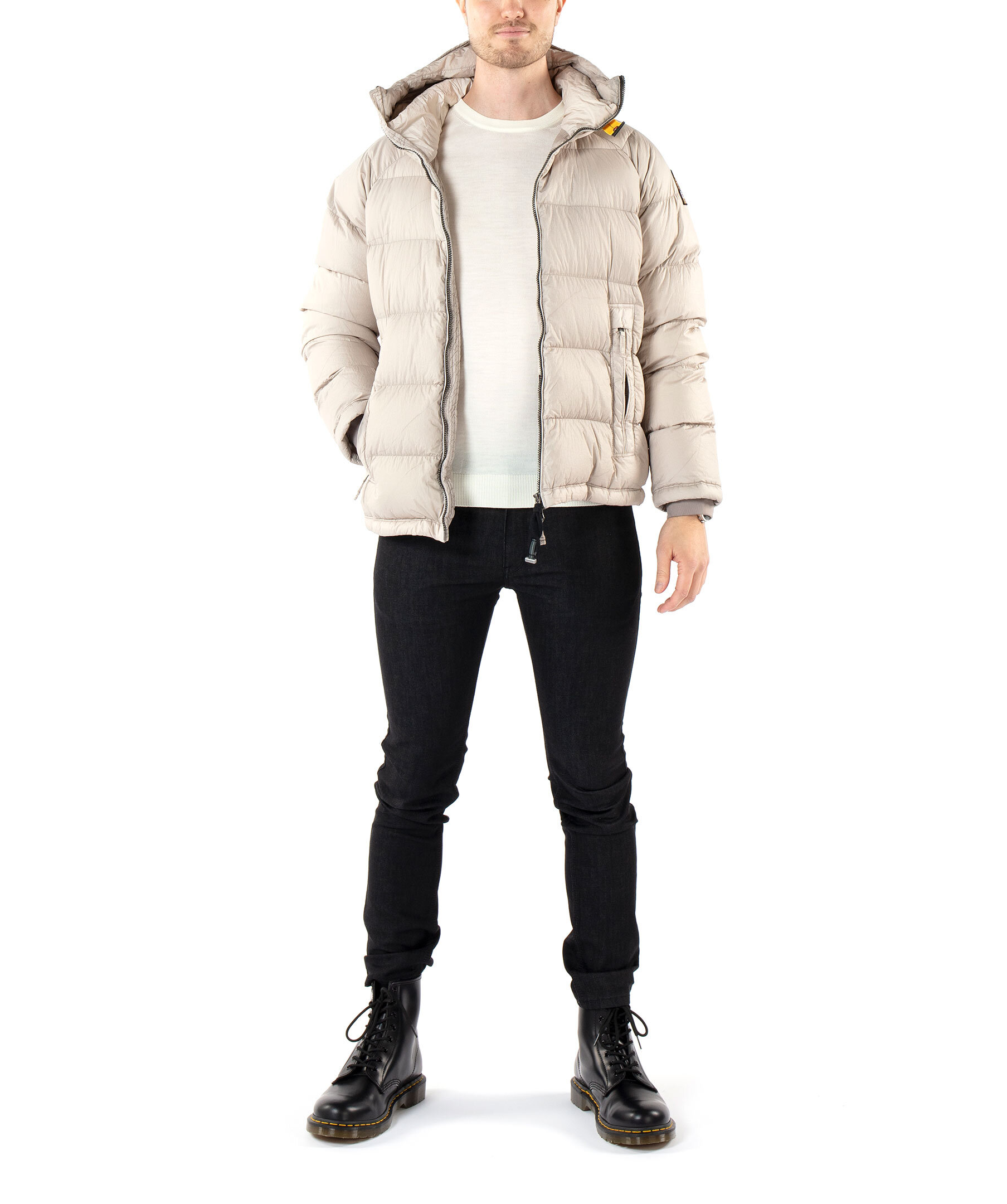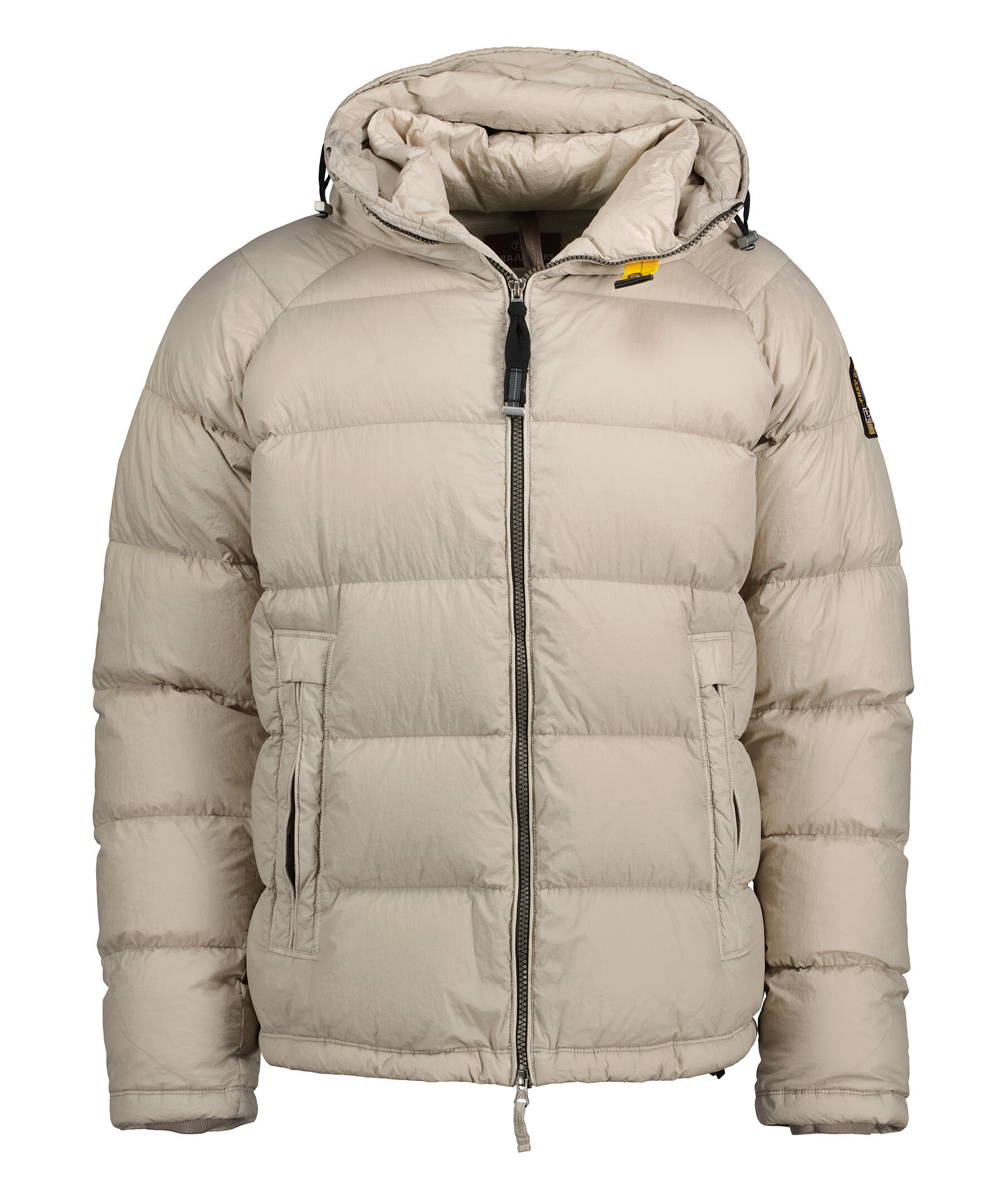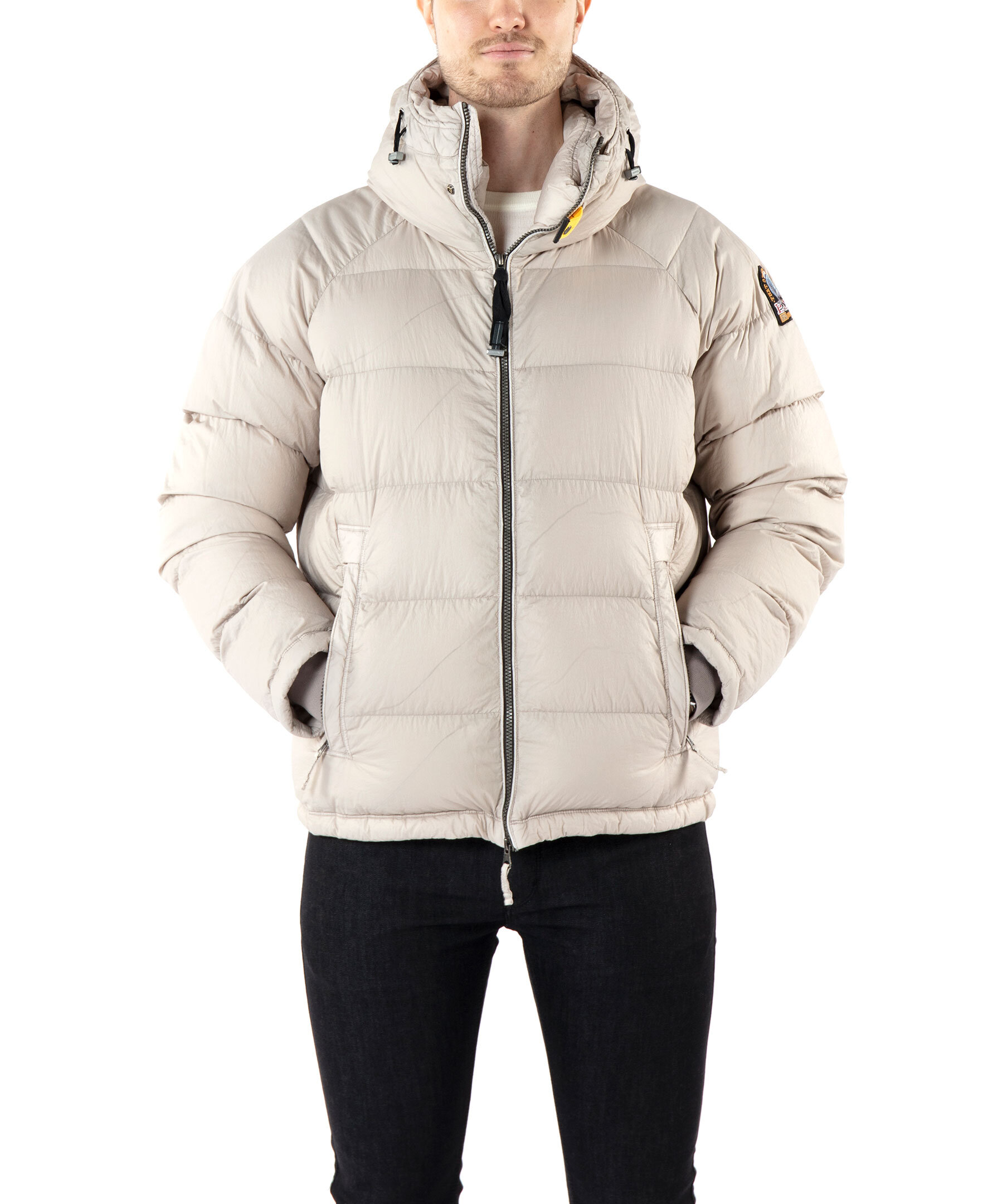 Beige quiltad dunjacka från Parajumpers. Stängs framtill med tvåvägsdragkedja. luva med dragsko, två sidfickor som stängs med dragkedja. Ribbstickade resår i ärmslut. Broderad patch med logotyp på vänster ärm. Gul detalj med tryckknapp vid kragen. Modellen är 188cm lång och har på sig storlek M.