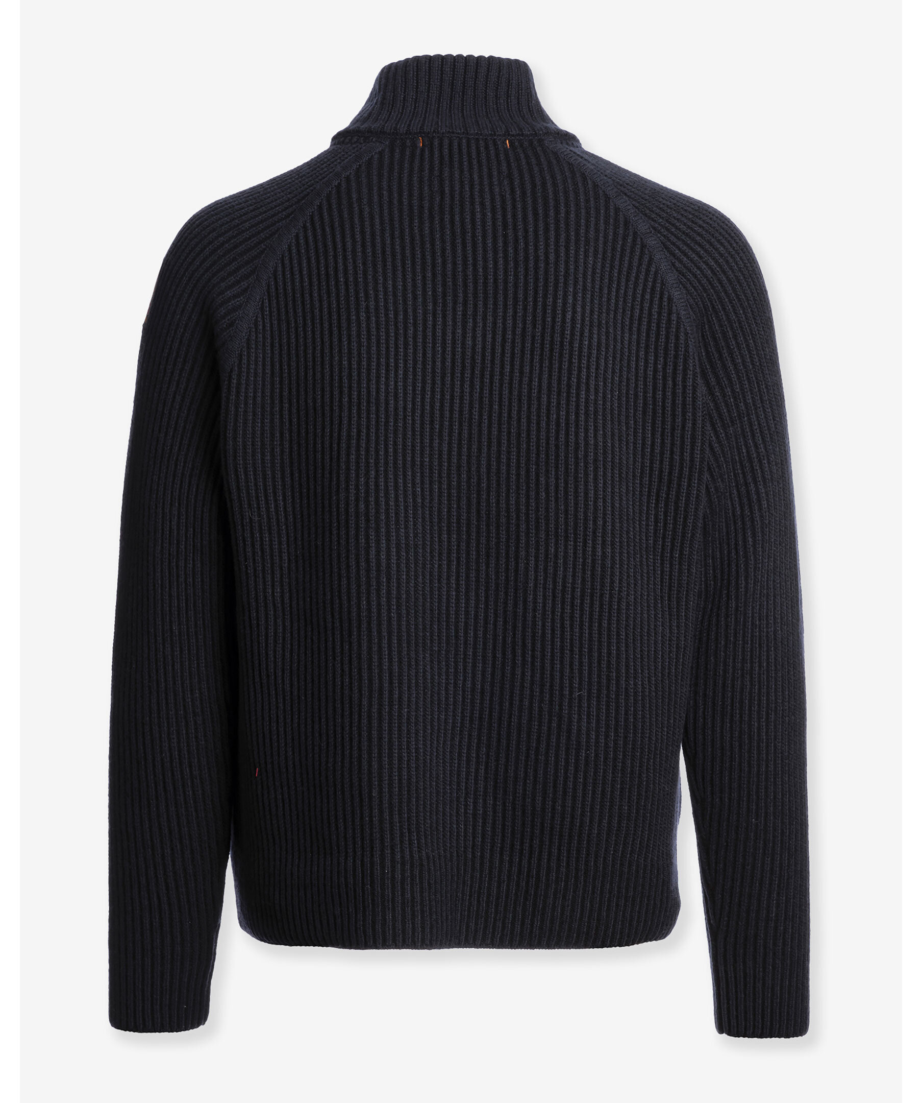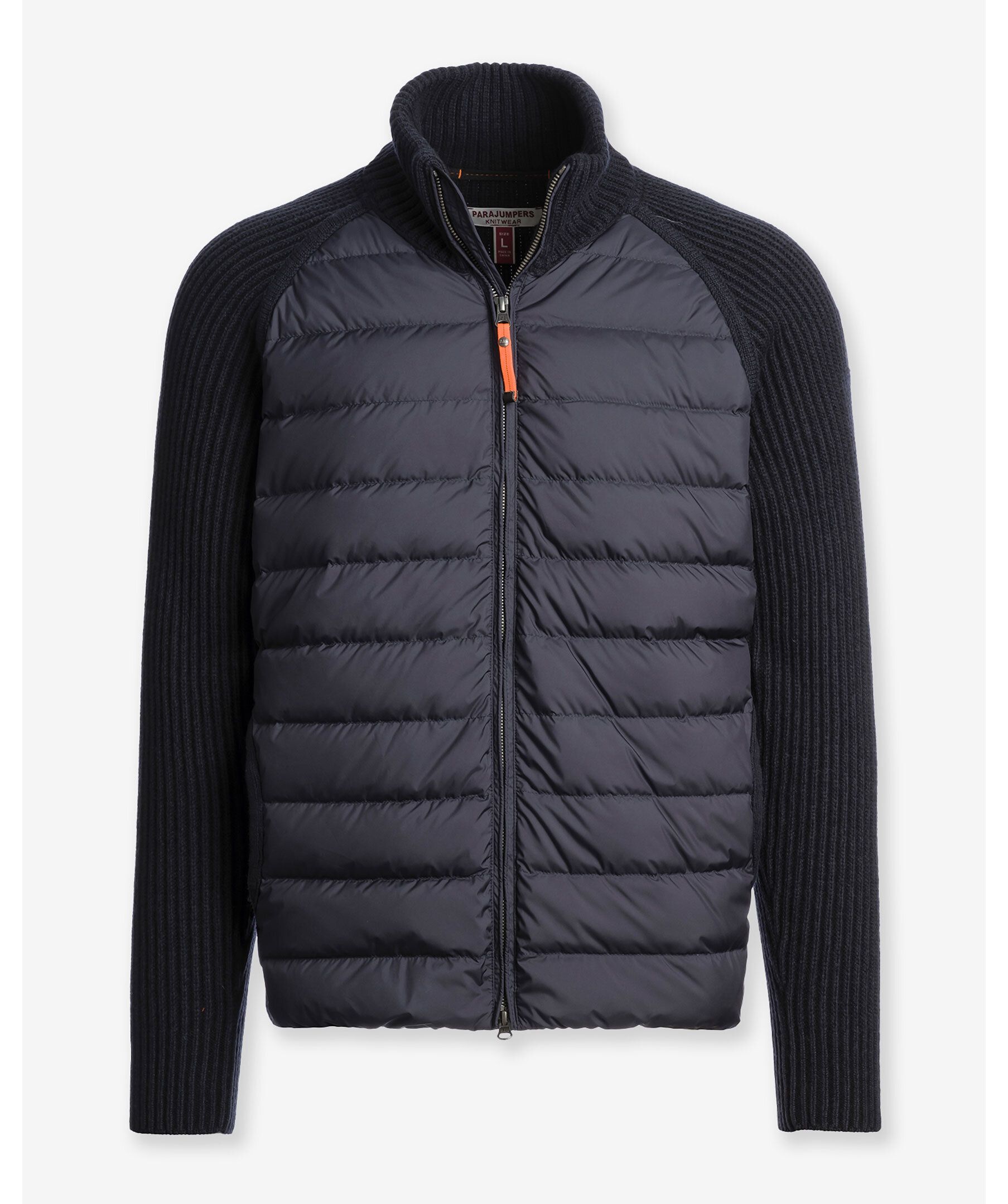Mörkblå hybridjacka från Parajumpers. Jackan kombinerar ribbstickad merinoull med lätt, dunvadderad front i återvunnen polyester. Värmande, lätt och perfekt för lager-på-lager. Utrustad med tvåvägsdragkedja, fickor och Parajumpers-logga på ärmen.