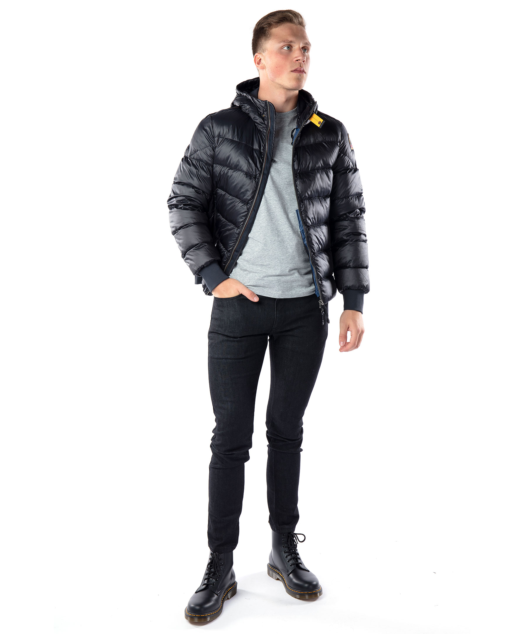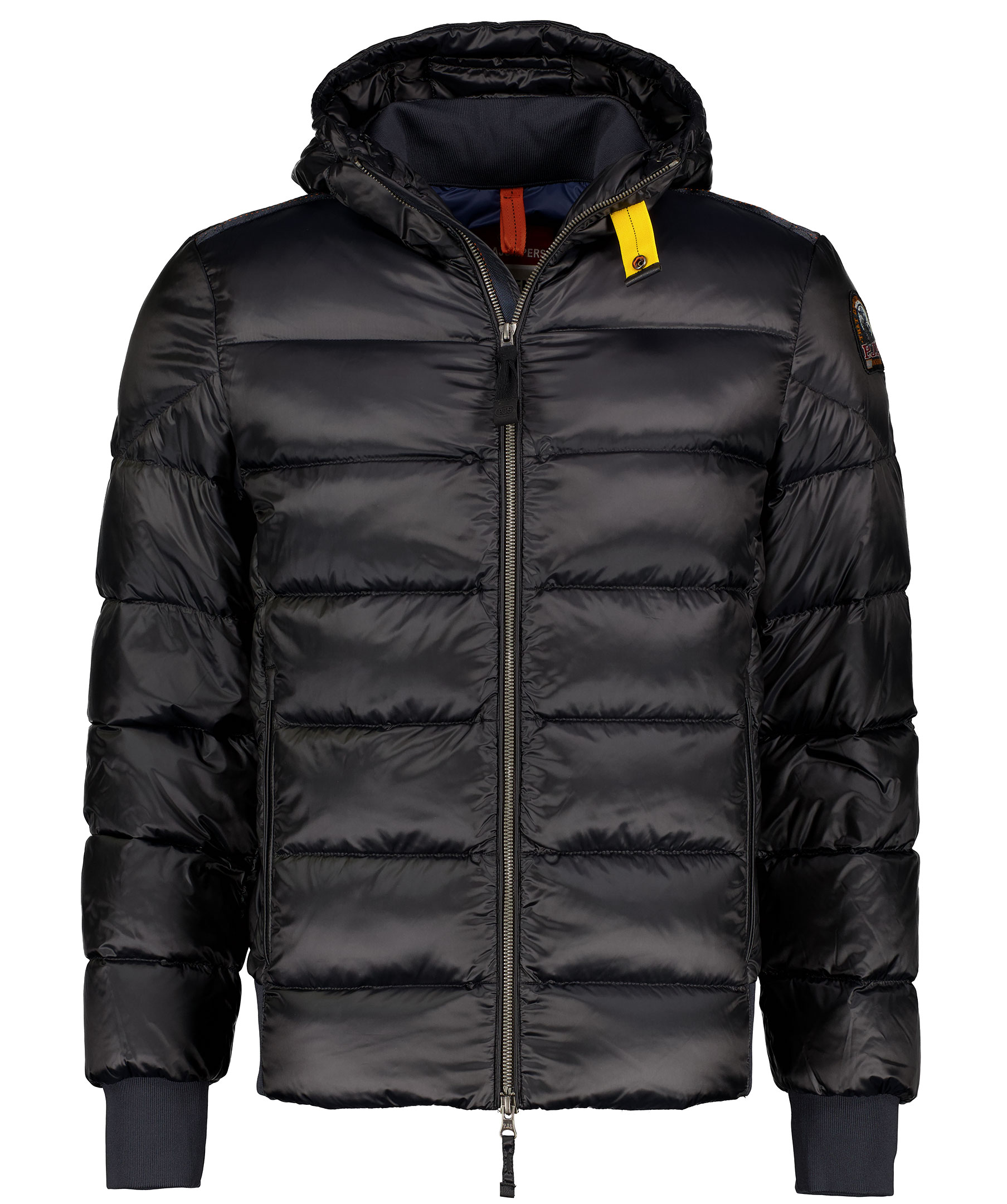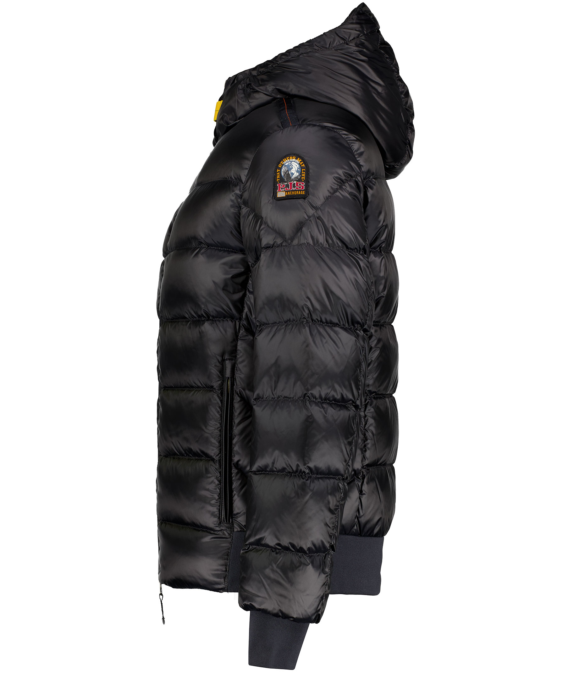 Svart dunjacka från Parajumpers i kort modell. Yttertyg tillverkat i polyester och polyamid och har en glansig finish. Två fickor med dragkedja framtill, två innerfickor, luva med dragsko, hög krage med gult spänne samt broderat patch med logotyp på vänster ärm. Ribbstickade muddar vid ärm och plaggslut. Modellen är 190 cm lång och bär storlek M.