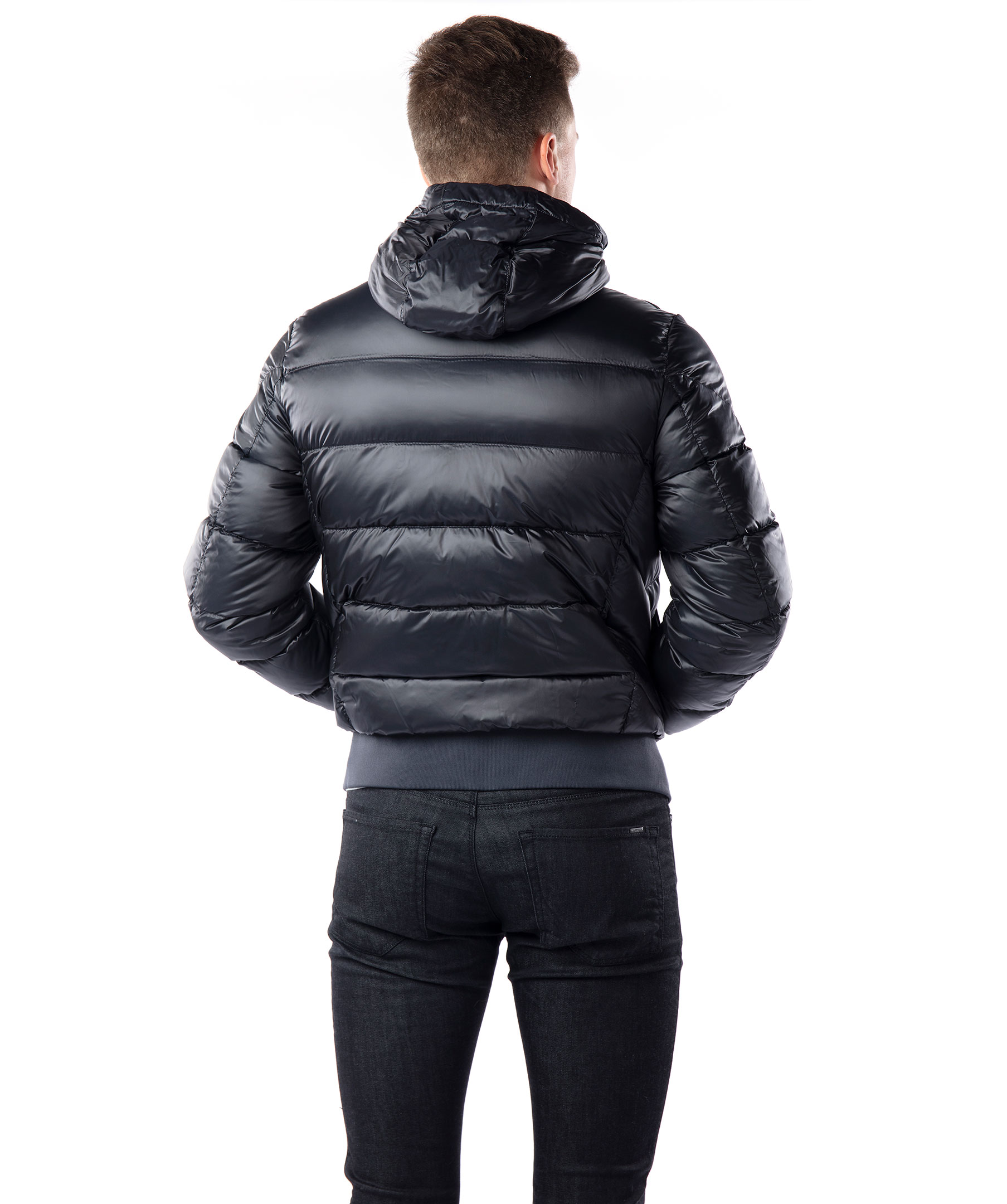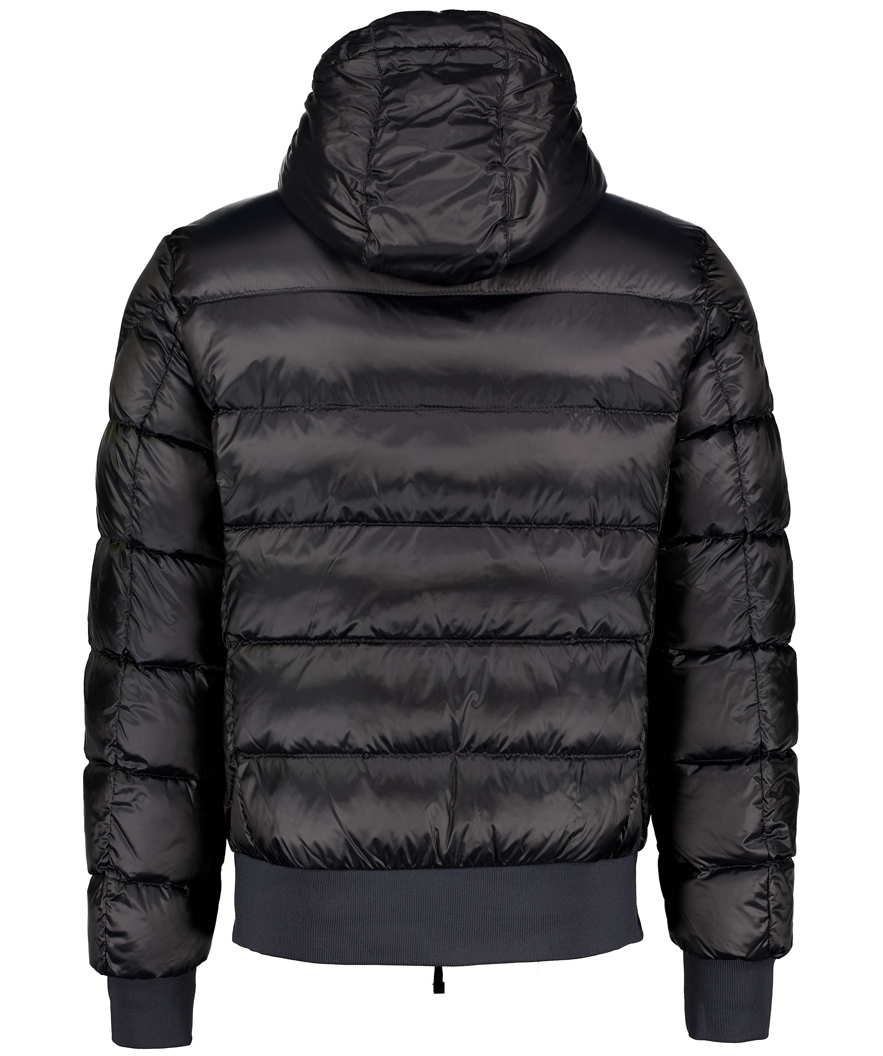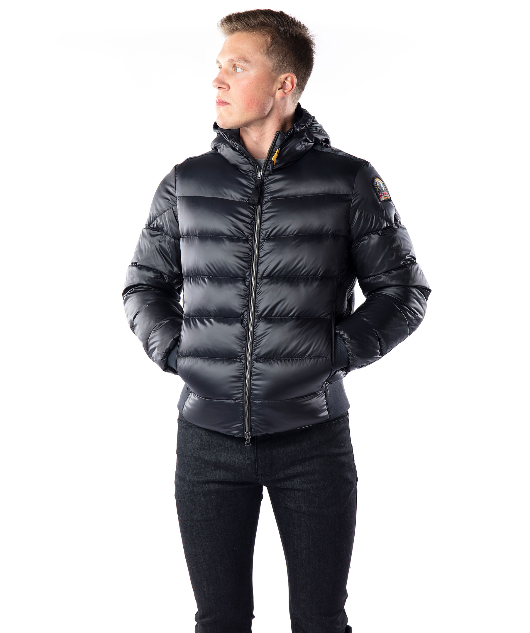 Svart dunjacka från Parajumpers i kort modell. Yttertyg tillverkat i polyester och polyamid och har en glansig finish. Två fickor med dragkedja framtill, två innerfickor, luva med dragsko, hög krage med gult spänne samt broderat patch med logotyp på vänster ärm. Ribbstickade muddar vid ärm och plaggslut. Modellen är 190 cm lång och bär storlek M.