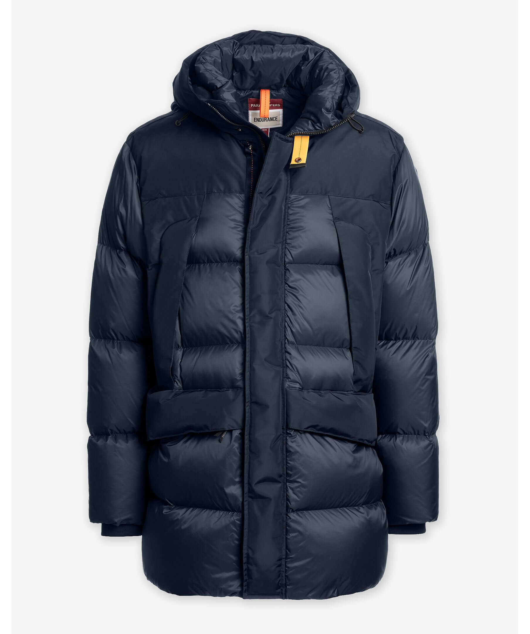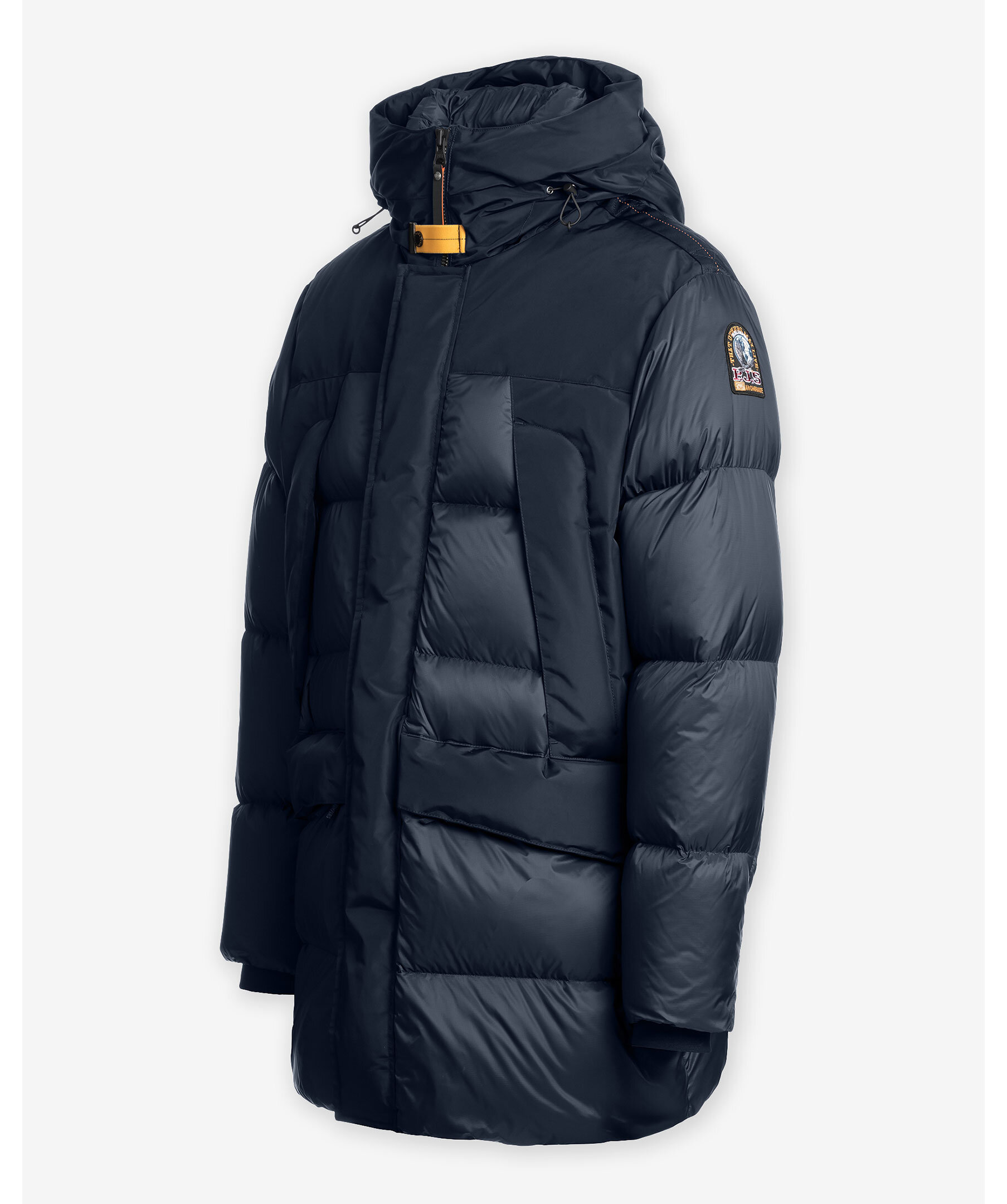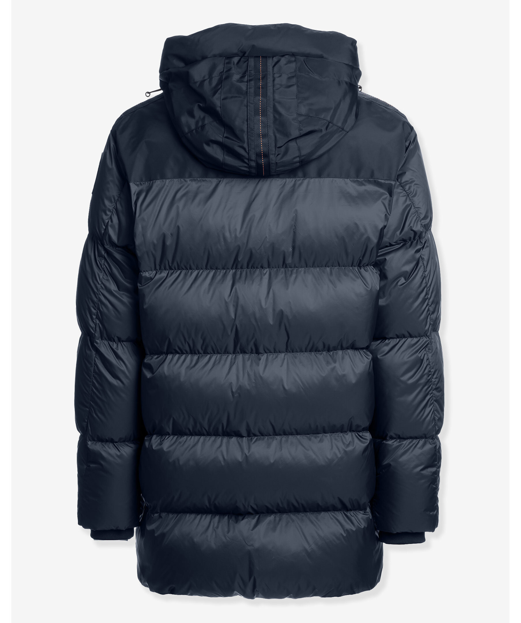 Mörkblå dunjacka från Parajumpers. Jackan är gjord i ett slitstarkt Cordura nylon-ripstop med vattenavvisande behandling av ytan. Justerbar huva och fåll, tvåvägsdragkedja med stormknäppning, och praktisk mängd av ytter- och innerfickor gör den idealisk för kalla, blöta förhållanden.