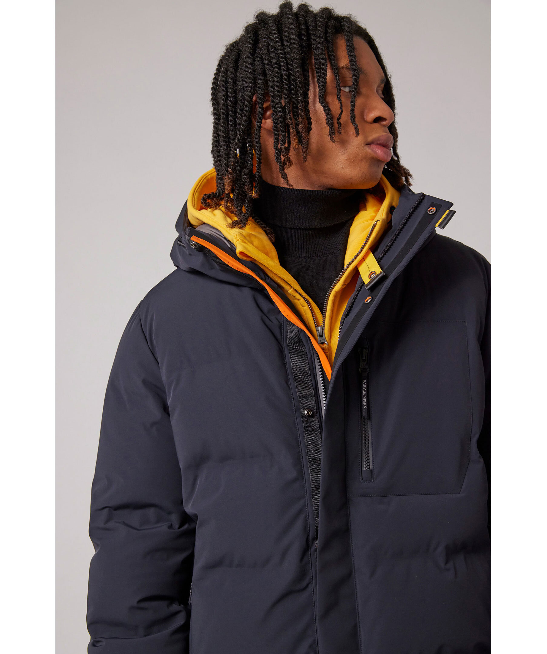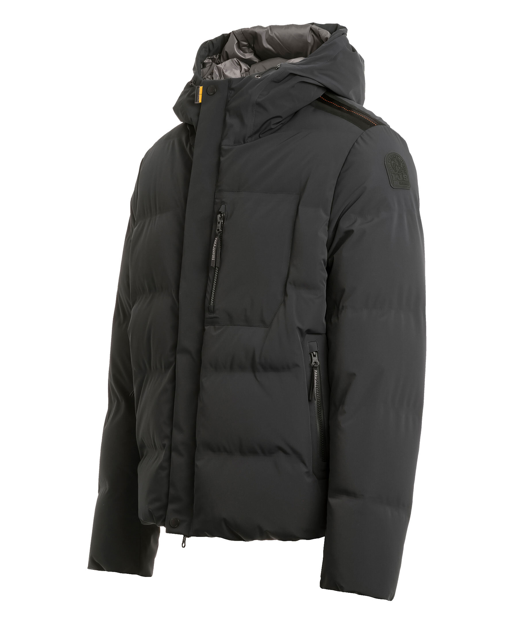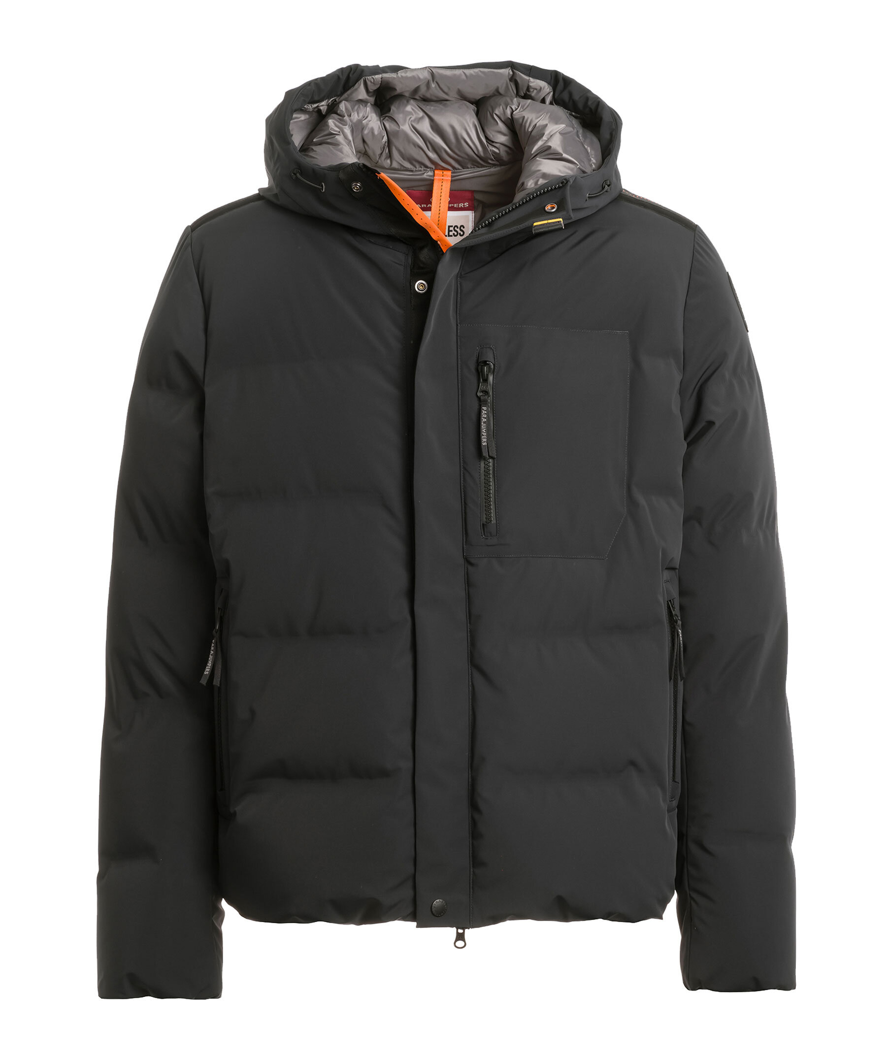 Svart jacka från Parajumpers. Jackan stängs med dold tvåvägsdragkedja och tryckknappar. Den har huva med dragsko, två sidfickor med dragkedja samt en bröstficka med dragkedja och en innerficka med dragkedja. Gummerad logotyp på vänster ärm. Tillverkad i en polyamid- och polyesterblandning. ■ OBS! Modellbilderna visar endast passform.