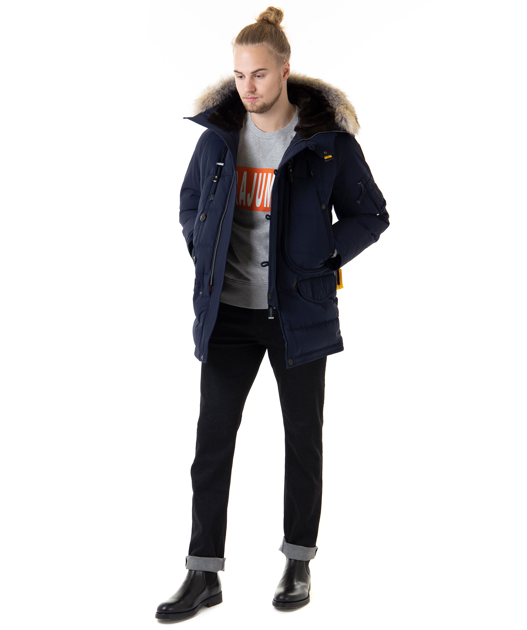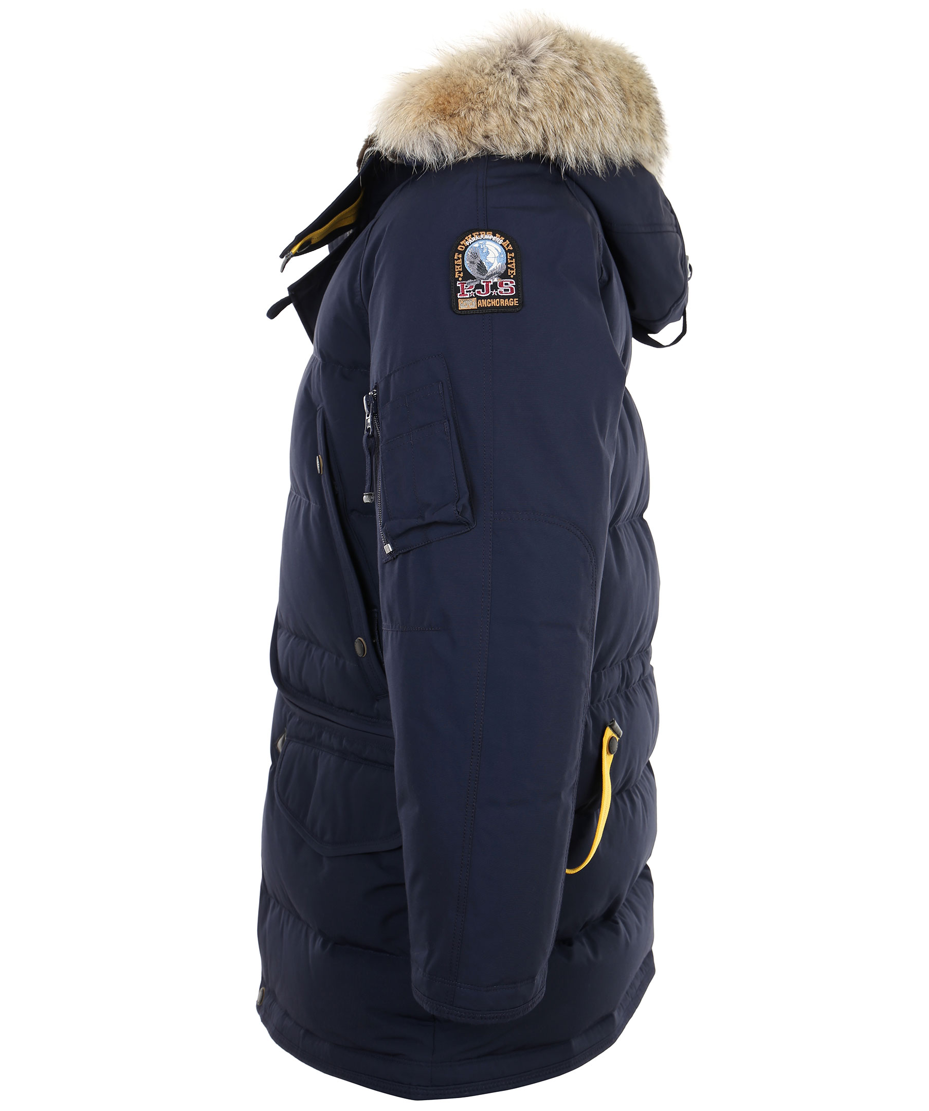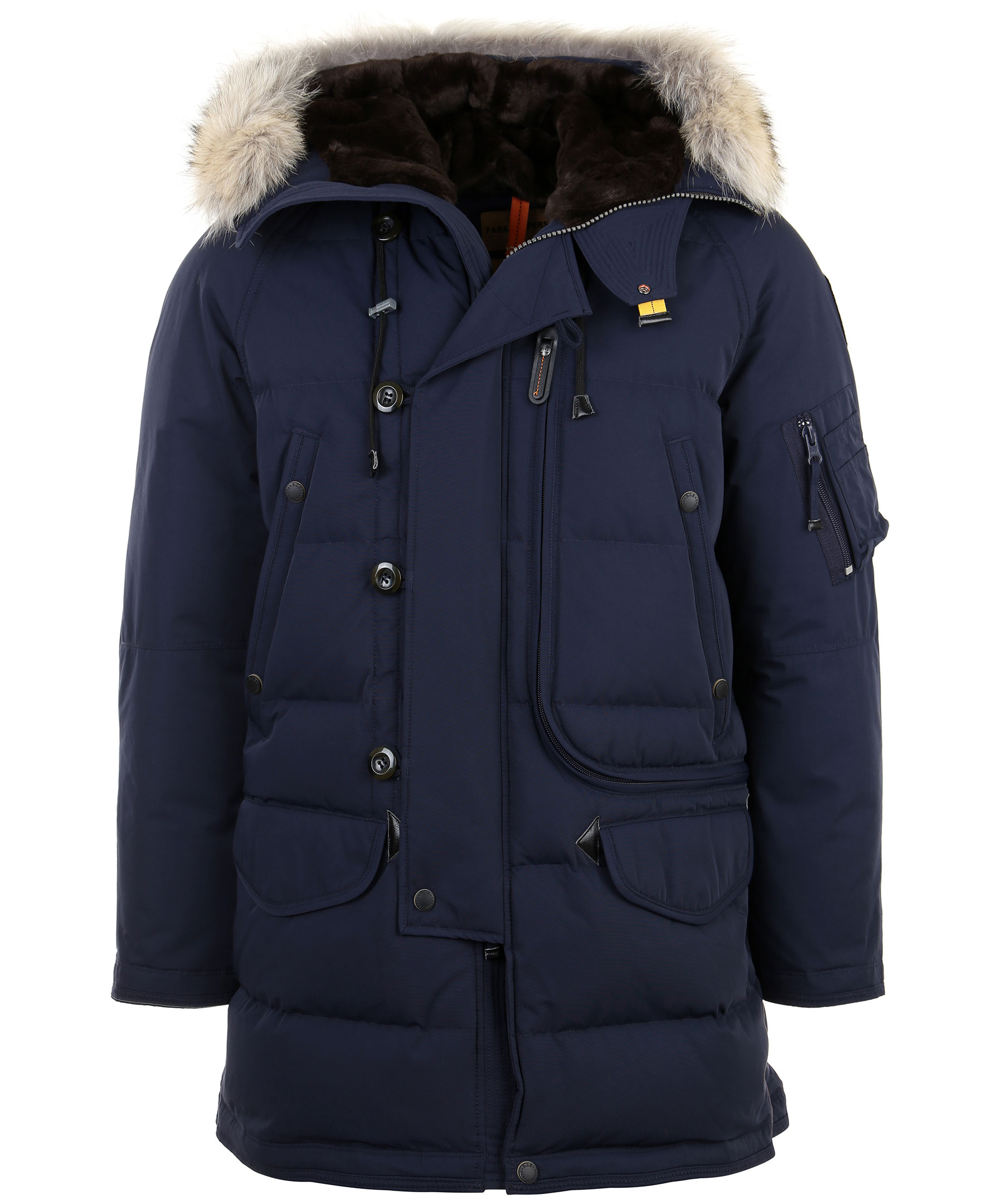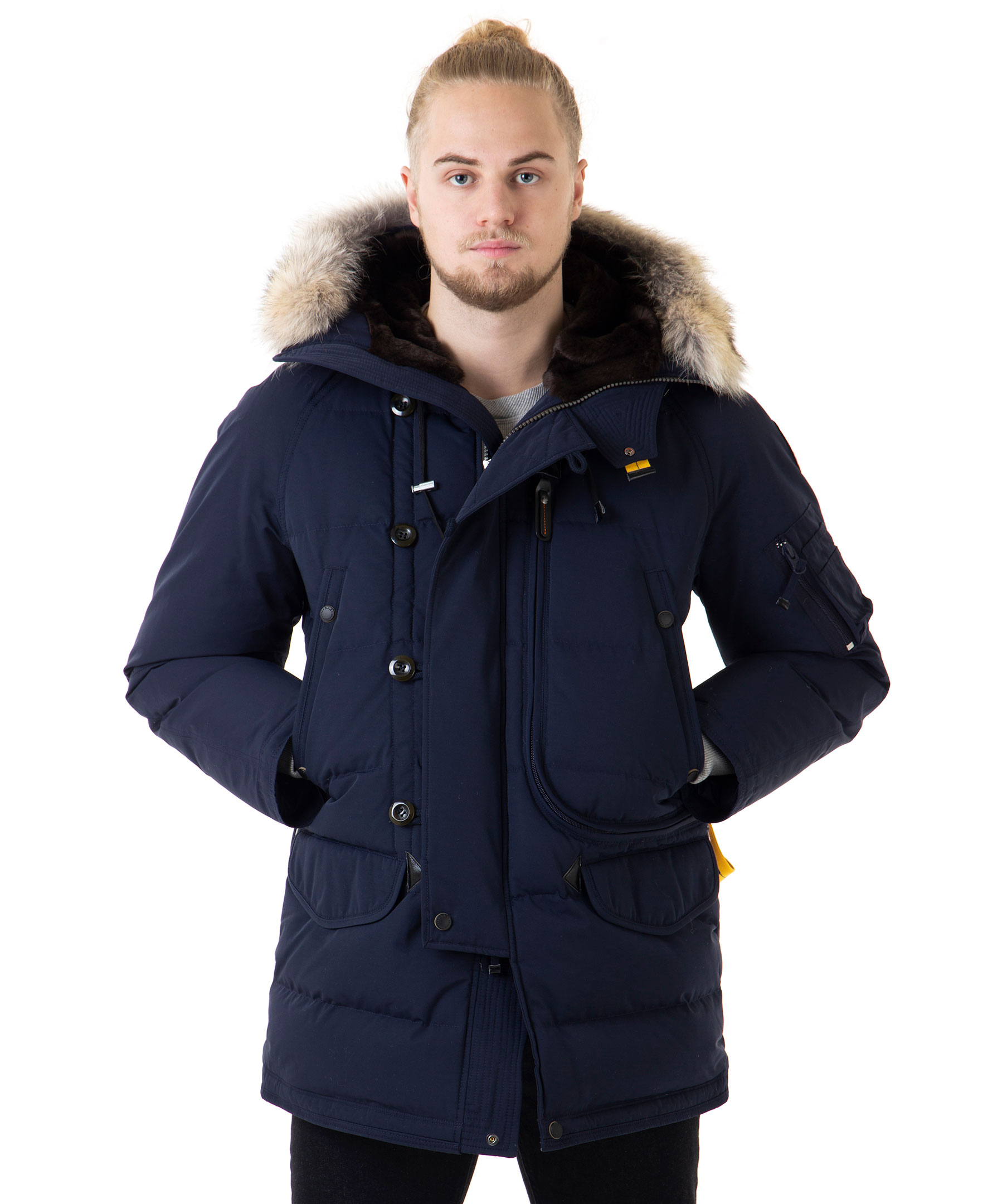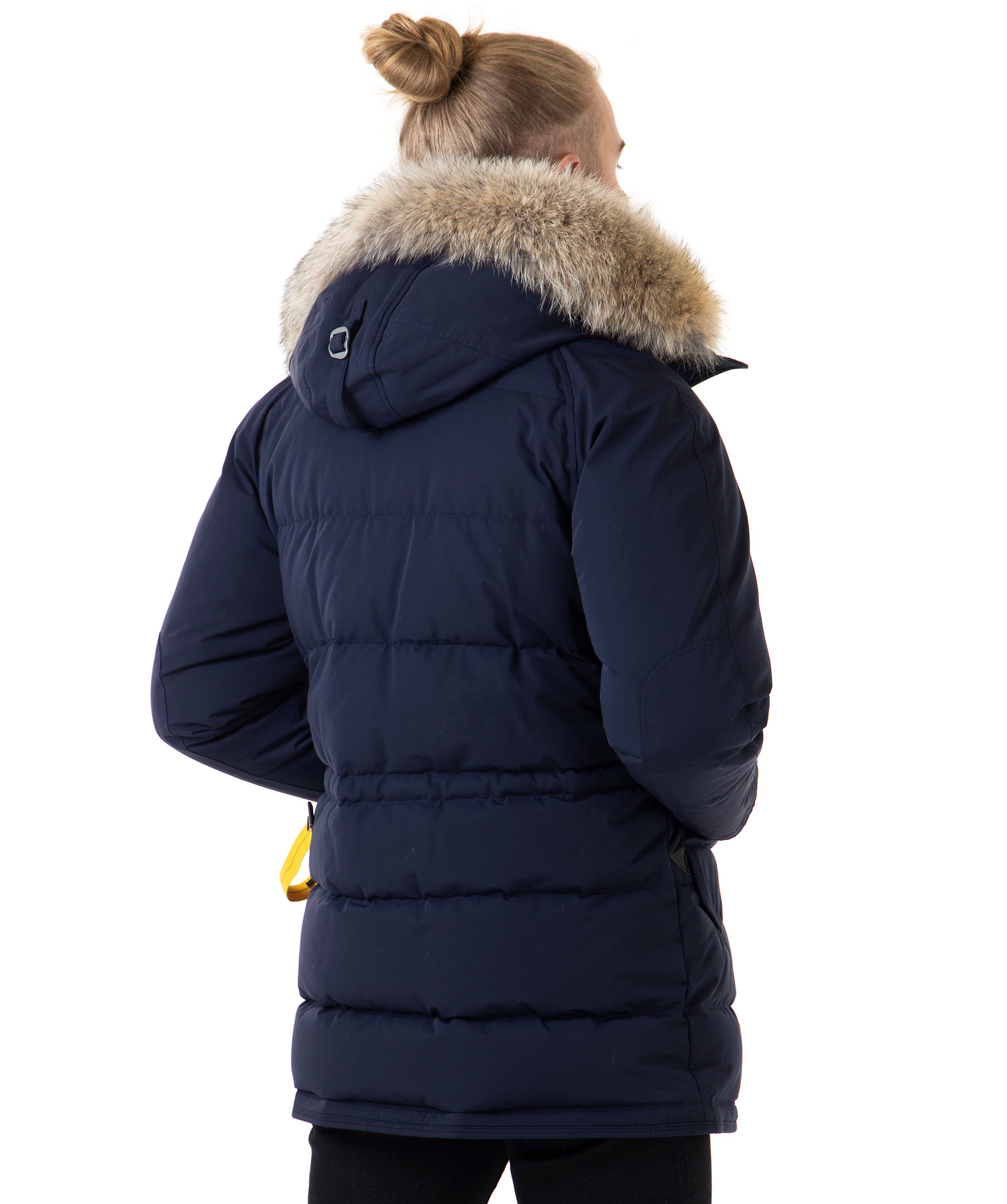 Mörkblå dunjacka från Parajumpers med ett yttertyg av polyamid och bomull. Jackan har fem praktiska fickor fram, en smart ficka på vänster ärm samt tre innerfickor. Reglerbar luva fodrad i brun syntetpäls samt avtagbar krage i naturpäls. Jackan stängs med dragkedja samt grova knappar. Broderad logotyp på vänster ärm och dragsko i midjan. Modellen är 186 cm lång och bär storlek M. TIPS! Ånga pälsen för att få den stor och fluffig.