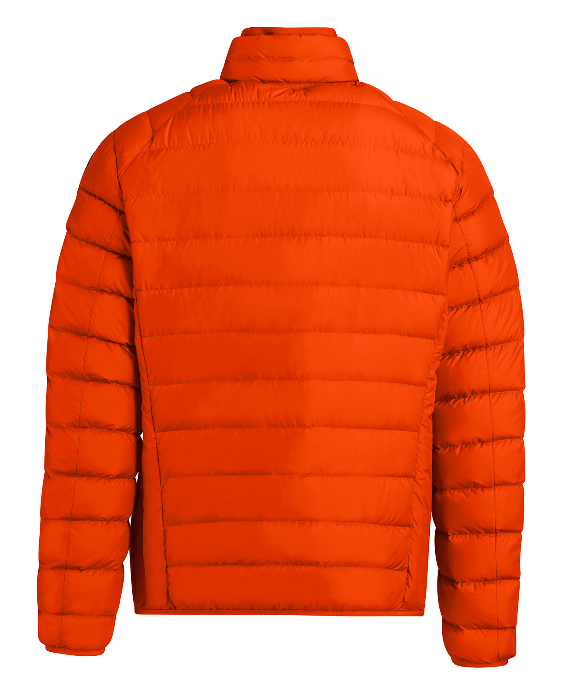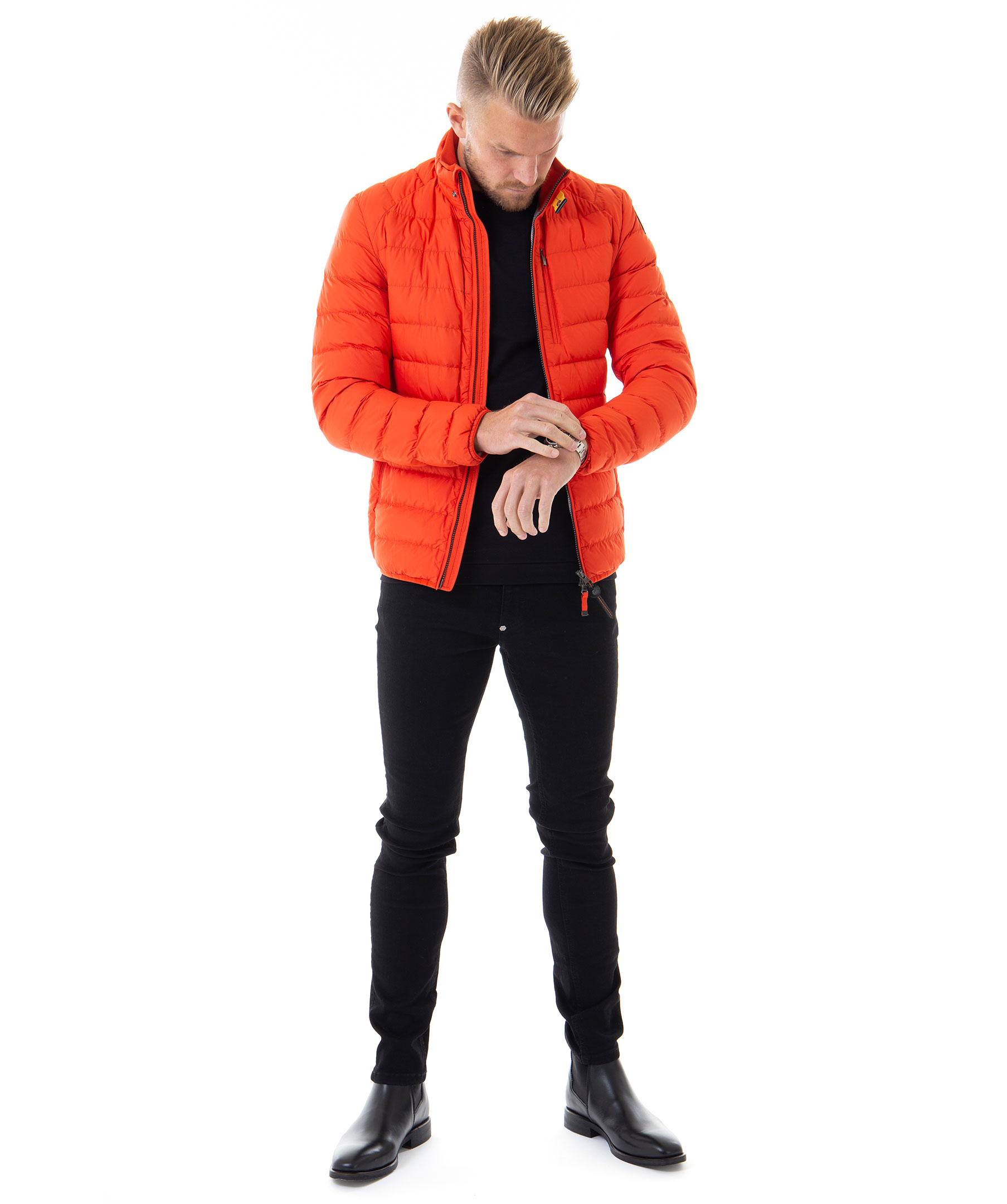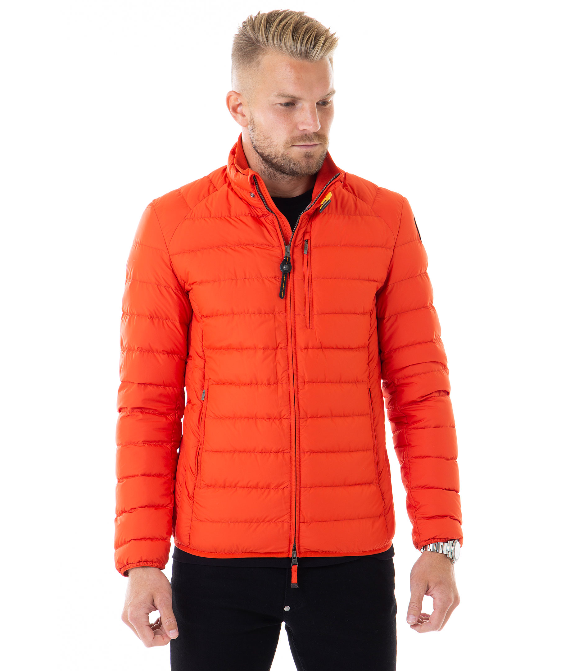 Orange lättviktsdunjacka från Parajumpers. Kort modell med en hög krage. Broderad logotyp på vänstra ärmens axel. Två fickor nedtill och en ficka upptill vid bröstet. Både jackan och fickorna stängs med dragkedja. Modellen är 188 cm lång och bär storlek M.