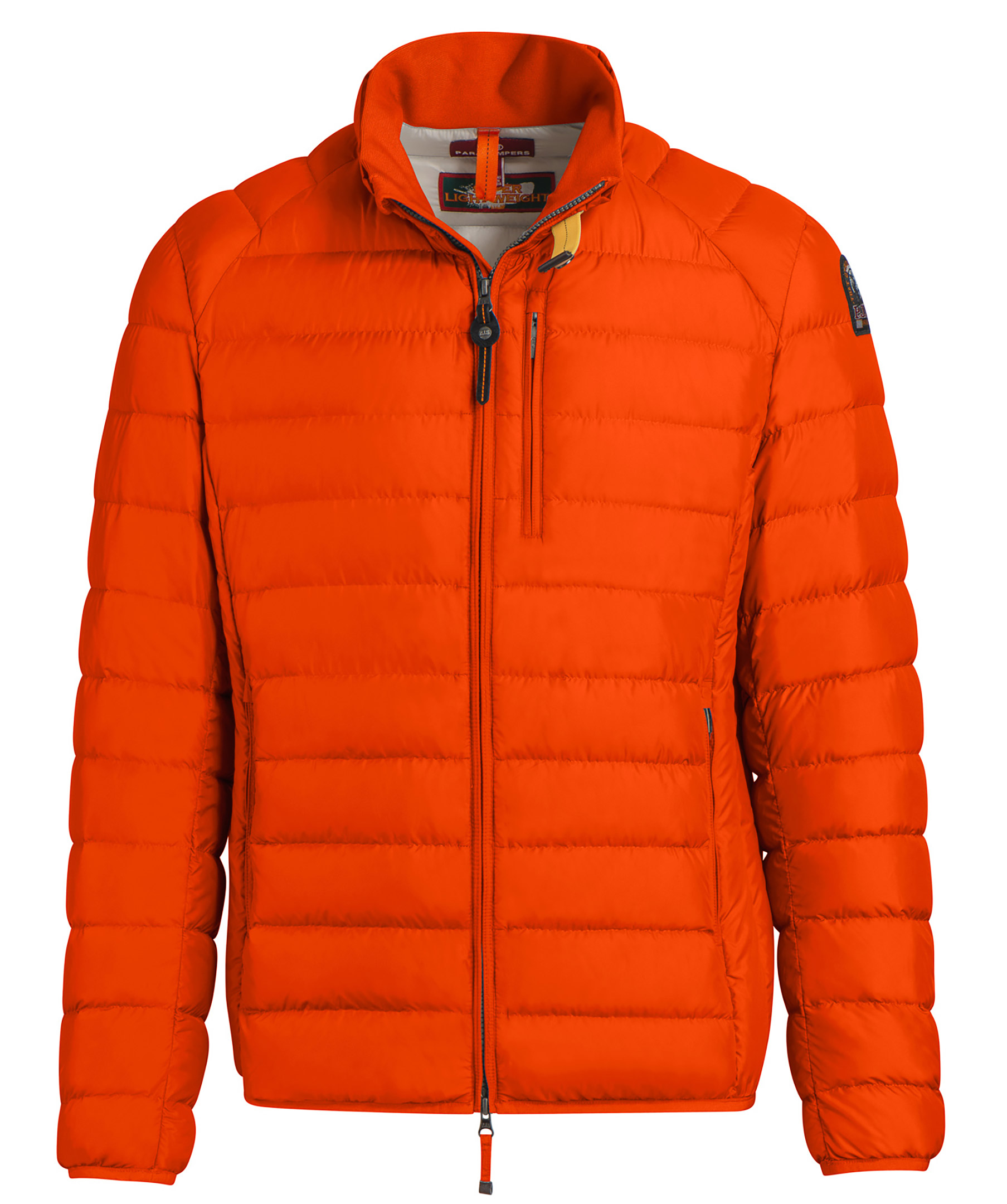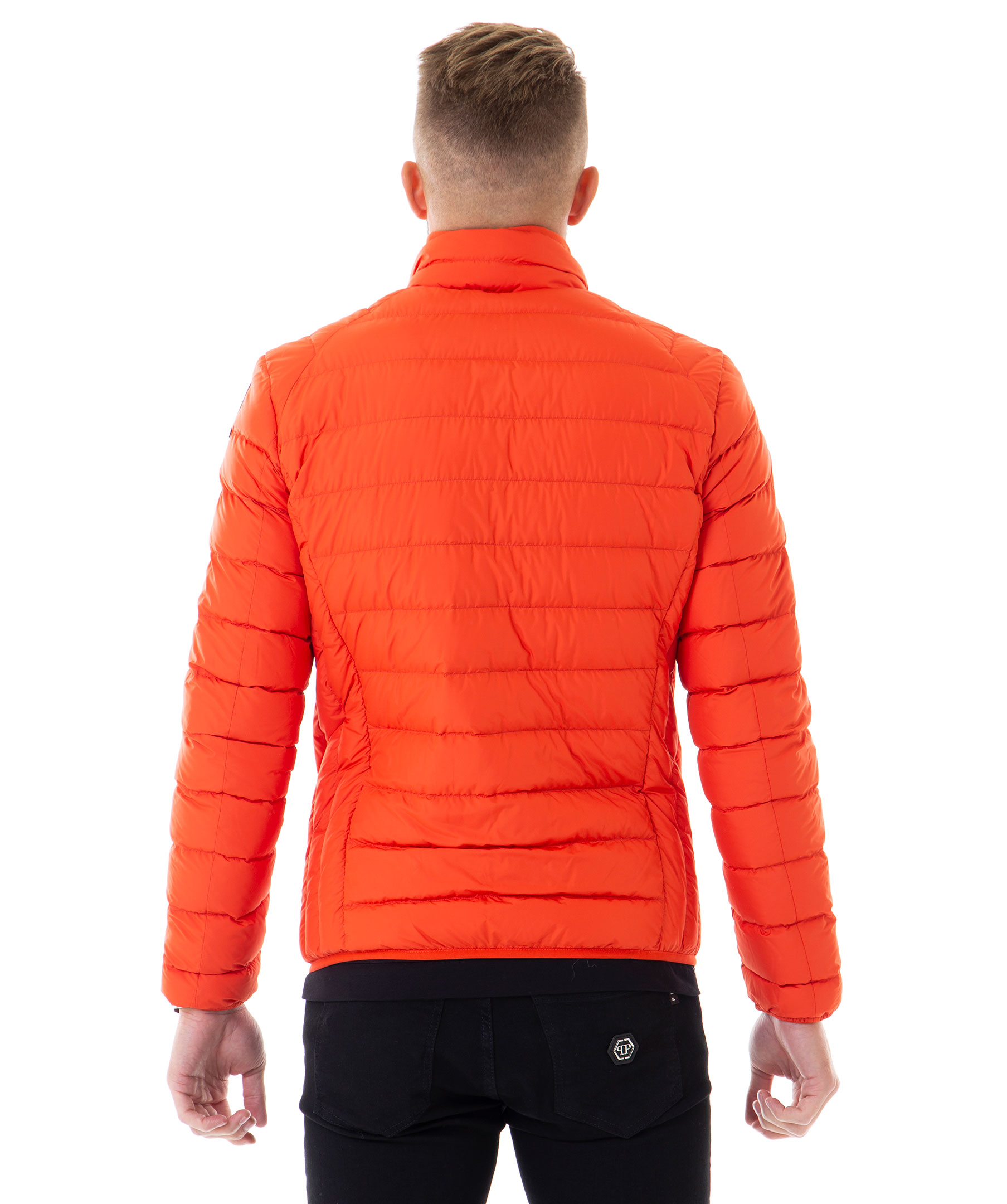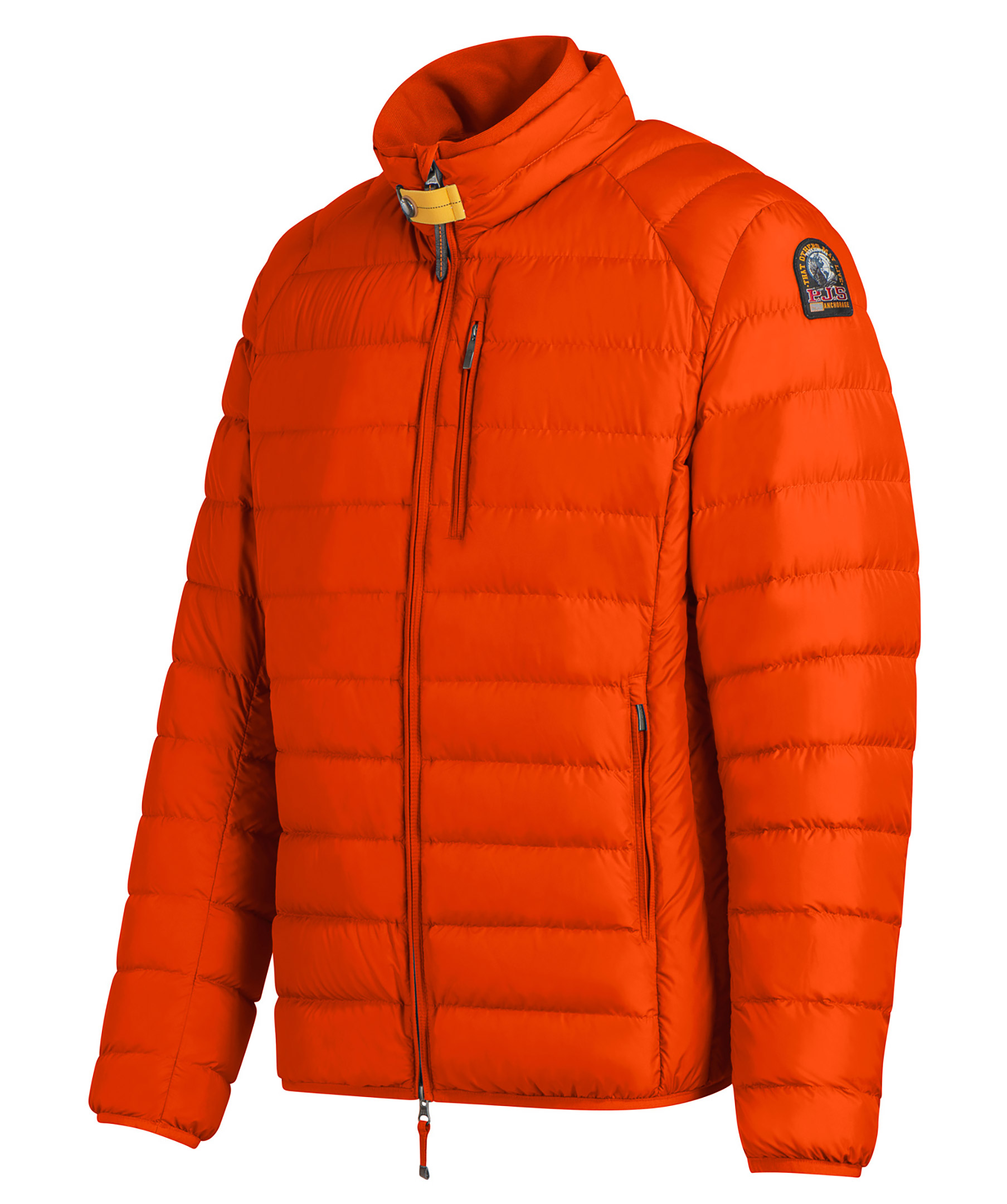 Orange lättviktsdunjacka från Parajumpers. Kort modell med en hög krage. Broderad logotyp på vänstra ärmens axel. Två fickor nedtill och en ficka upptill vid bröstet. Både jackan och fickorna stängs med dragkedja. Modellen är 188 cm lång och bär storlek M.