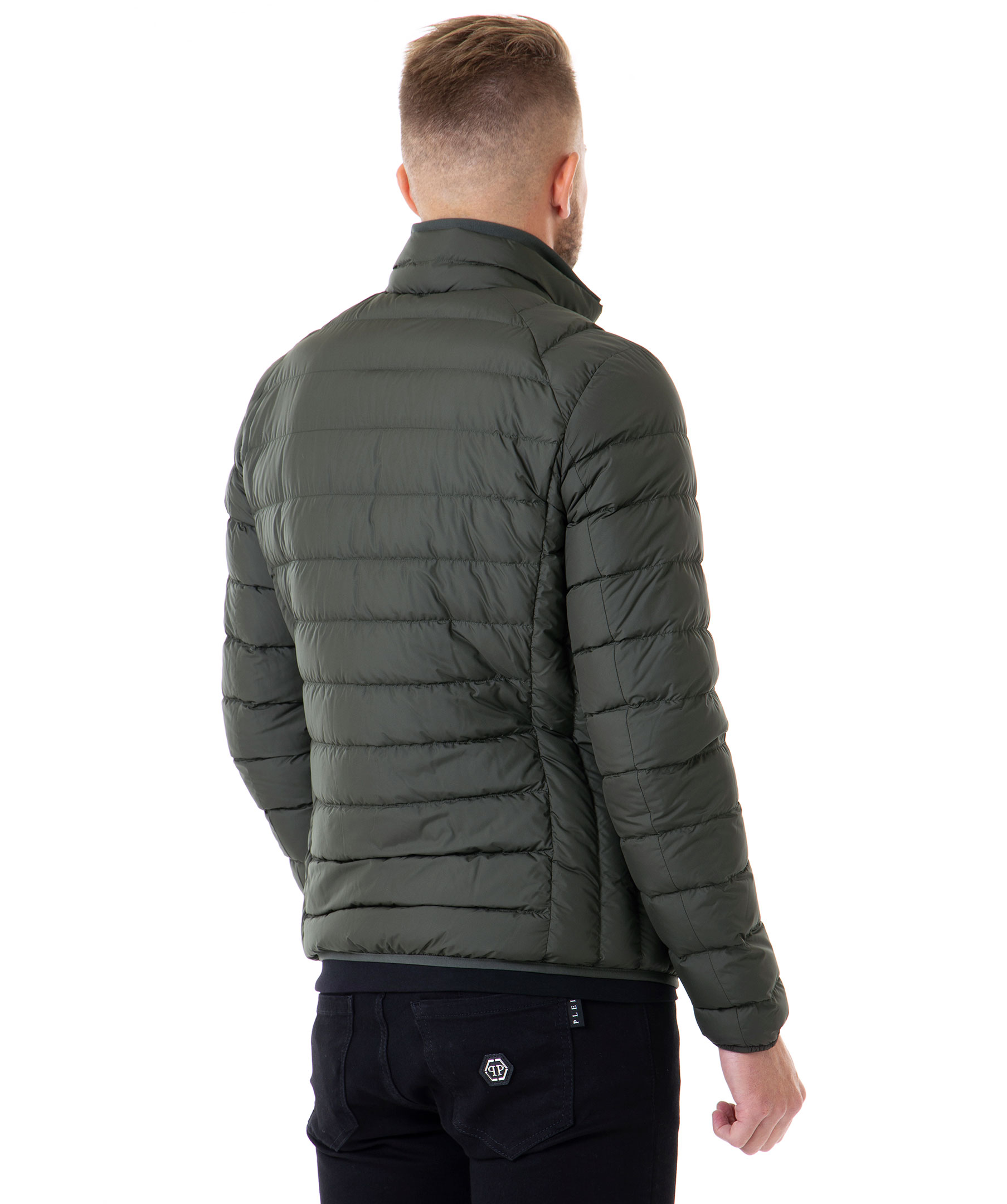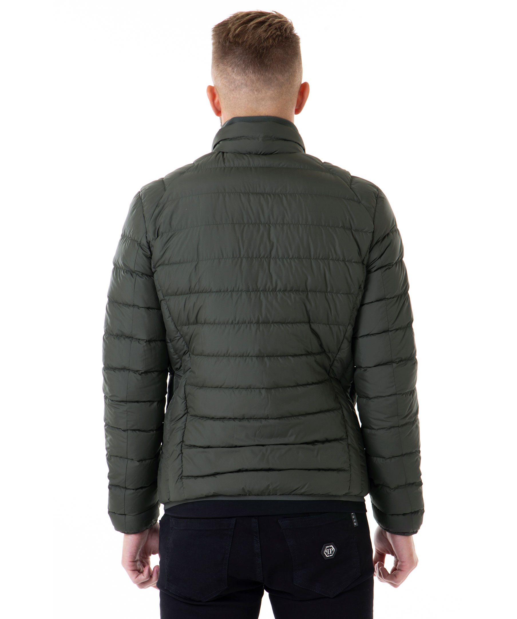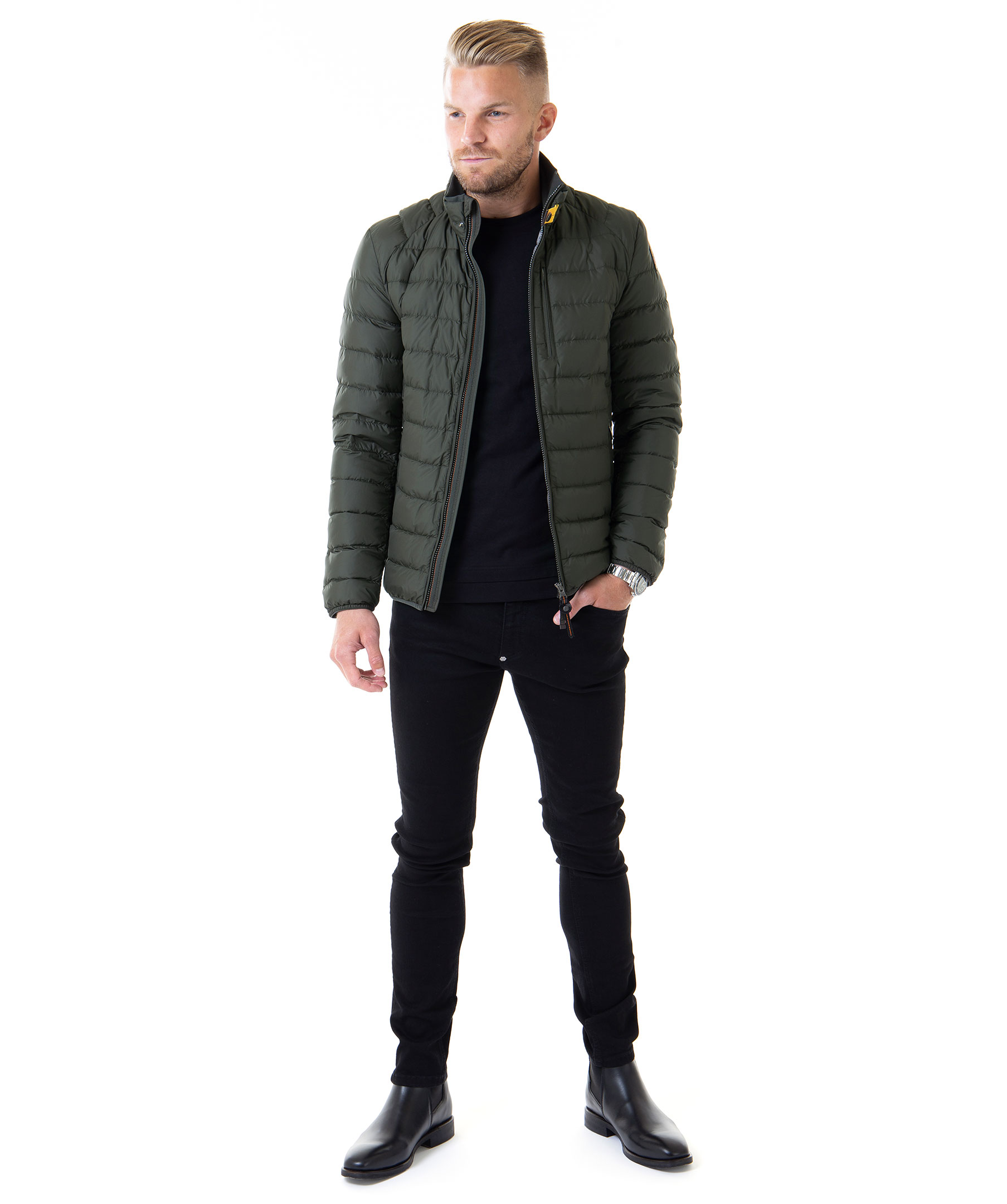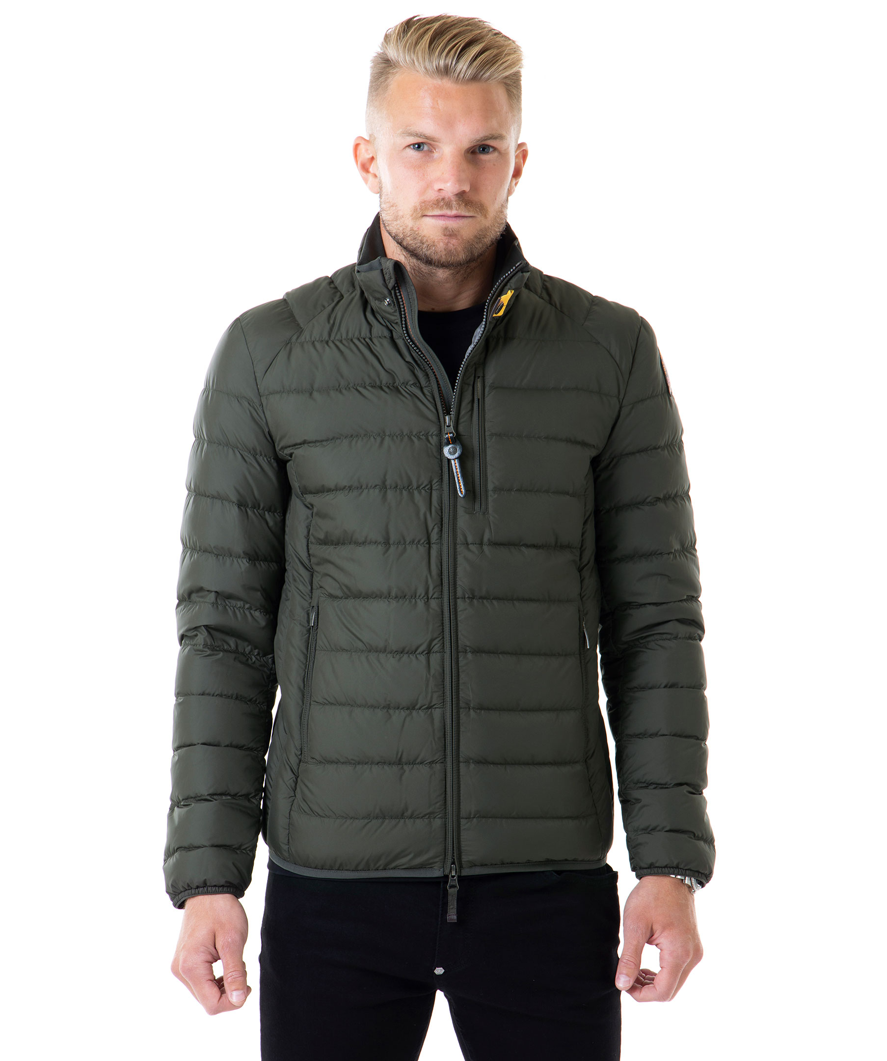 Mörkgrön lättviktsdunjacka från Parajumpers. Kort modell med en hög krage. Broderad logotyp på vänstra ärmens axel. Två fickor nedtill och en ficka upptill vid bröstet. Både jackan och fickorna stängs med dragkedja. Modellen är 188 cm lång och bär storlek M.
